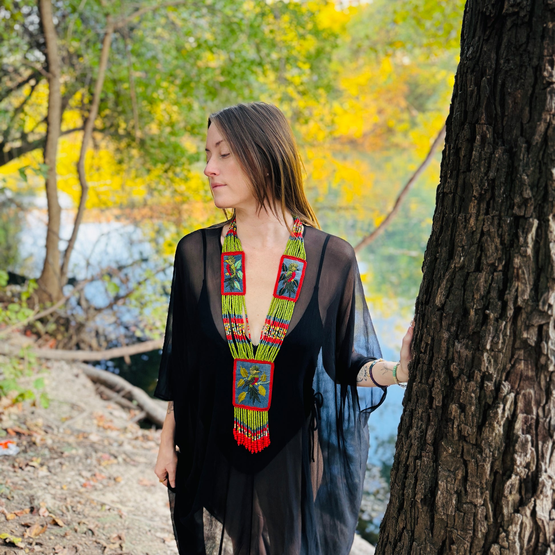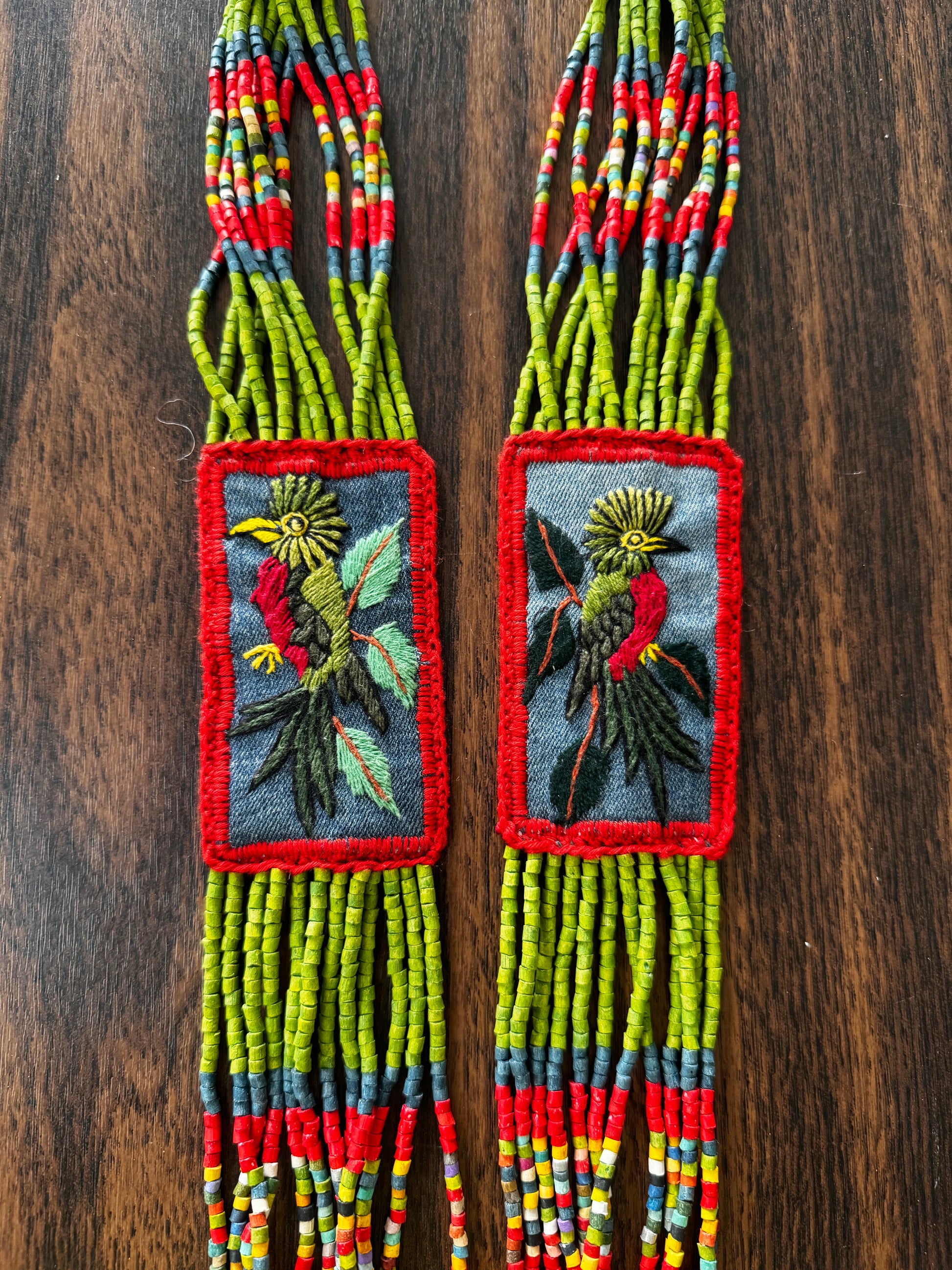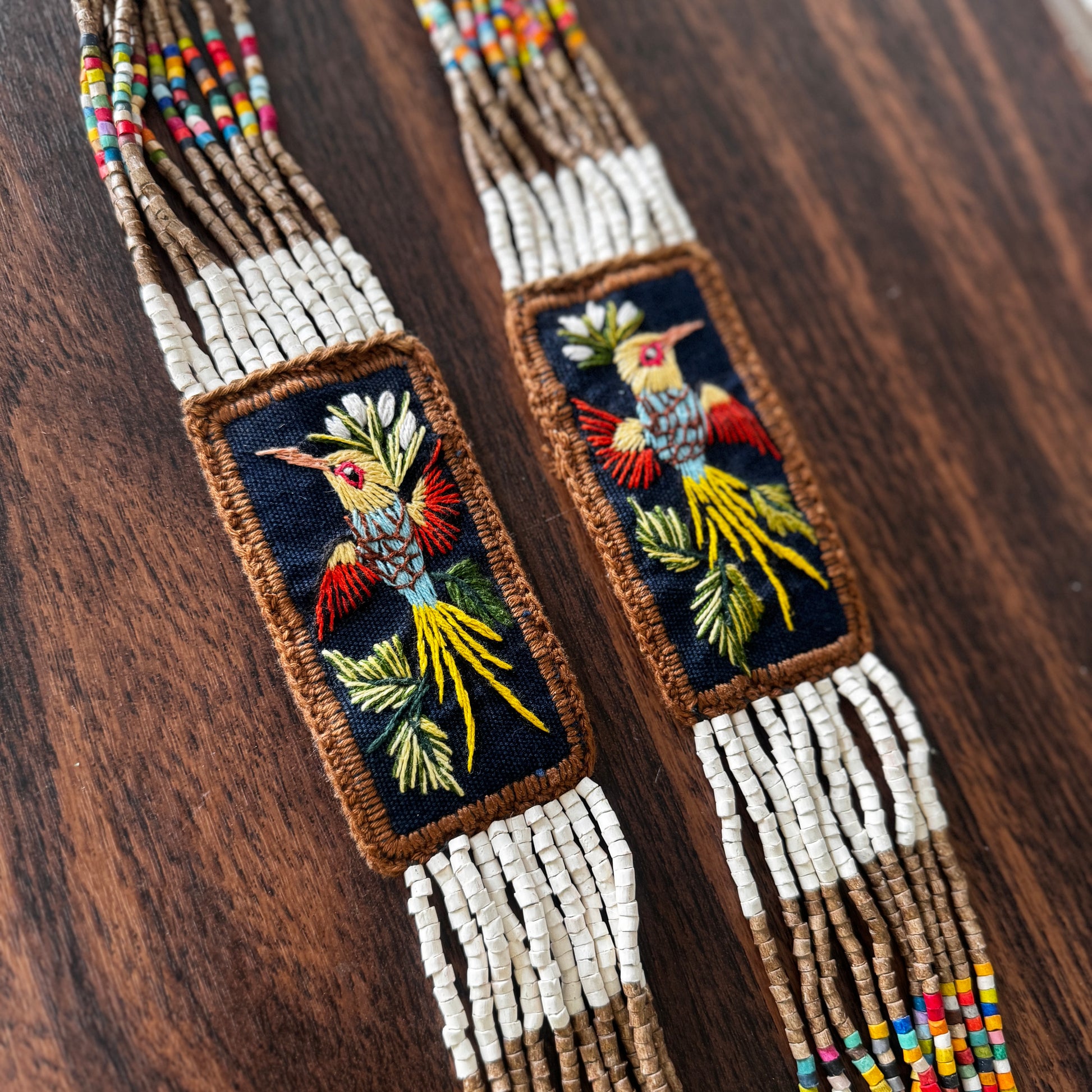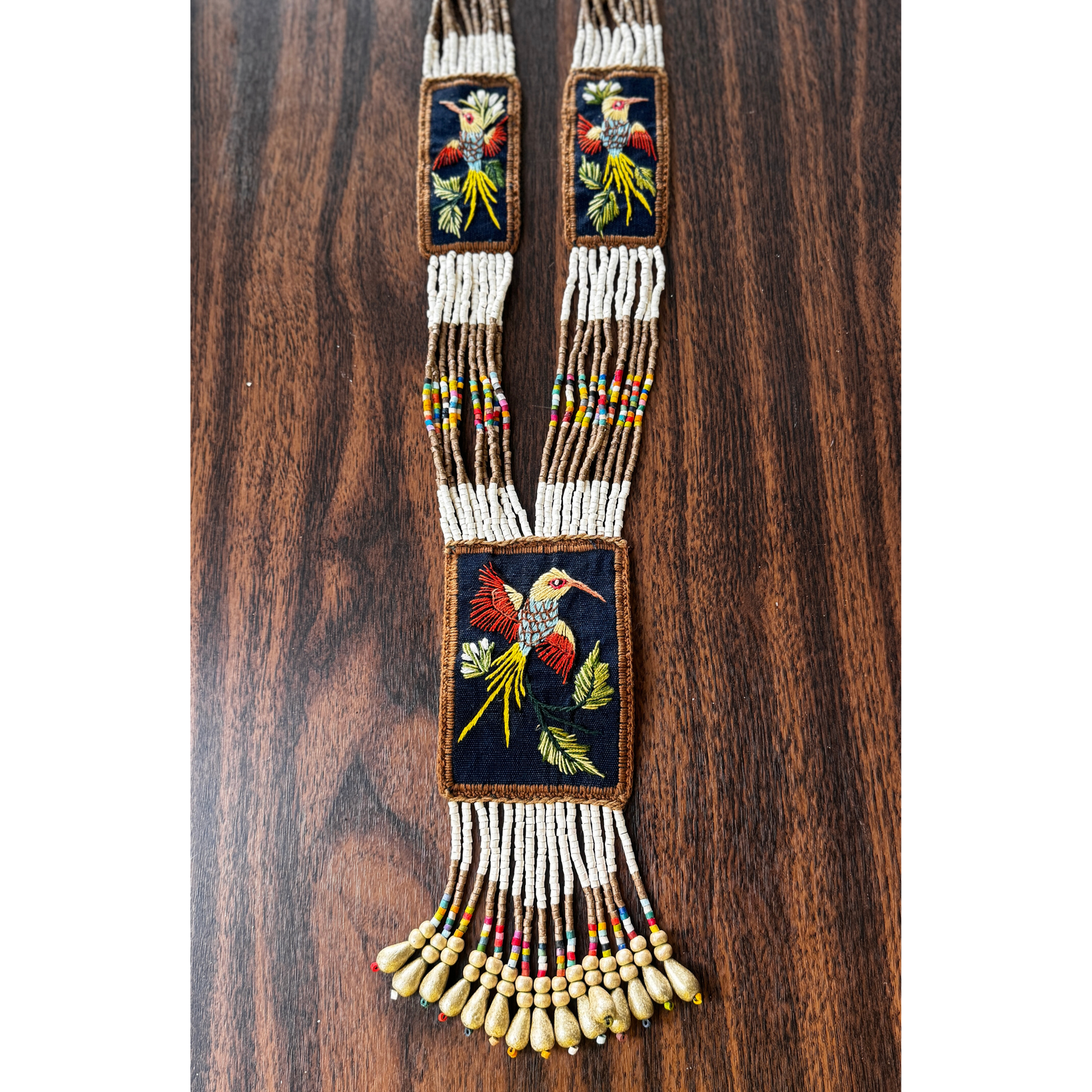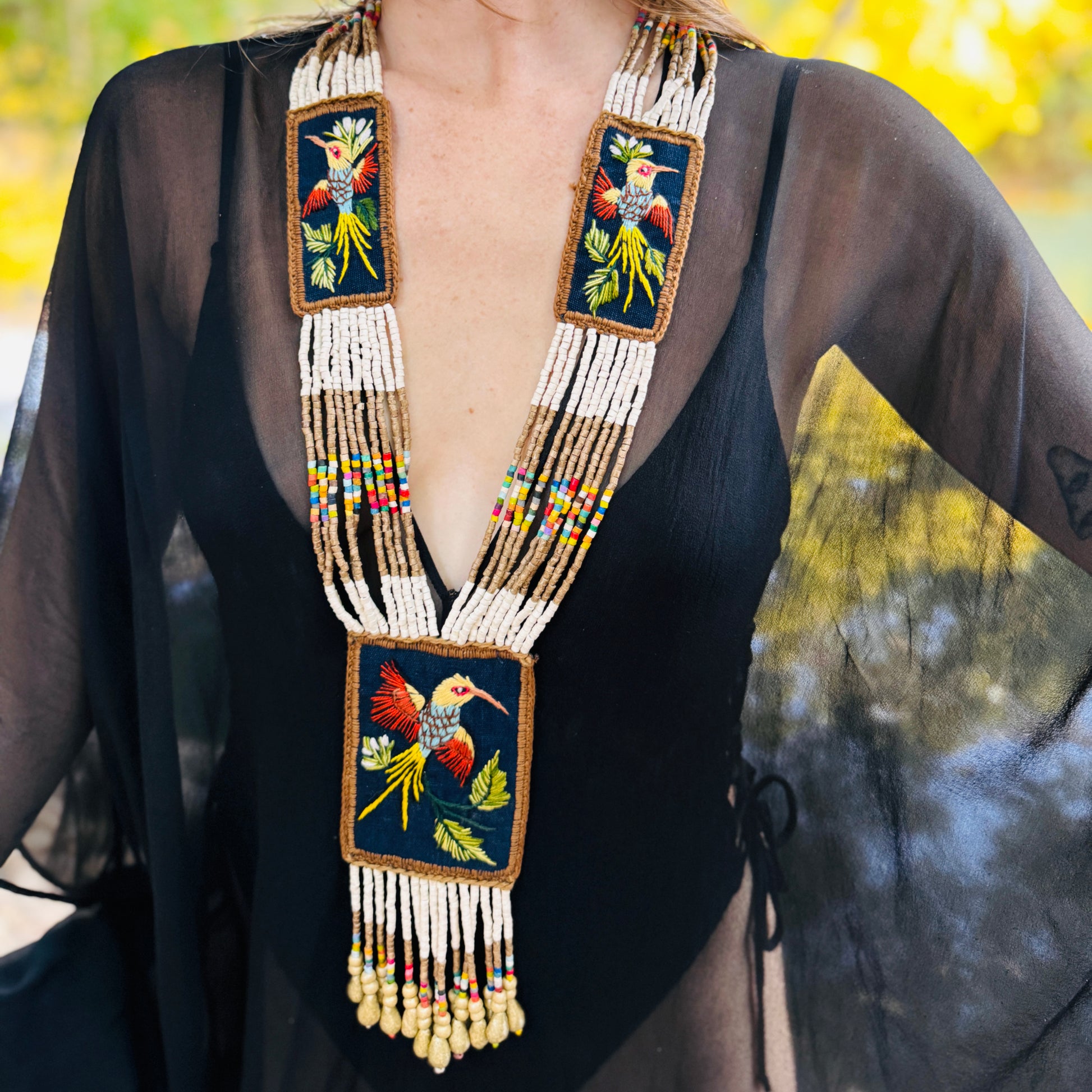 Created using traditional Native American beading and weaving techniques, inspired by Latin American artistry, this special necklace features three, intricately embroidered patches with birds. The three embroidered patches are combined with beaded strands and fringes in the center piece. Supporting Mayan artisans in Guatemala, this small family business of ours celebrates and sustains the rich cultural heritage of these communities.
