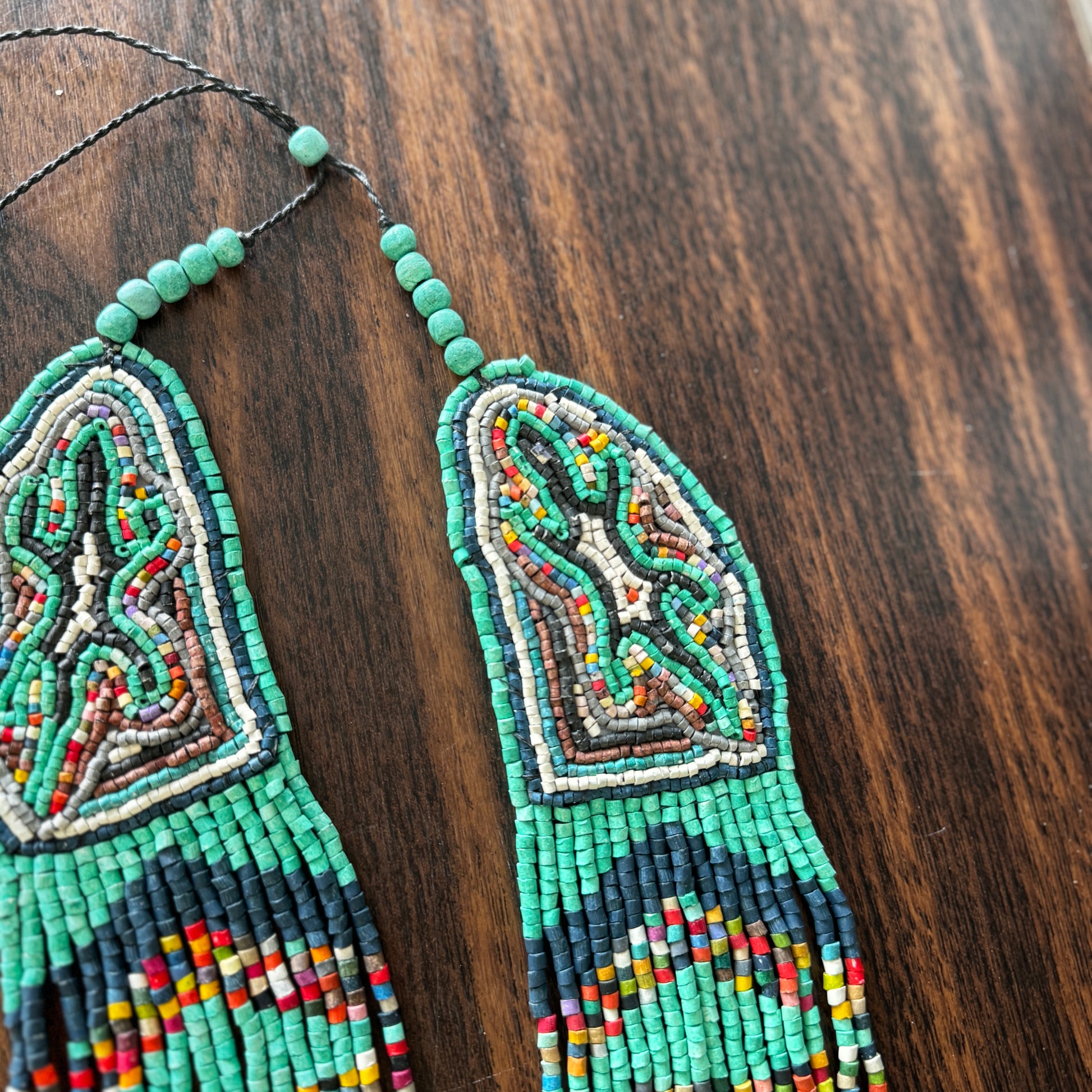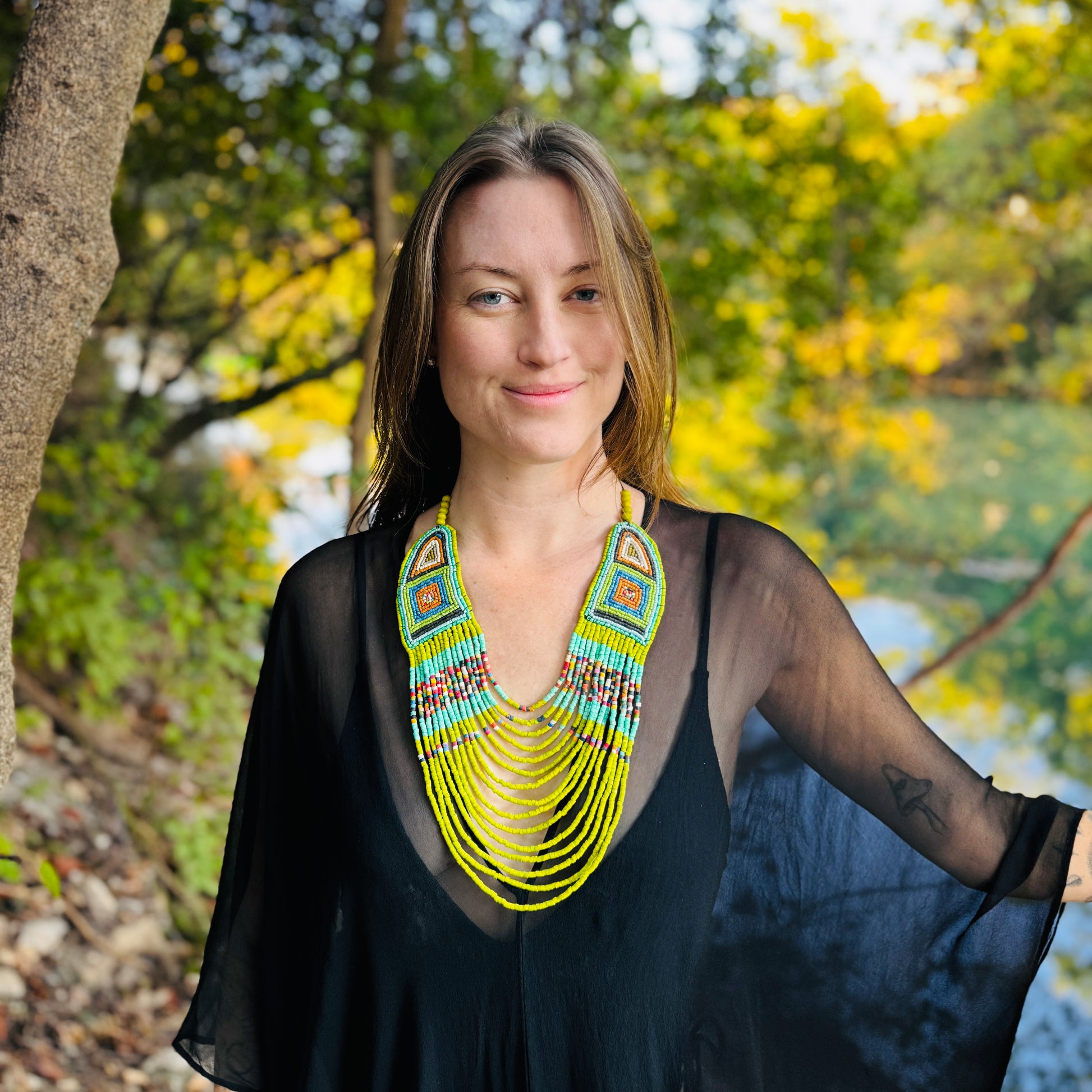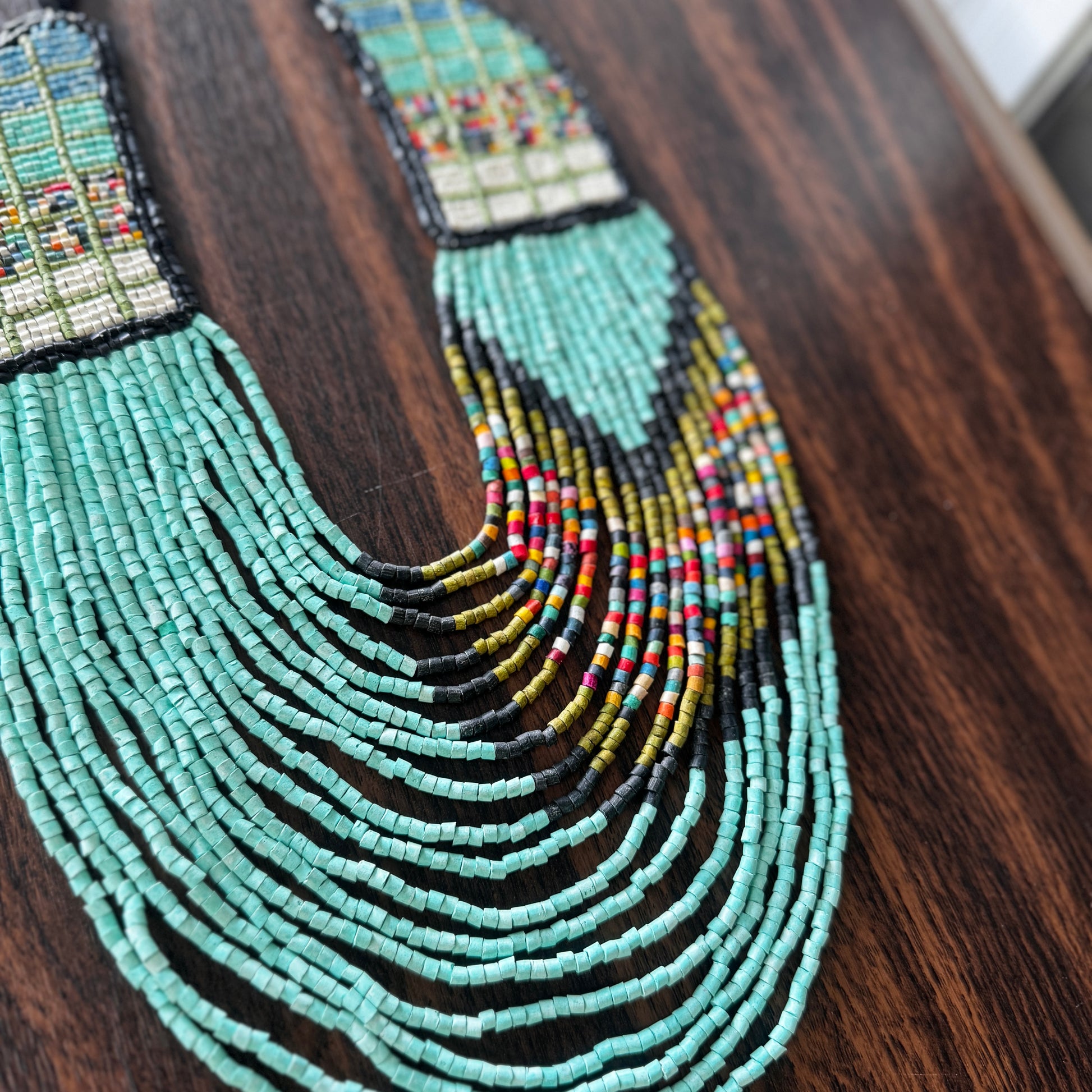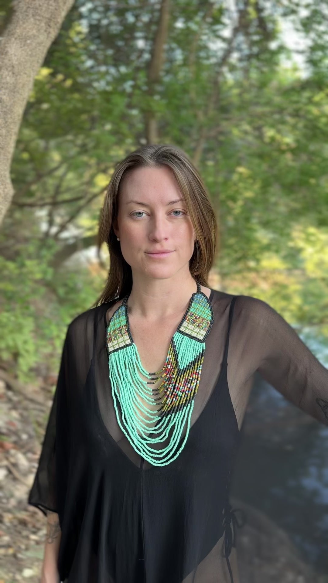 Created using traditional Native American beading techniques and inspired by Latin American artistry, this special necklace features two beaded embroidery patches combined with beaded strands in a mesmerizing design. Supporting Mayan artisans in Guatemala, this small family business of ours celebrates and sustains the rich cultural heritage of these communities.