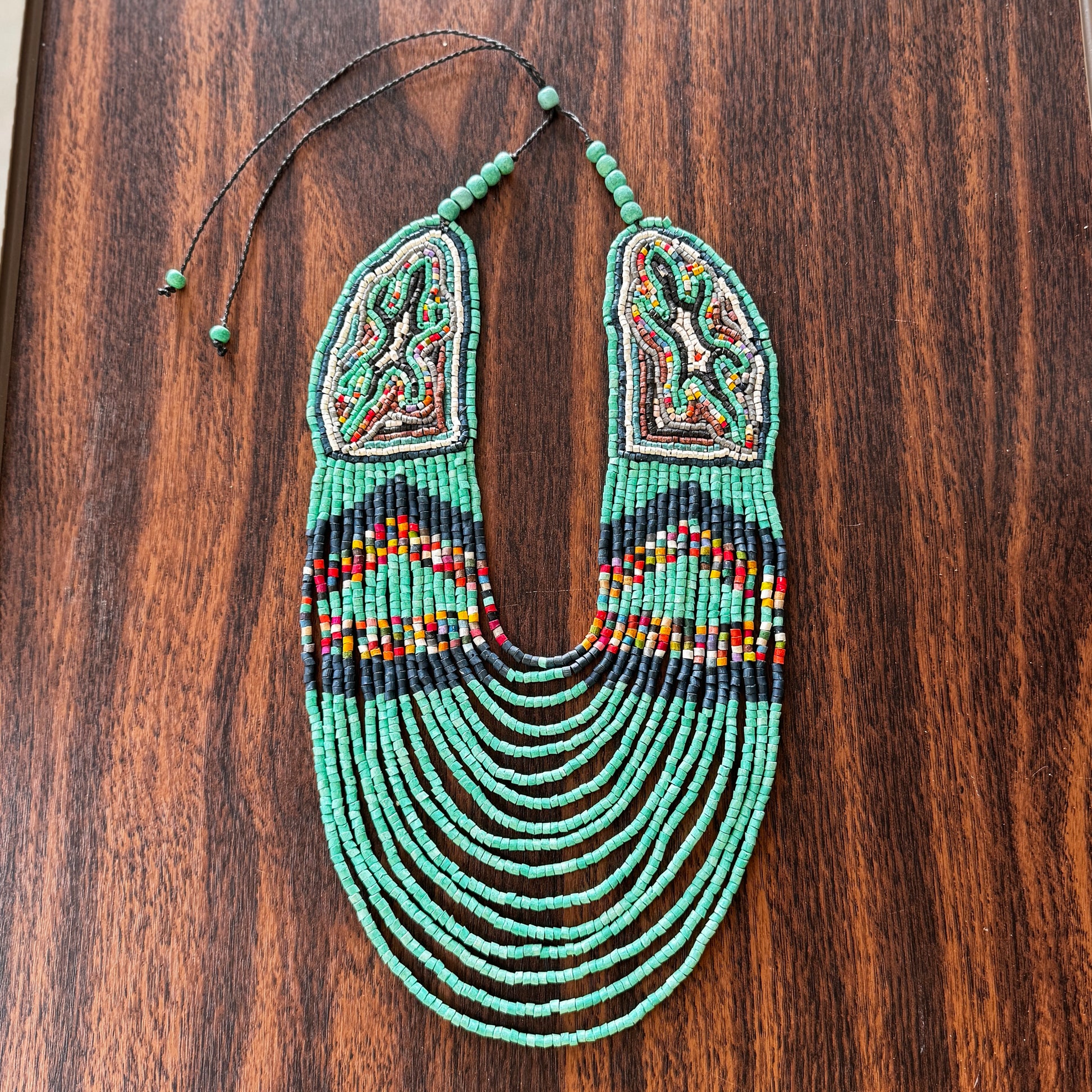 Discover the beauty of handmade jewelry with our ceremonial necklaces, a fusion of timeless elegance and cultural heritage. Each unique piece showcases artisanal beadwork and highlights the intricate craftsmanship of Mayan-made jewelry, blending beaded patches with meticulously arranged beads for a stunning statement piece.