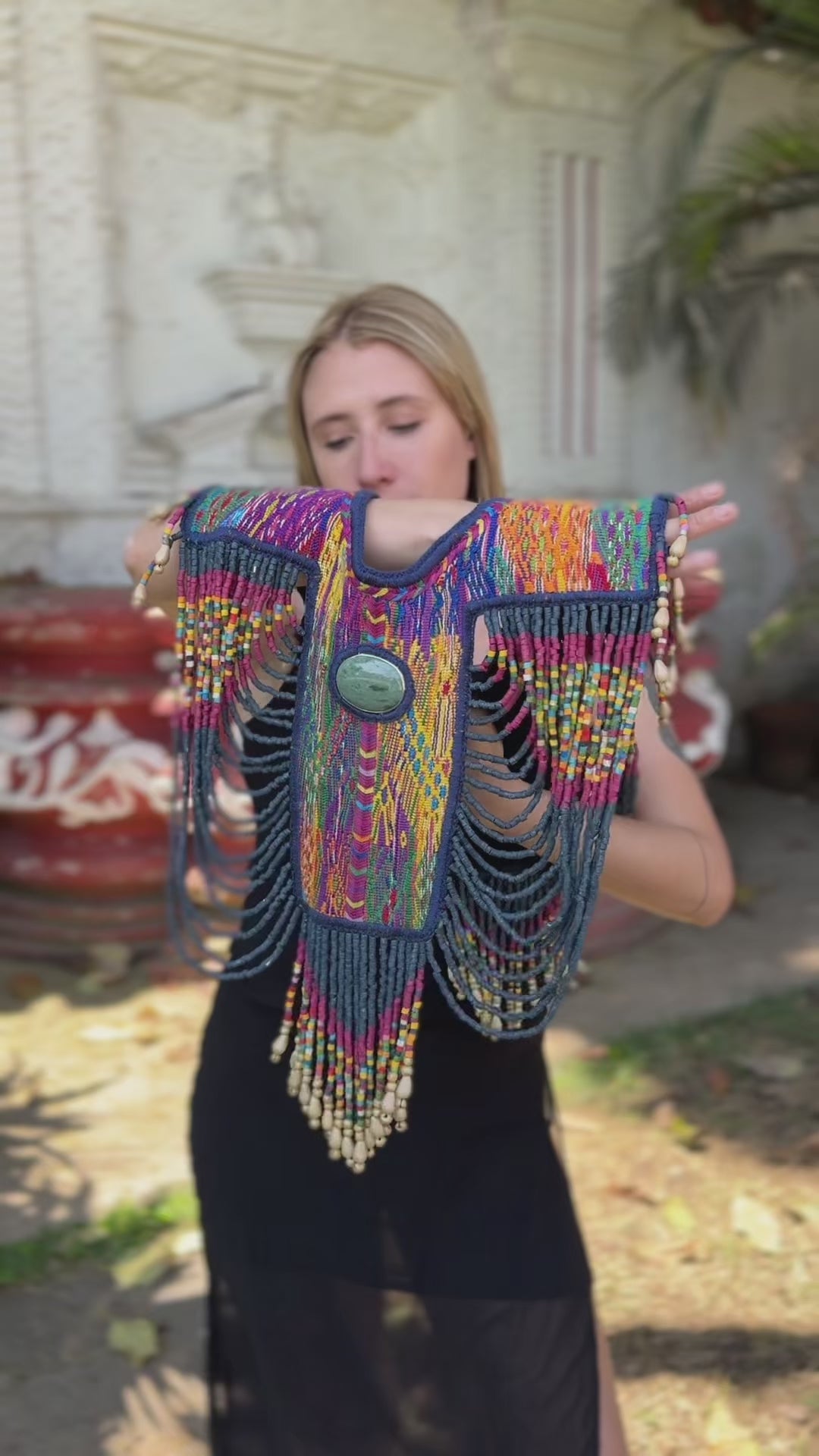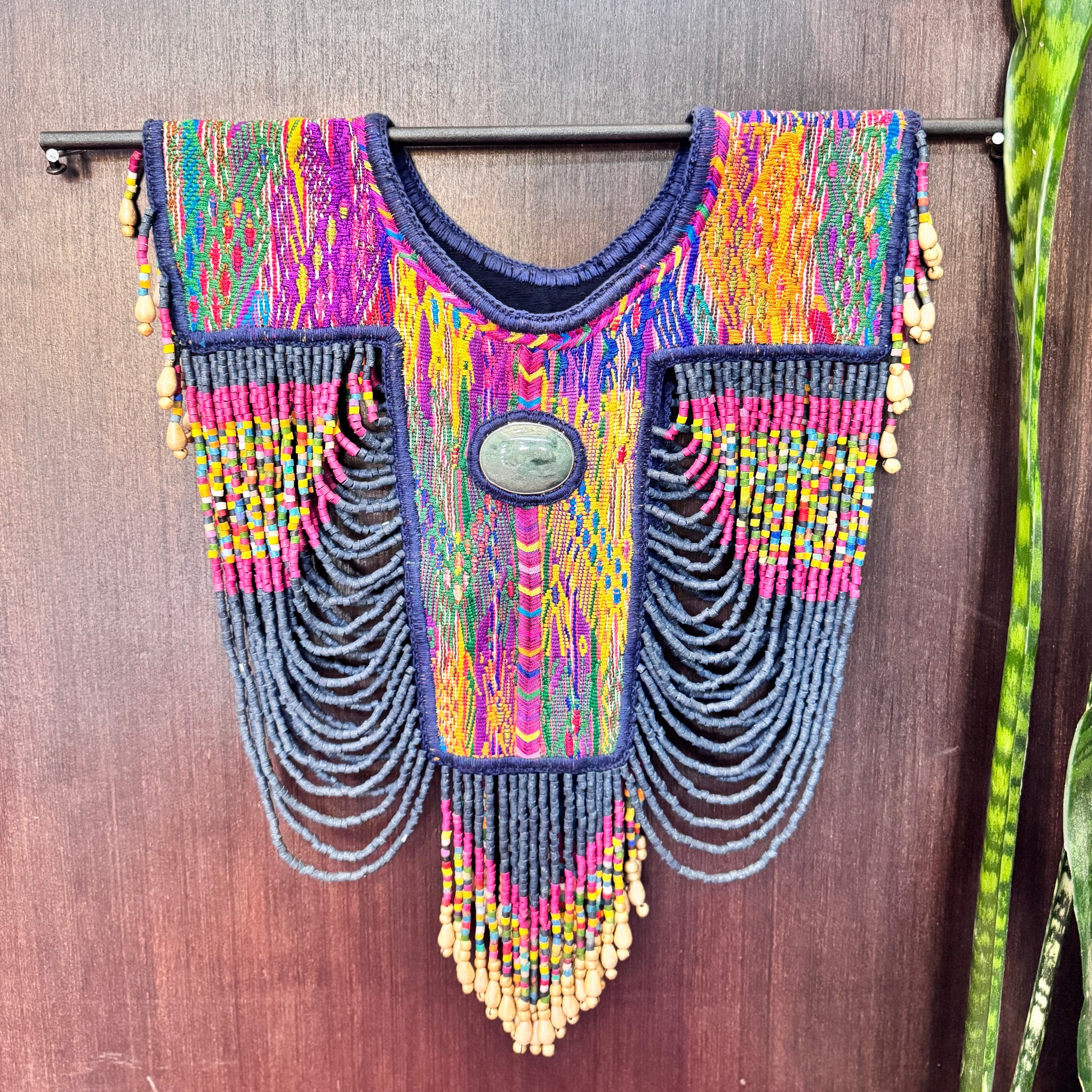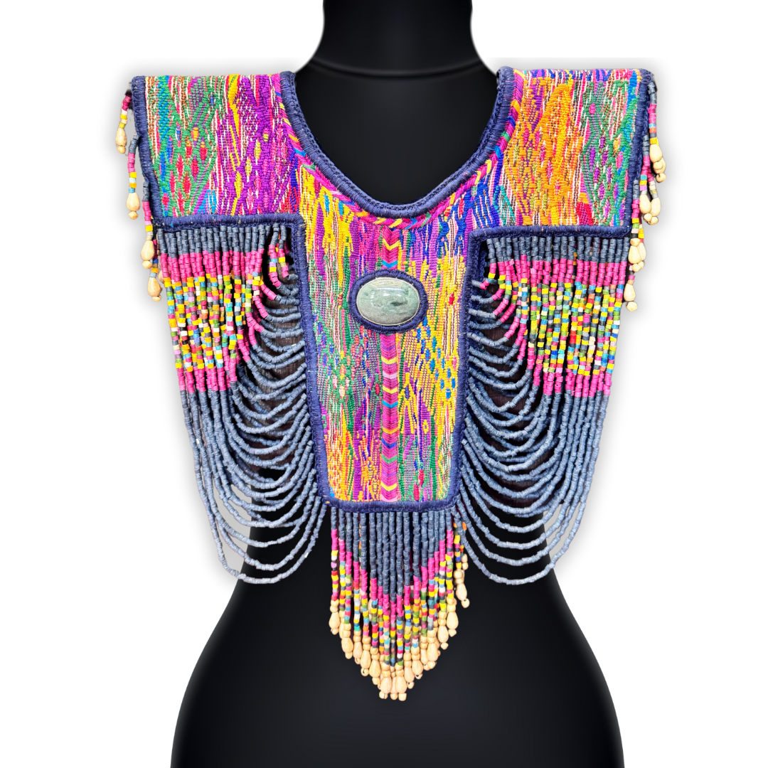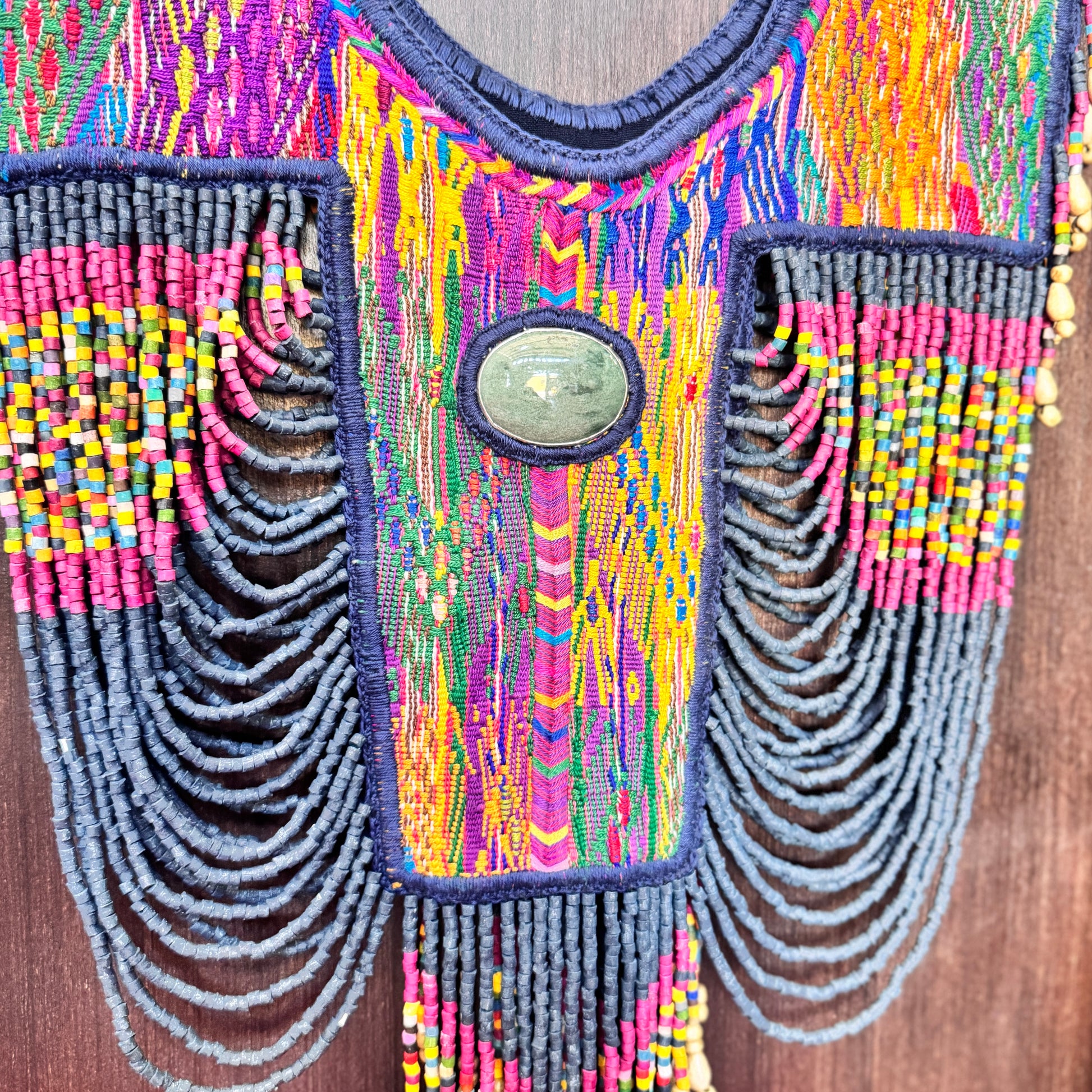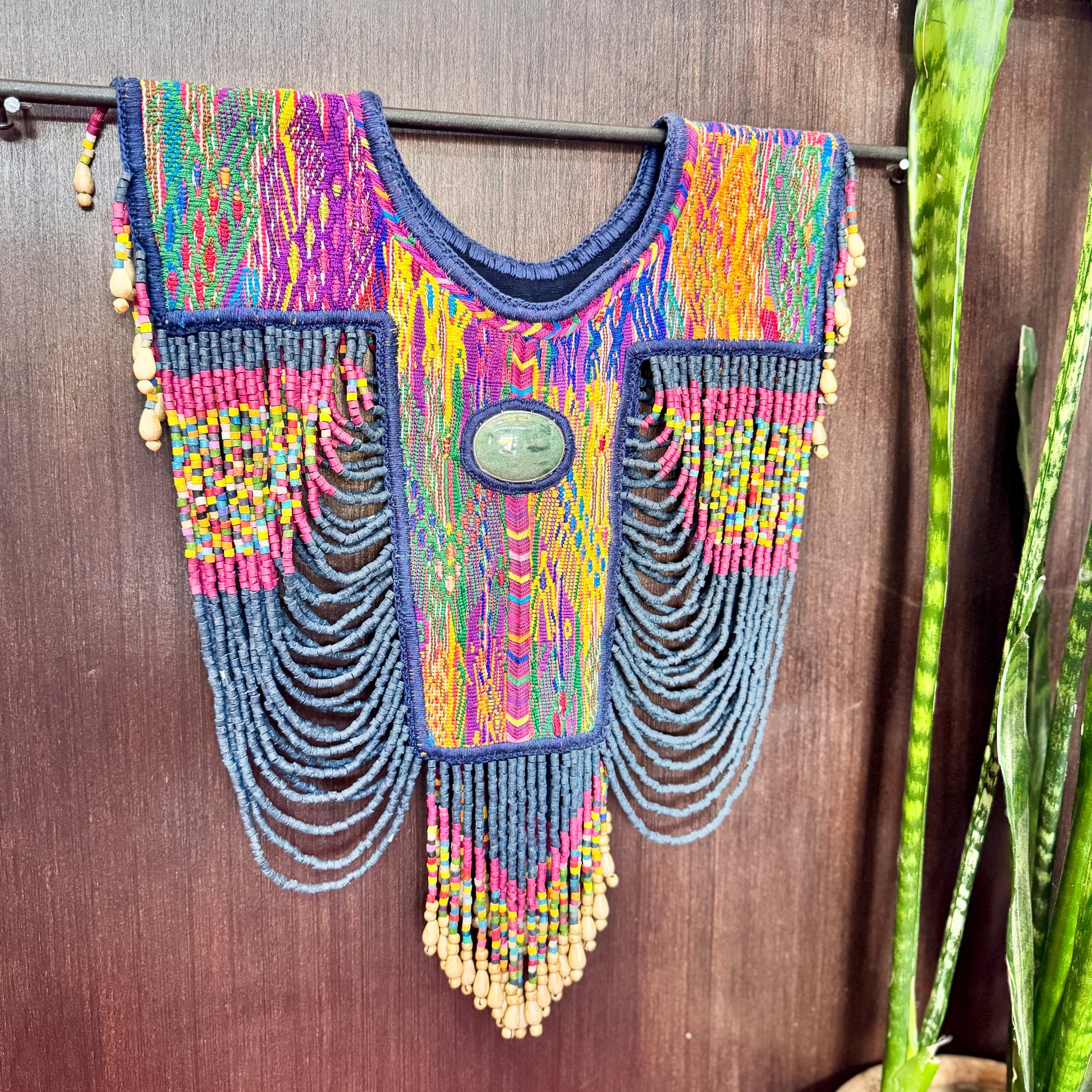 At its center, where the heart rests, a hand-carved jade piece inlaid in sterling silver symbolizes strength and balance, making this design both visually striking and deeply meaningful. Handcrafted from vintage Mayan huipil textiles, each piece carries the rich history of indigenous communities, featuring intricate patterns that reflect their vibrant culture. Every scrap of each huipil is honored—transformed into textile earrings, bracelets, and now, this stunning garment.