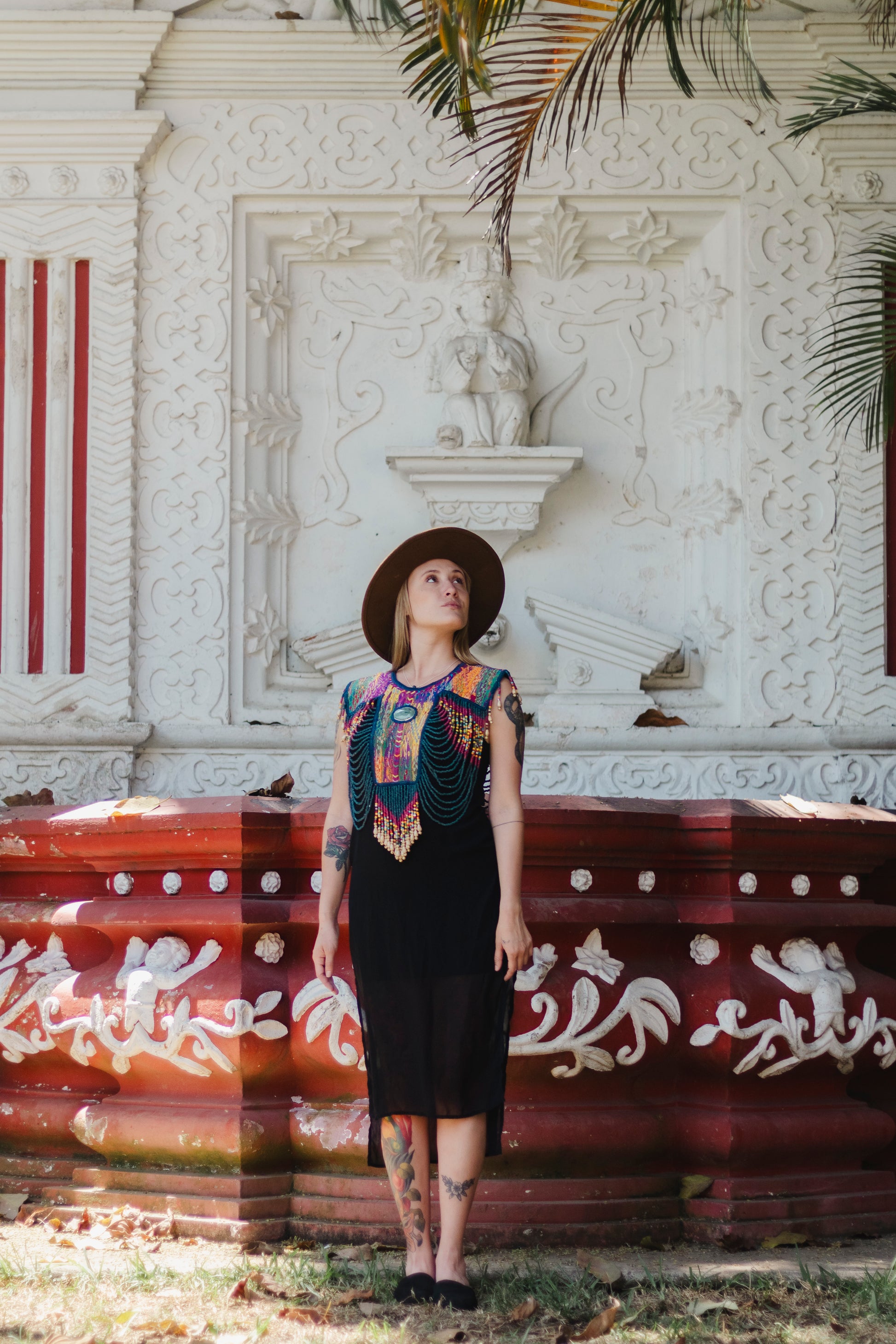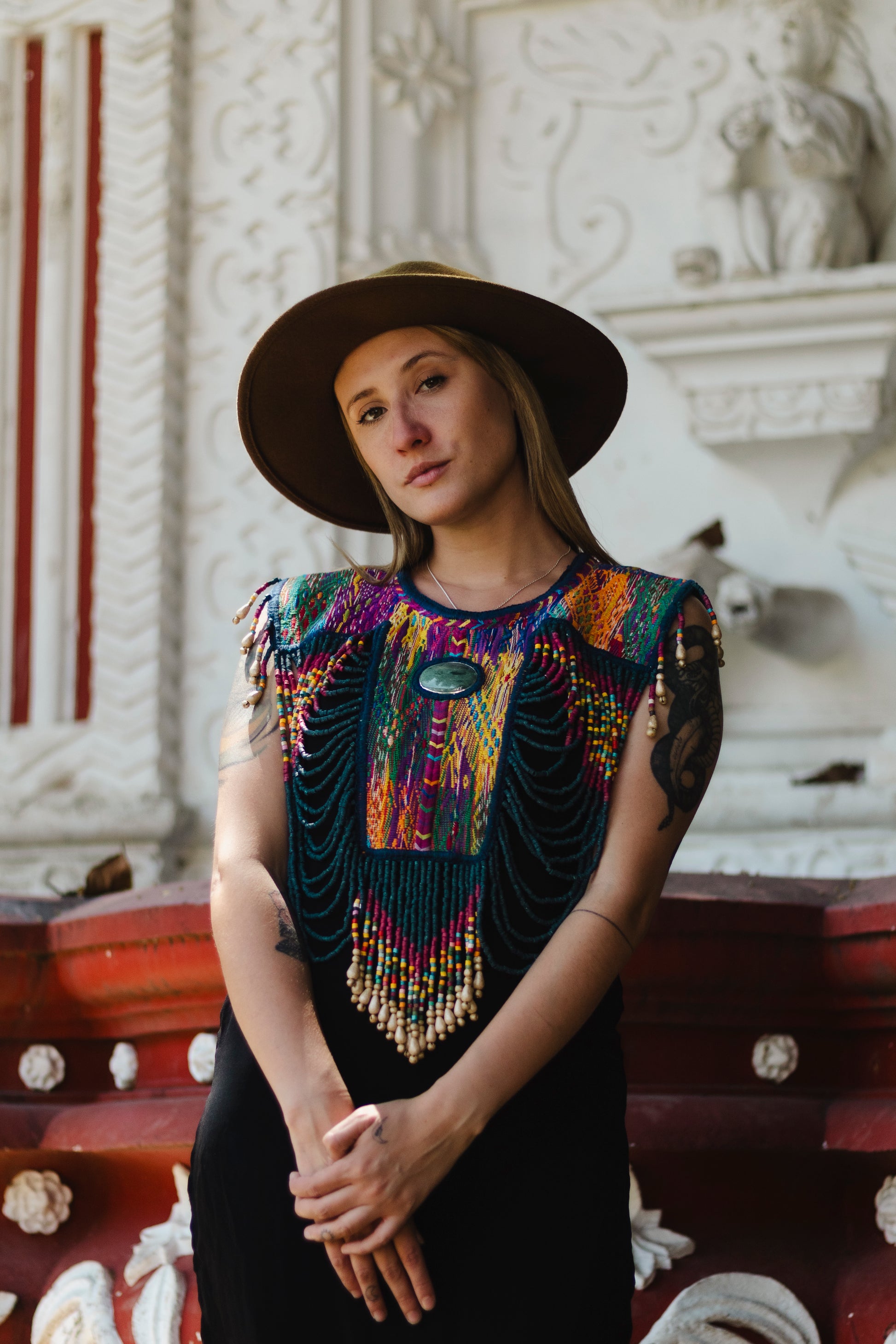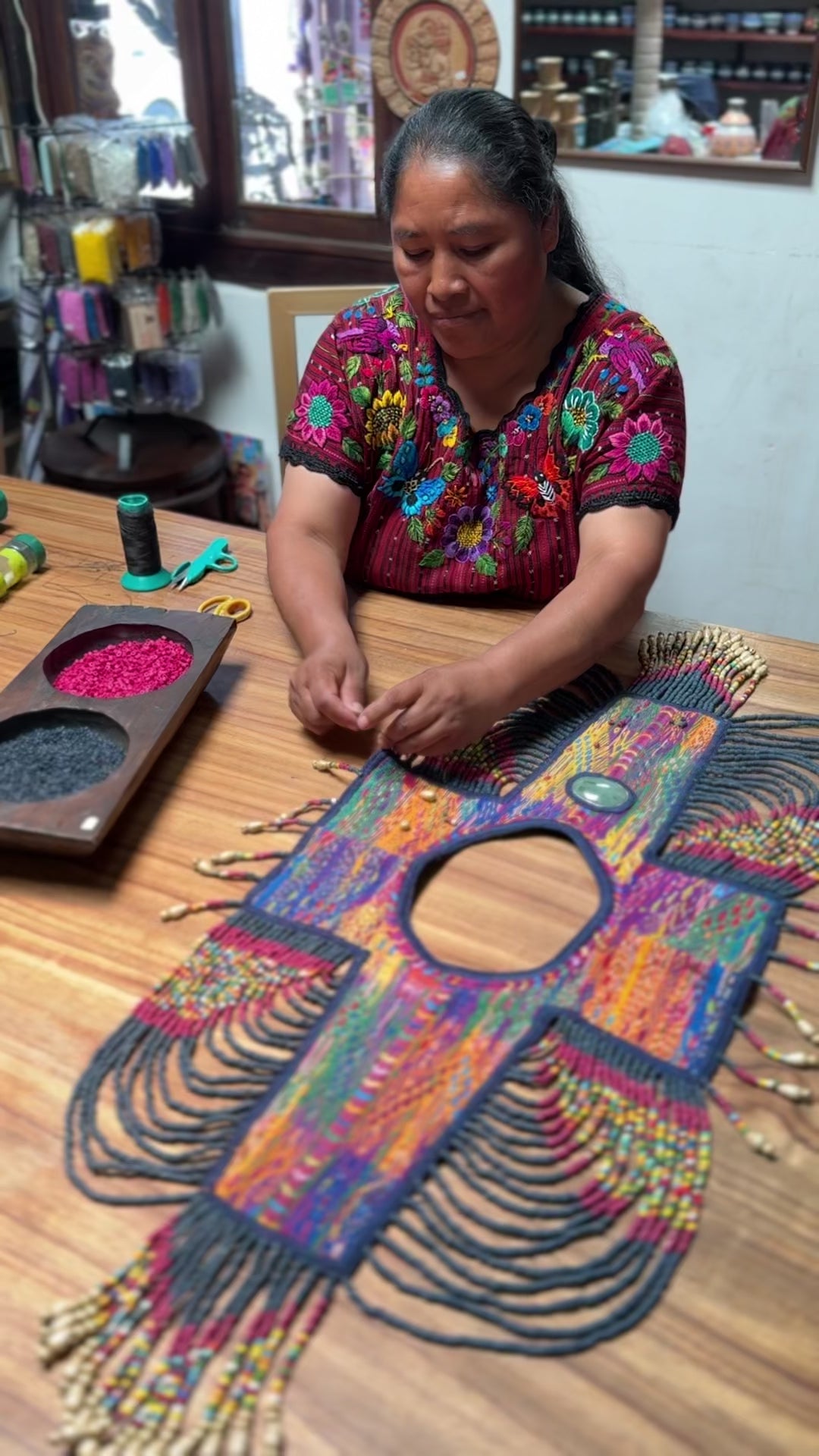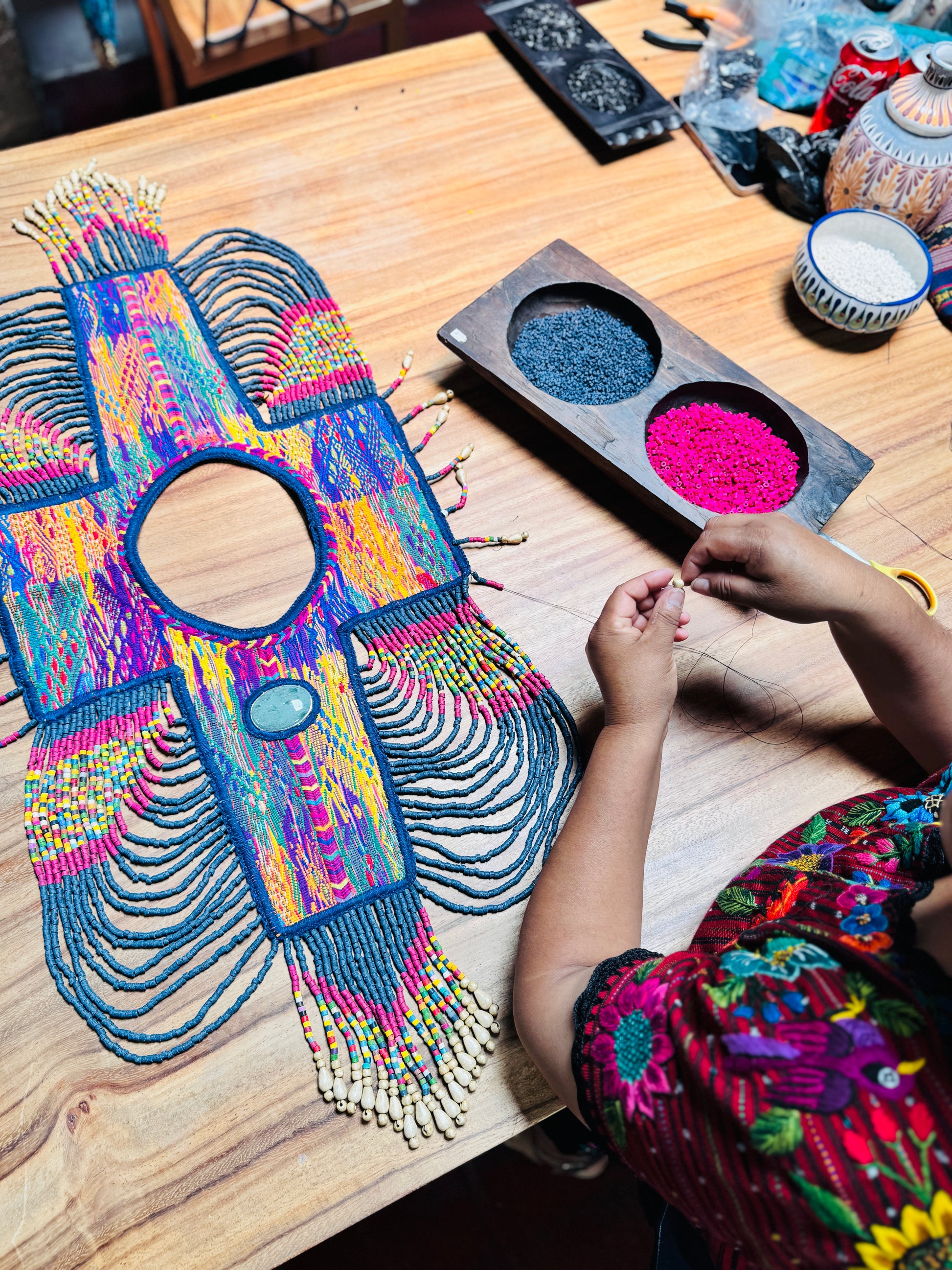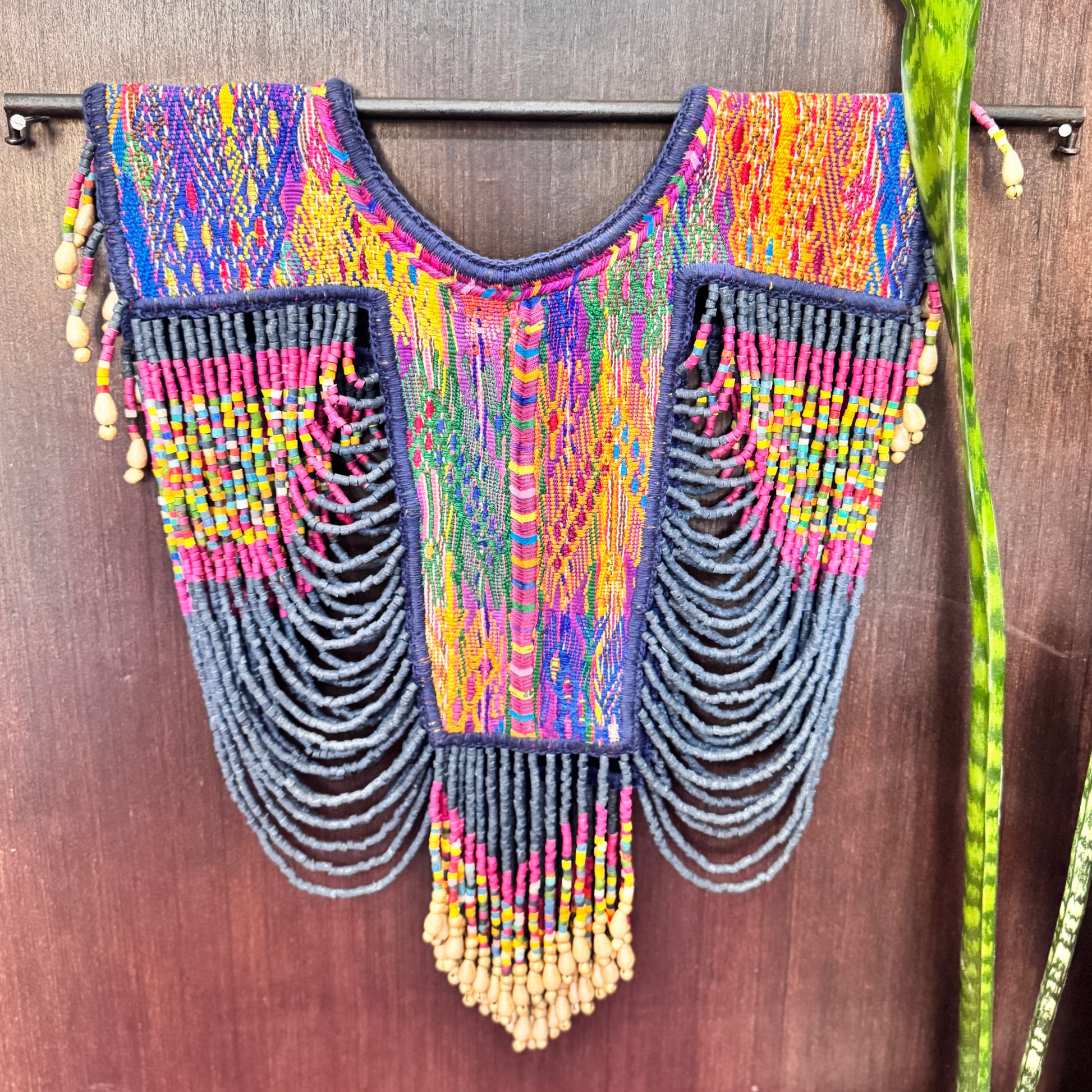 At its center, where the heart rests, a hand-carved jade piece inlaid in sterling silver symbolizes strength and balance, making this design both visually striking and deeply meaningful. Handcrafted from vintage Mayan huipil textiles, each piece carries the rich history of indigenous communities, featuring intricate patterns that reflect their vibrant culture. Every scrap of each huipil is honored—transformed into textile earrings, bracelets, and now, this stunning garment.