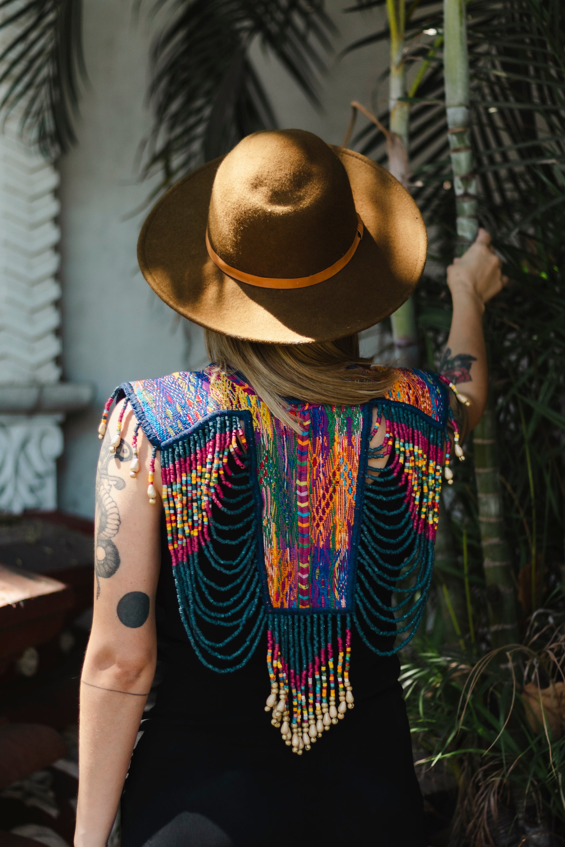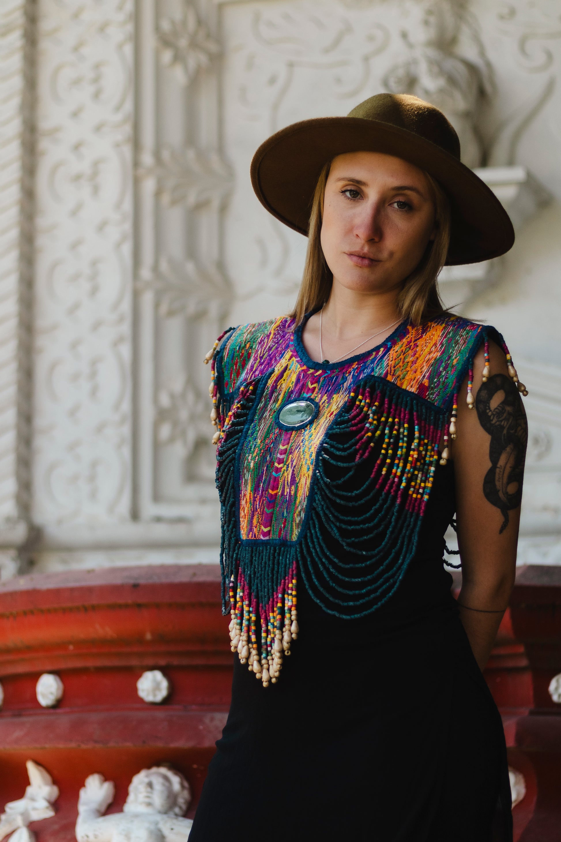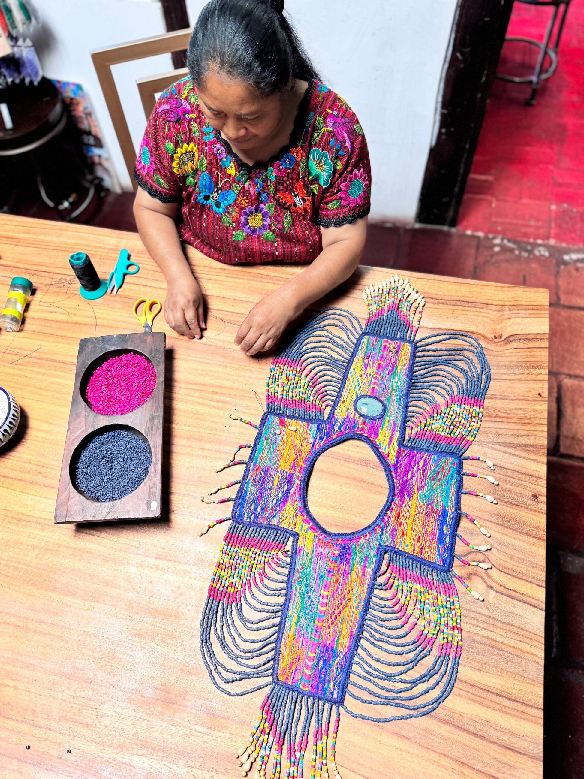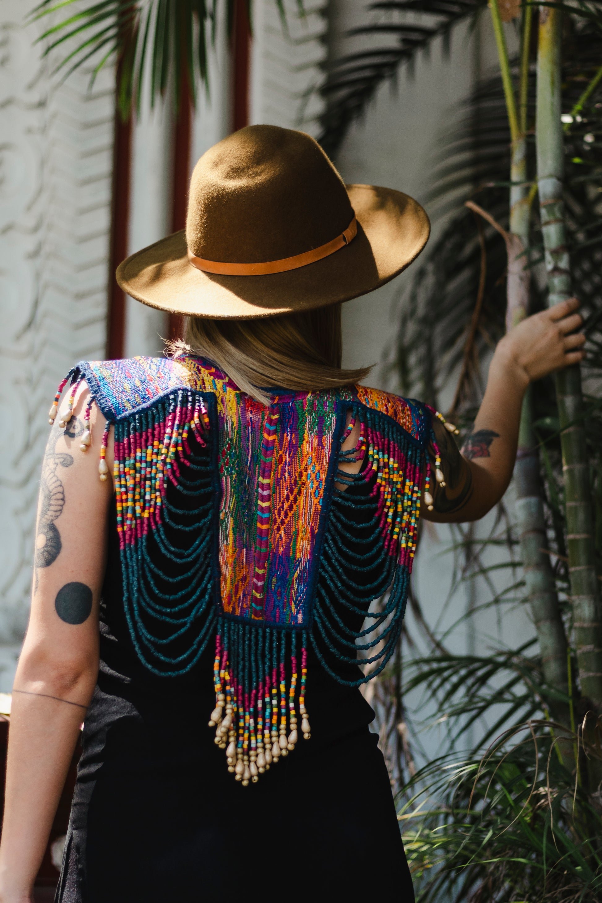 This Templario Poncho showcases hand-woven textile from the town of San Juan Sacatepequez. Read more about this textile here. A high-quality crochet edge protects the exclusive vintage fabric, ensuring both durability and elegance. Draped gracefully over the shoulders, with an open-sided design for effortless movement, it is adorned with our signature ceramic beads, cascading fluidly in the front and back.