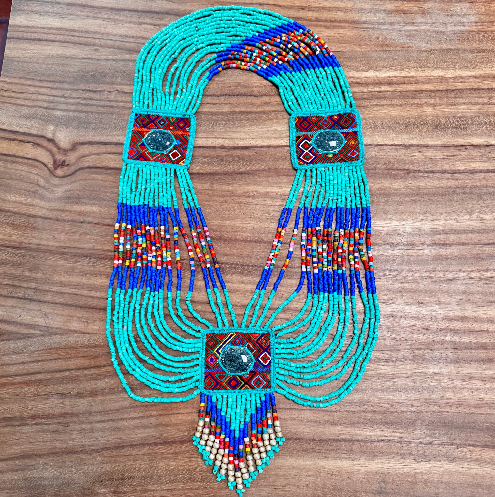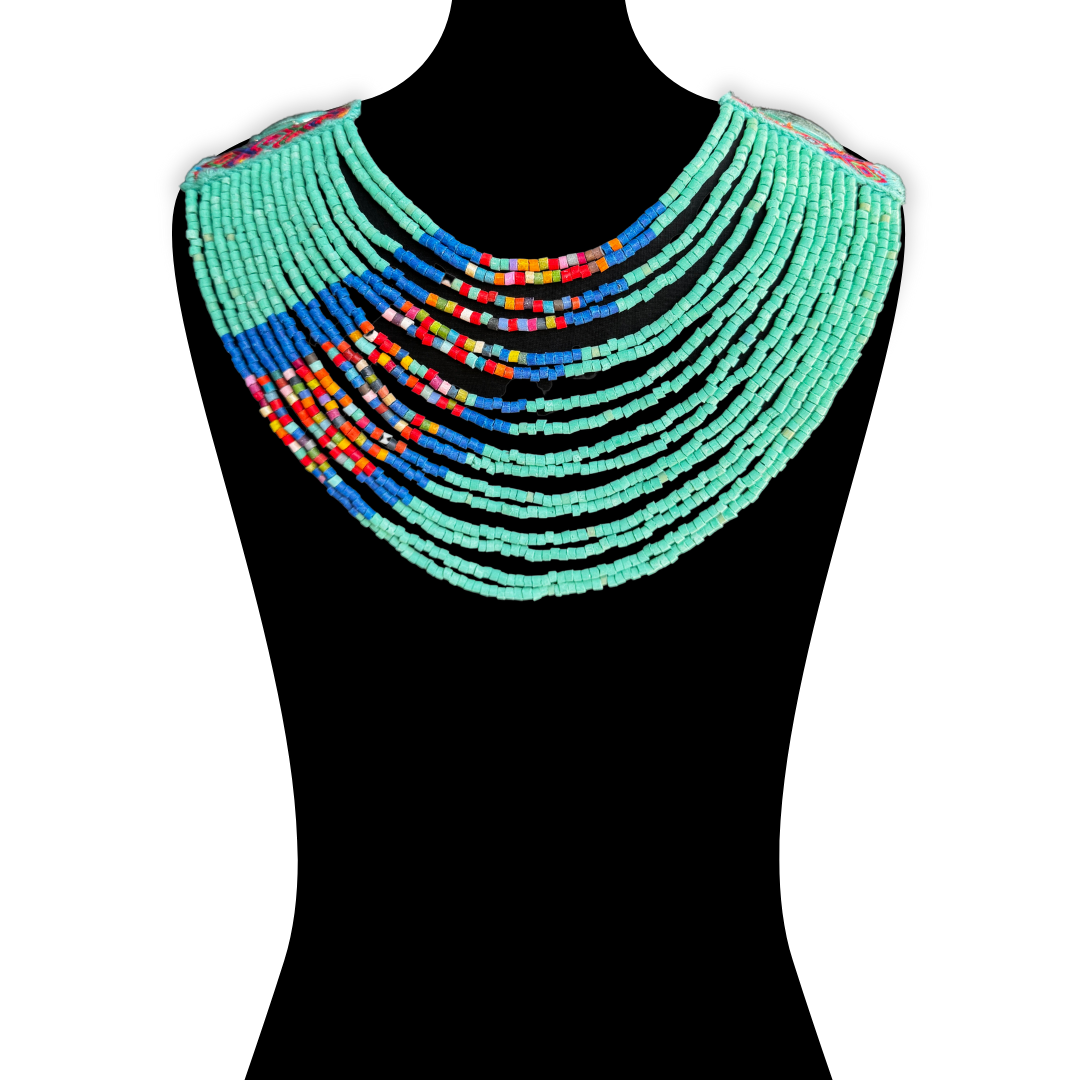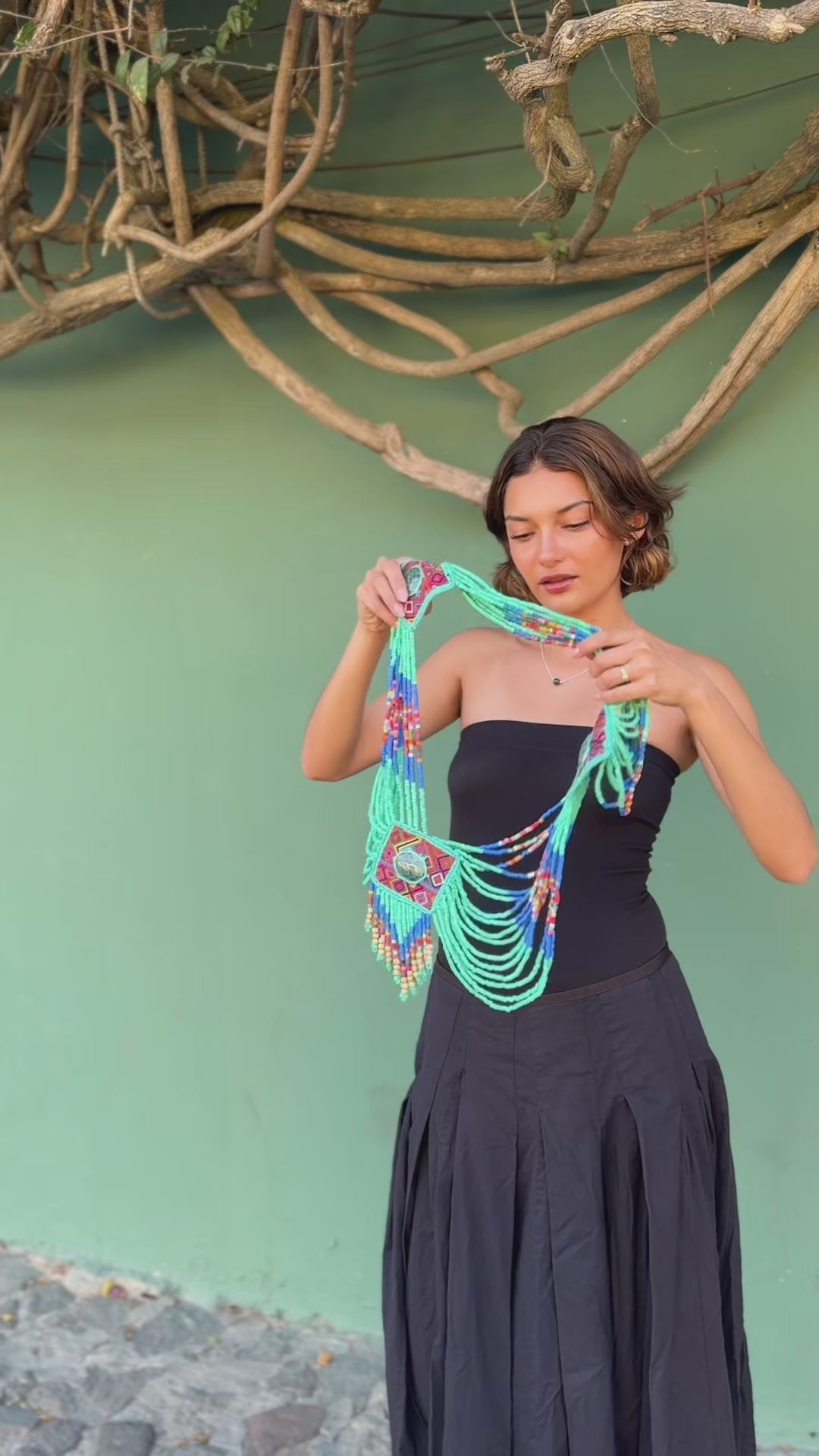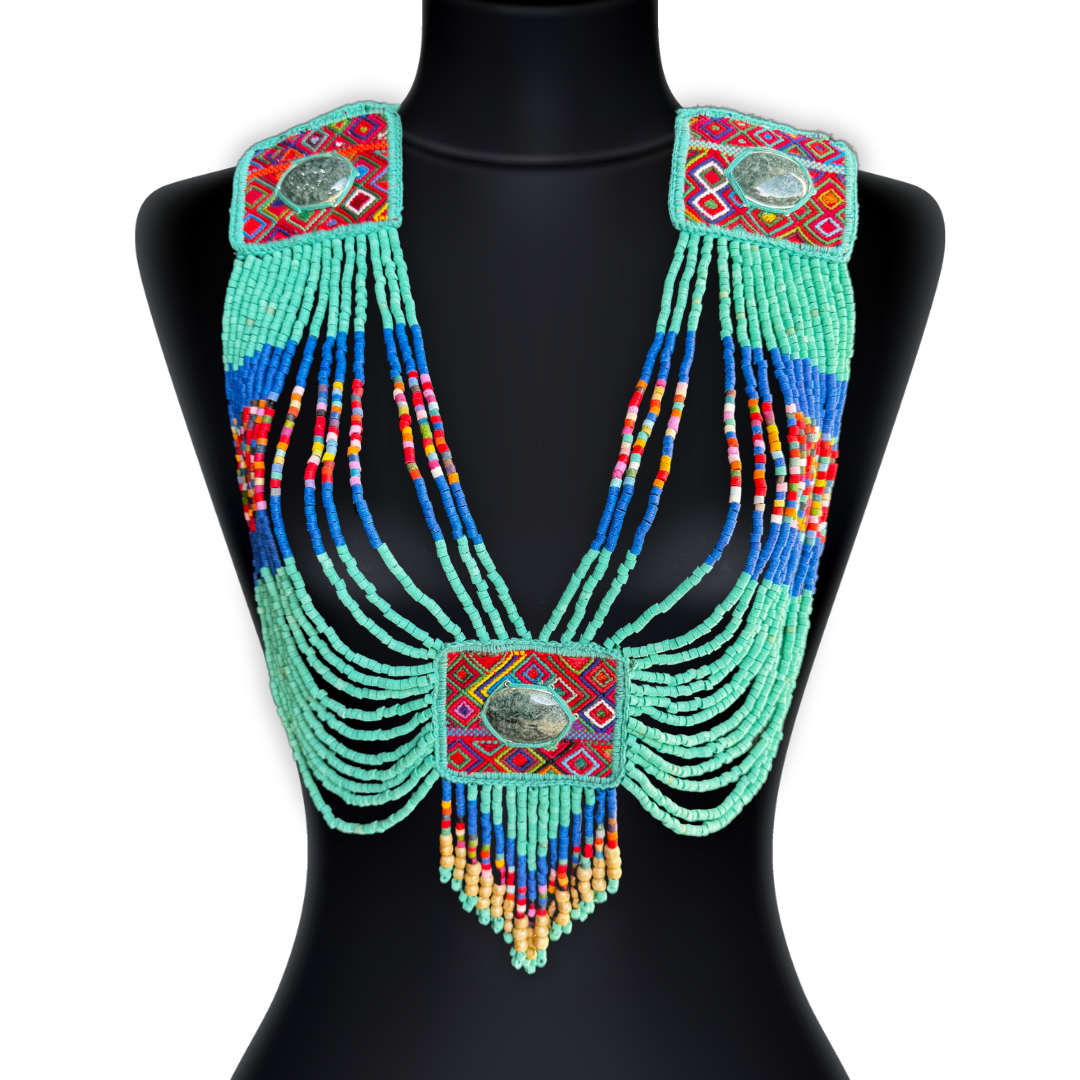Designed to embody strength, spirituality, and radiant elegance, this statement body jewelry features three sections of handmade ceramic beads in uniquely combined colors. The beads drape gracefully across the chest and back, creating a powerful yet feminine silhouette.