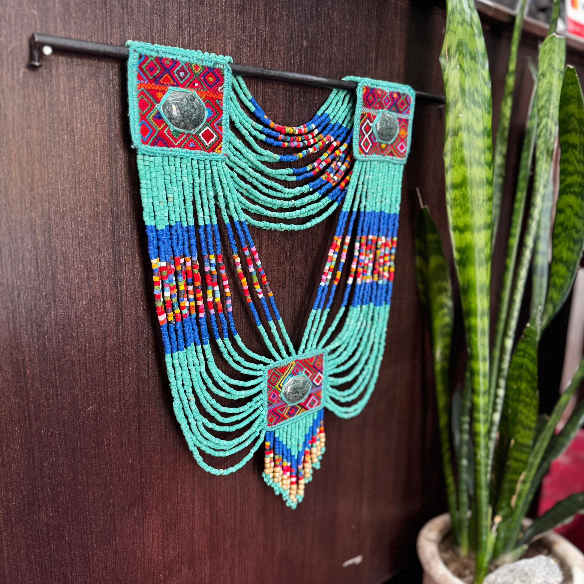 This piece is one-size-fits-all and flatters all body types. This specific piece is in our smaller sized category in terms of the beaded chain length. See photos for comparison. Nonetheless, the beaded chains adjust to your form, embracing your shape in a fluid and flattering way. Whether you’re at a festival, ceremony, or simply want to make a spiritual fashion statement, this is your go-to.