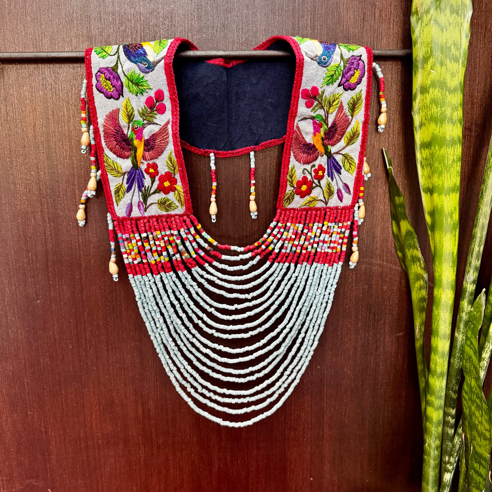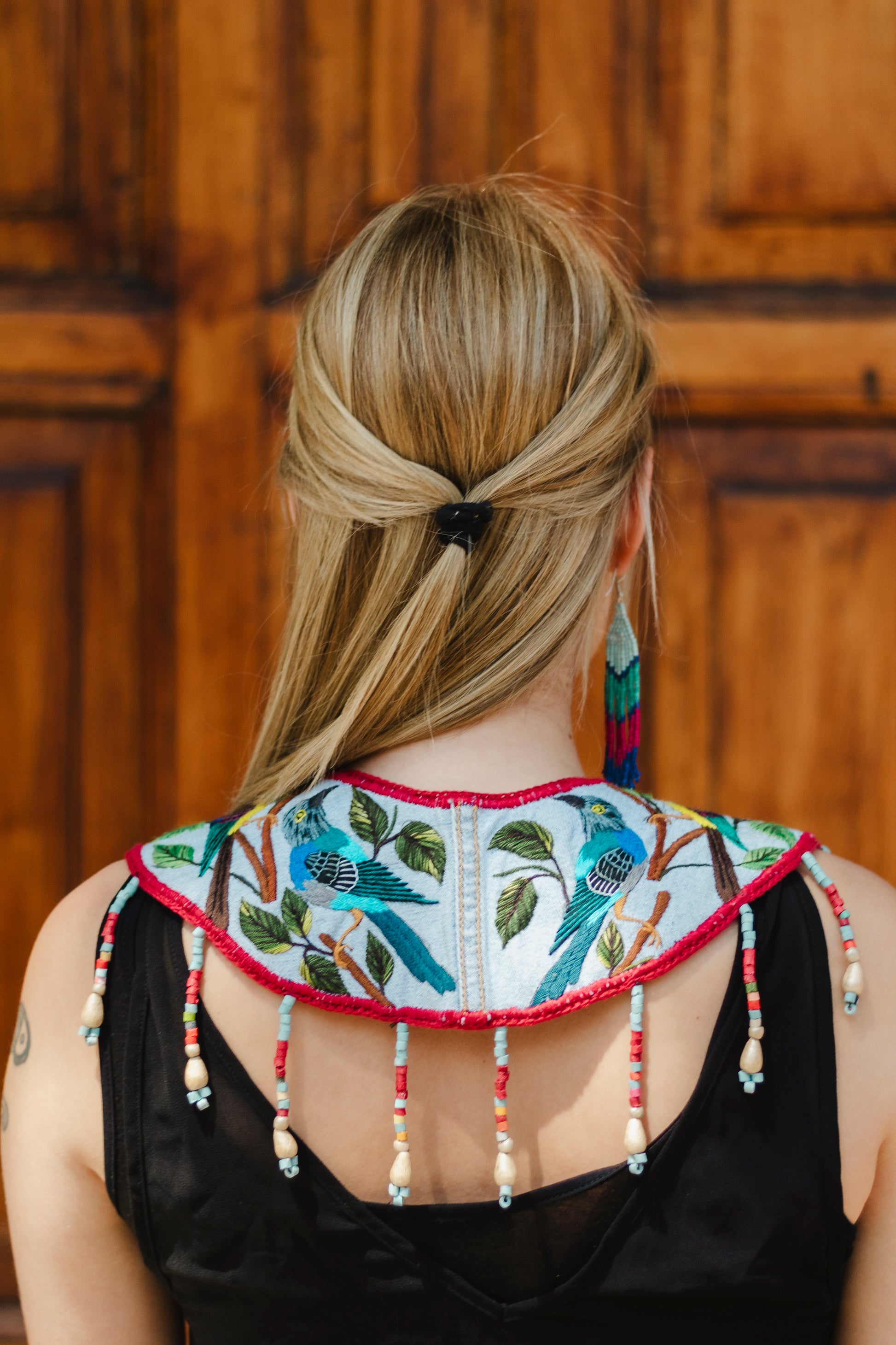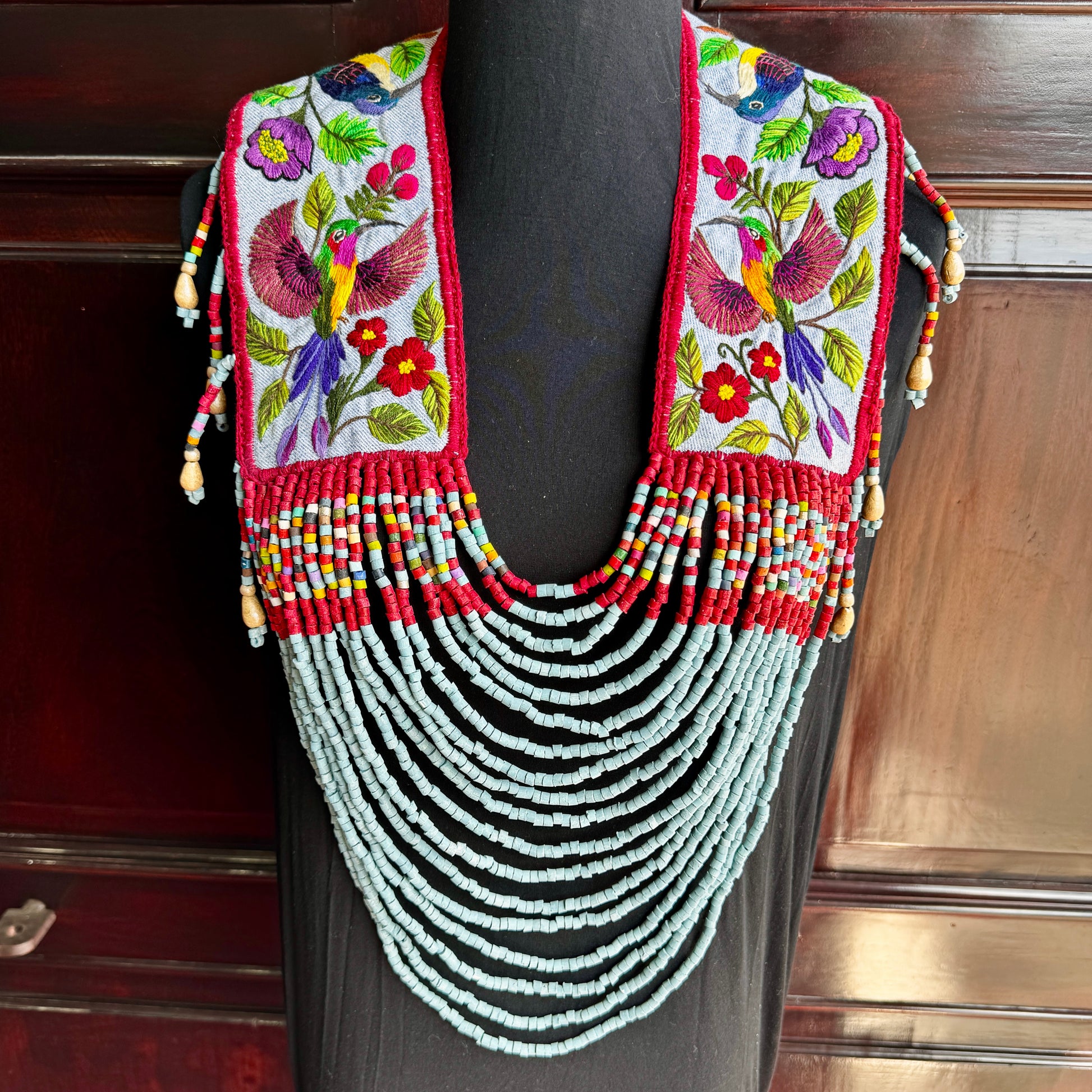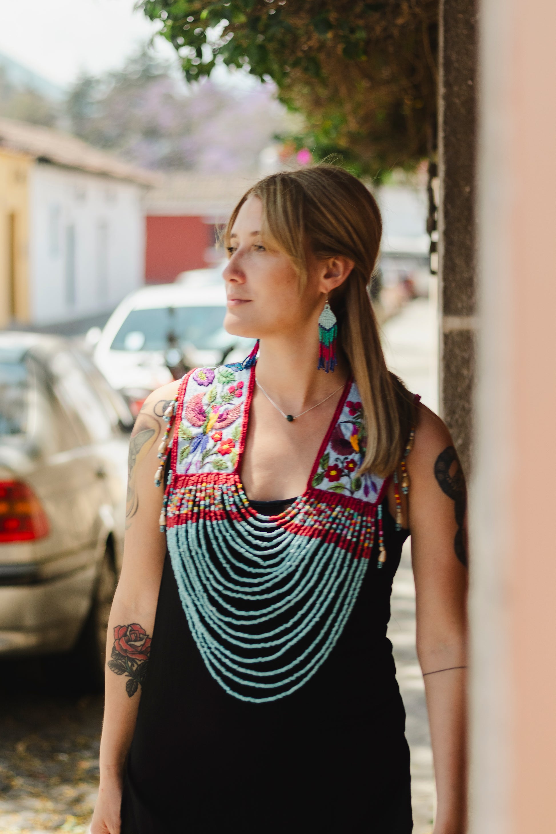 La colección Pechera Ceremonial Aguacatán es uno de nuestros diseños emblemáticos. Es una pieza ligera de arte portátil que viene en muchos colores.