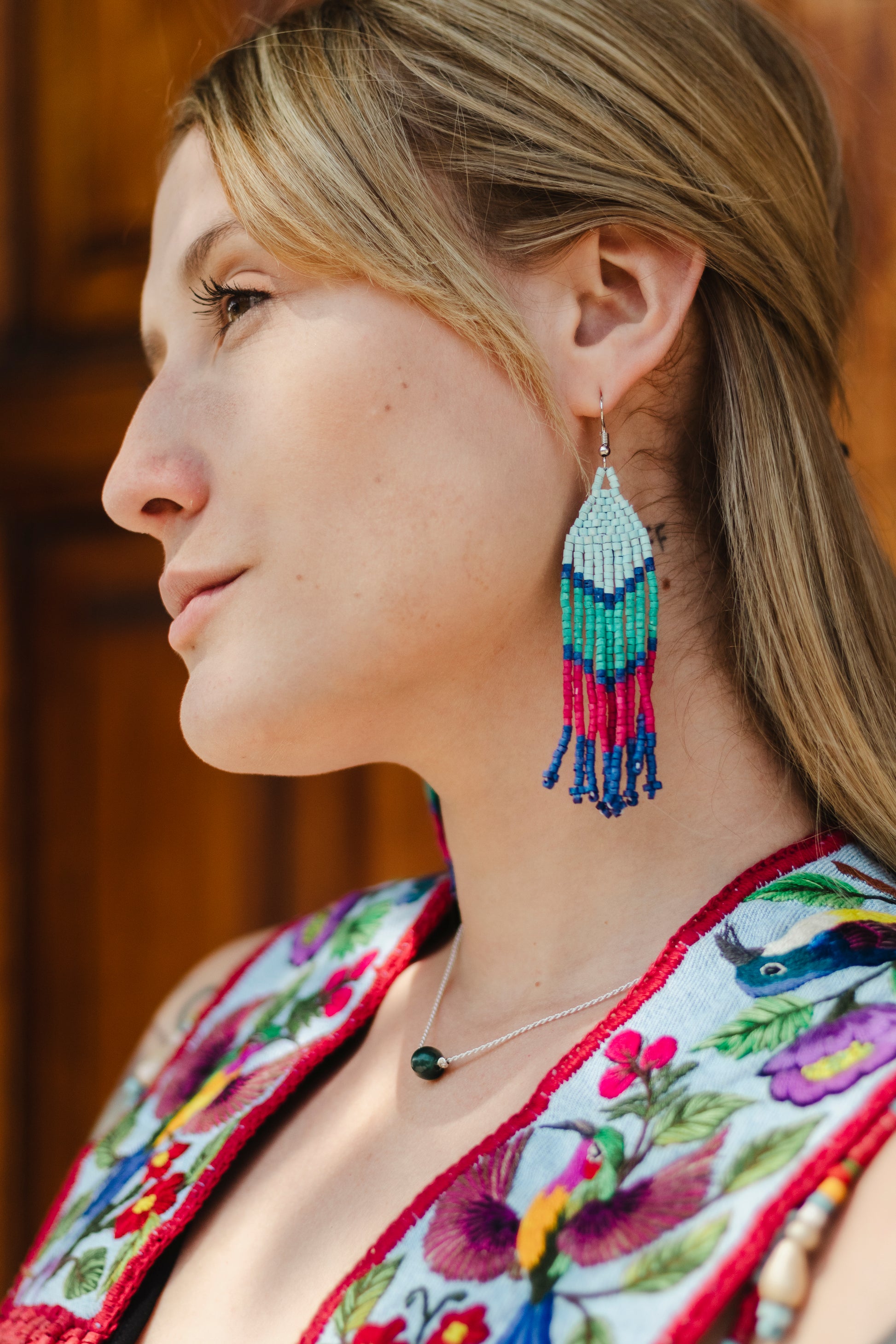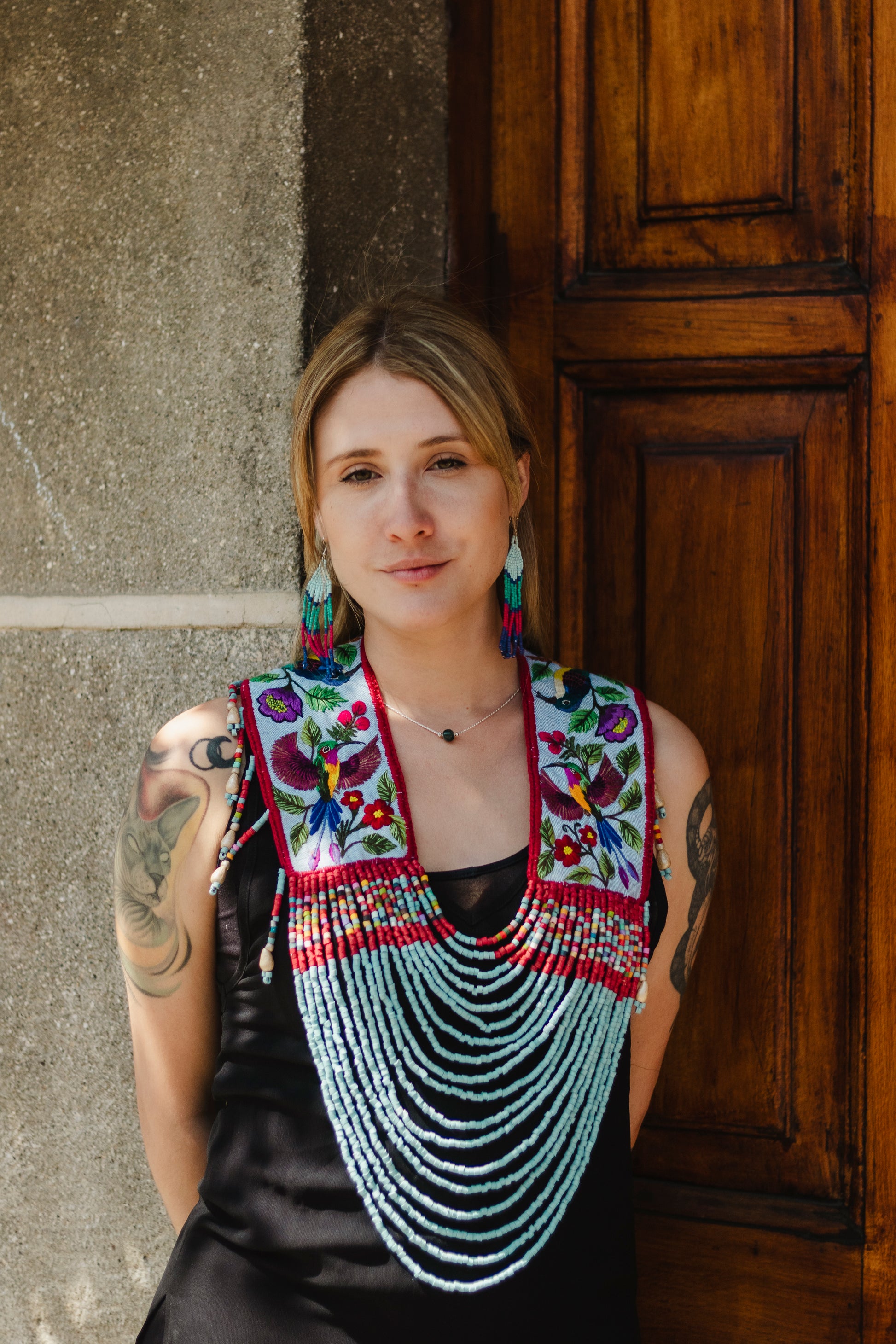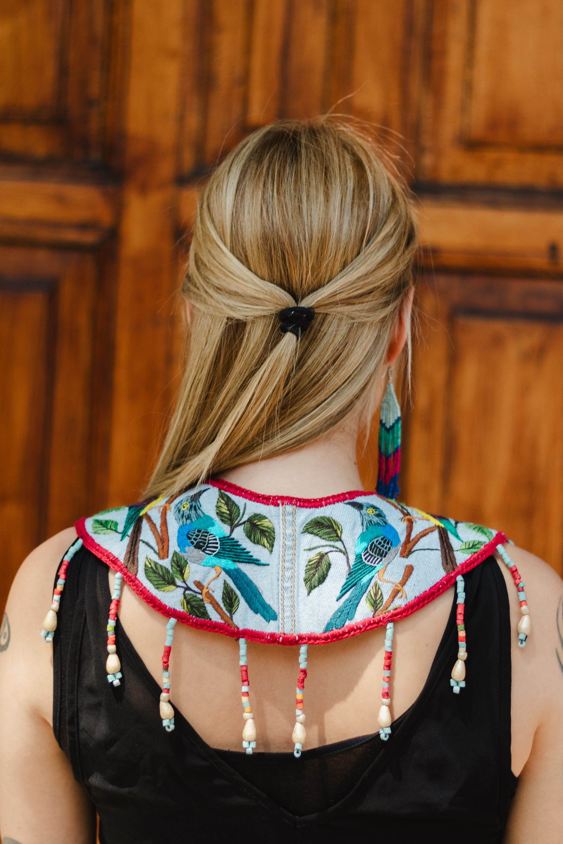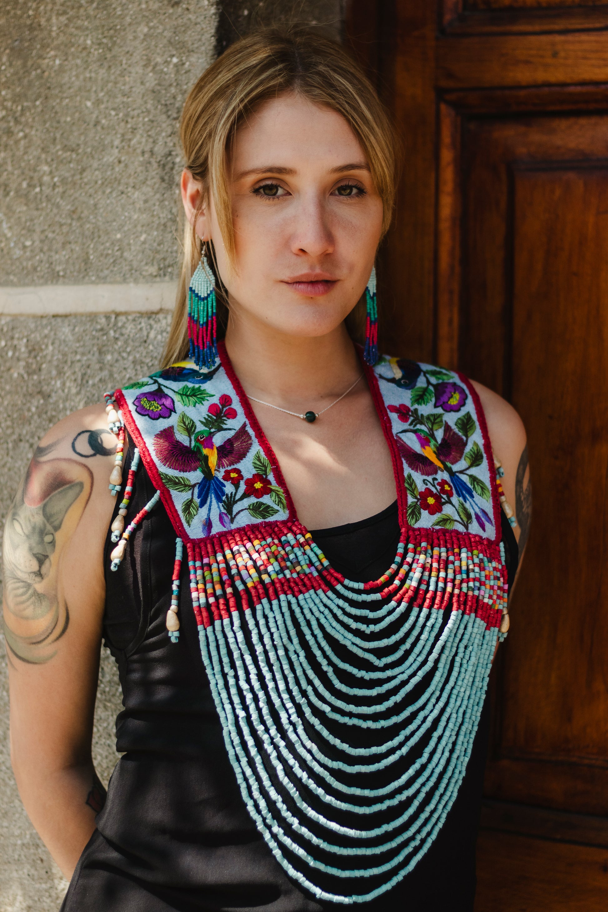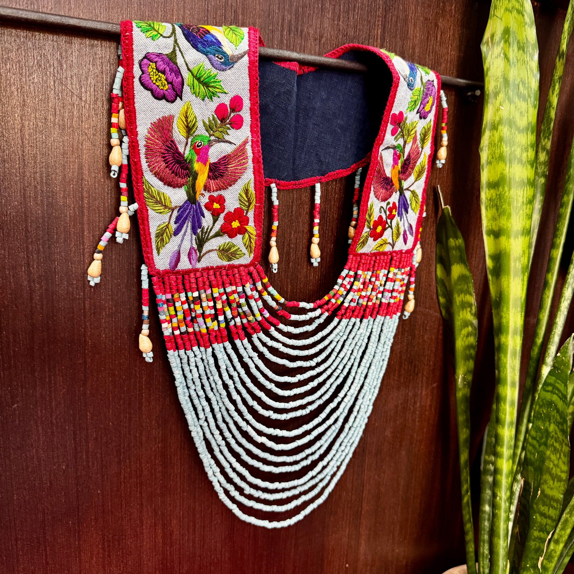 La colección Pechera Ceremonial Aguacatán es uno de nuestros diseños emblemáticos. Es una pieza ligera de arte portátil que viene en muchos colores.