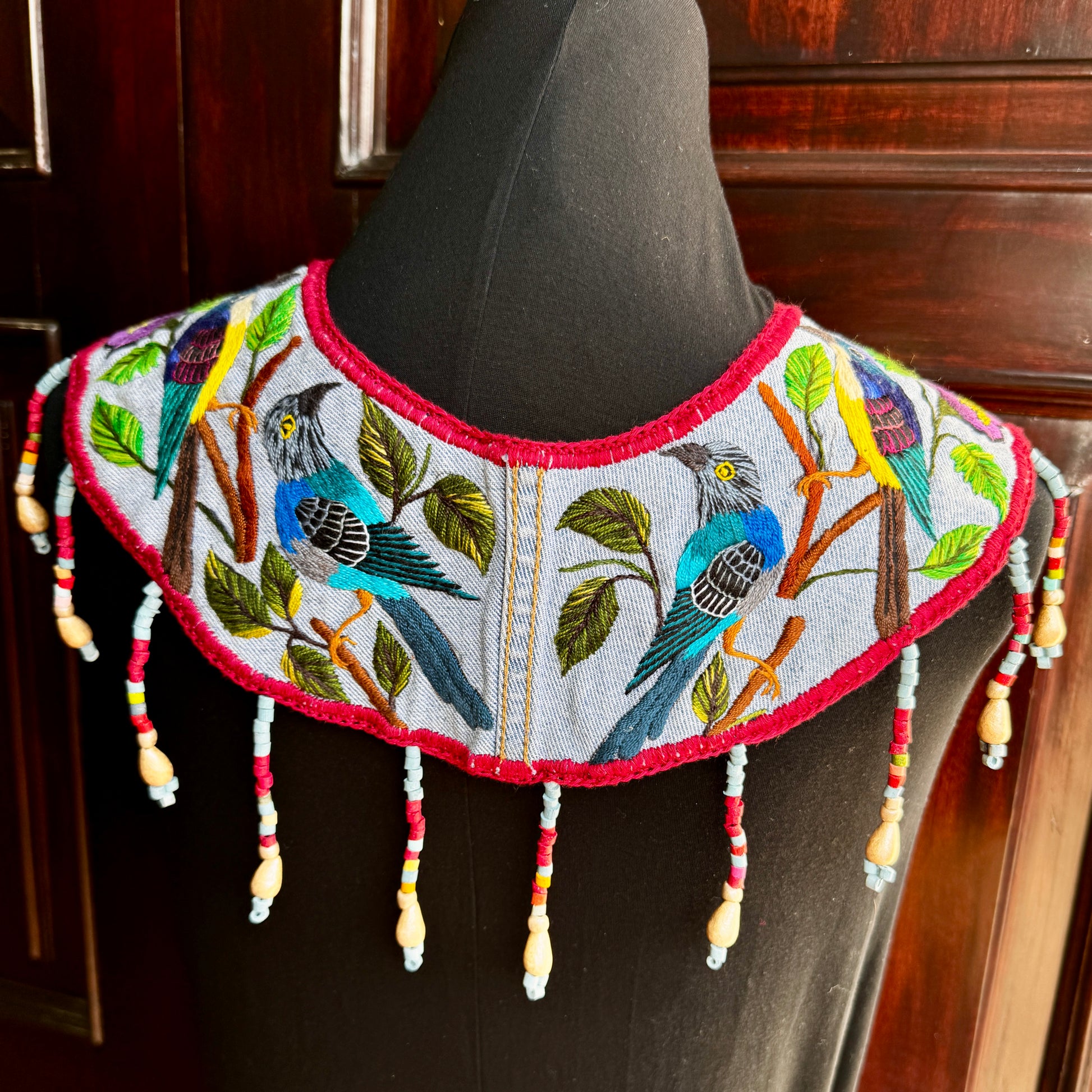 Ceremonial Shoulder Piece with Hand-Embroidered Birds - Stone Blue & Velvet