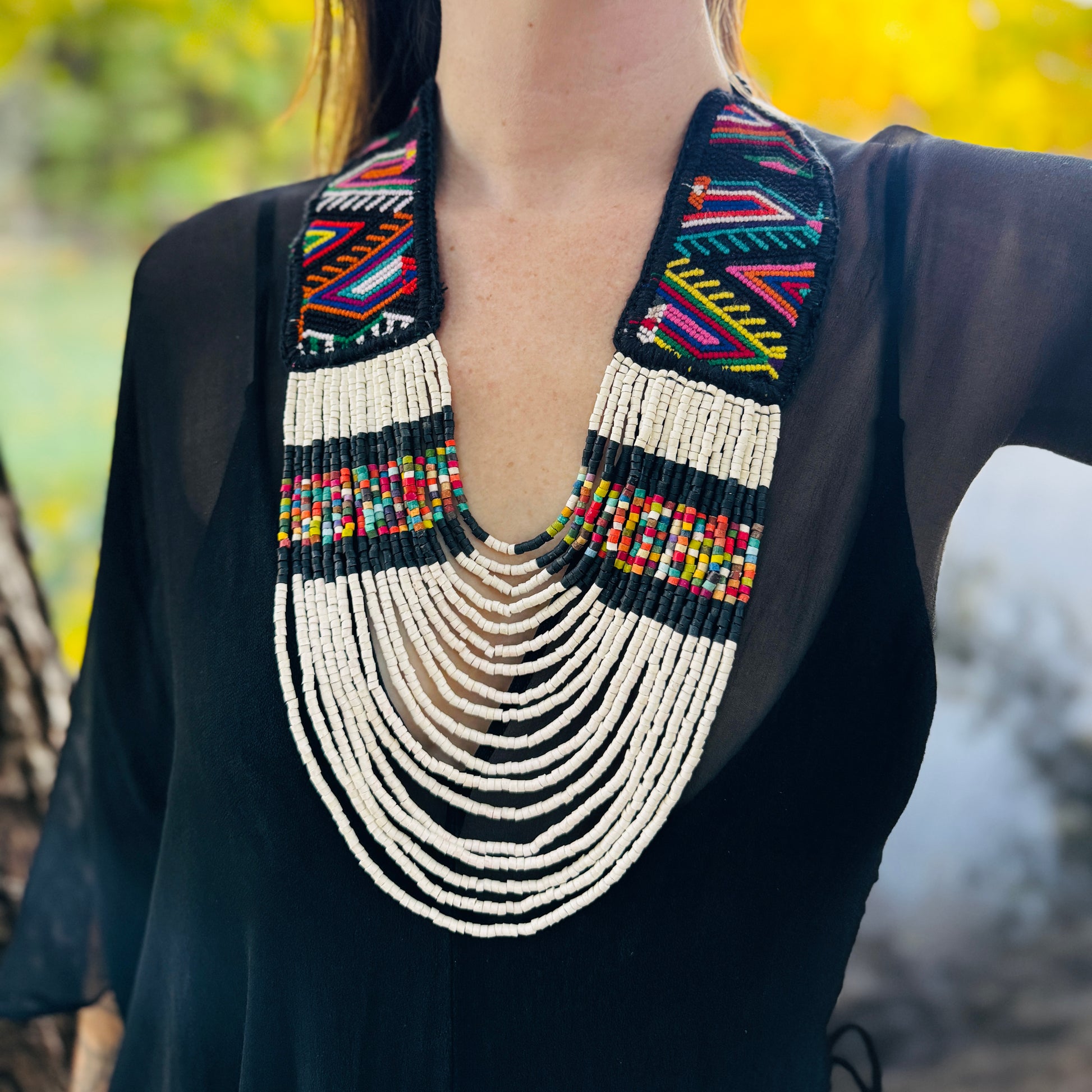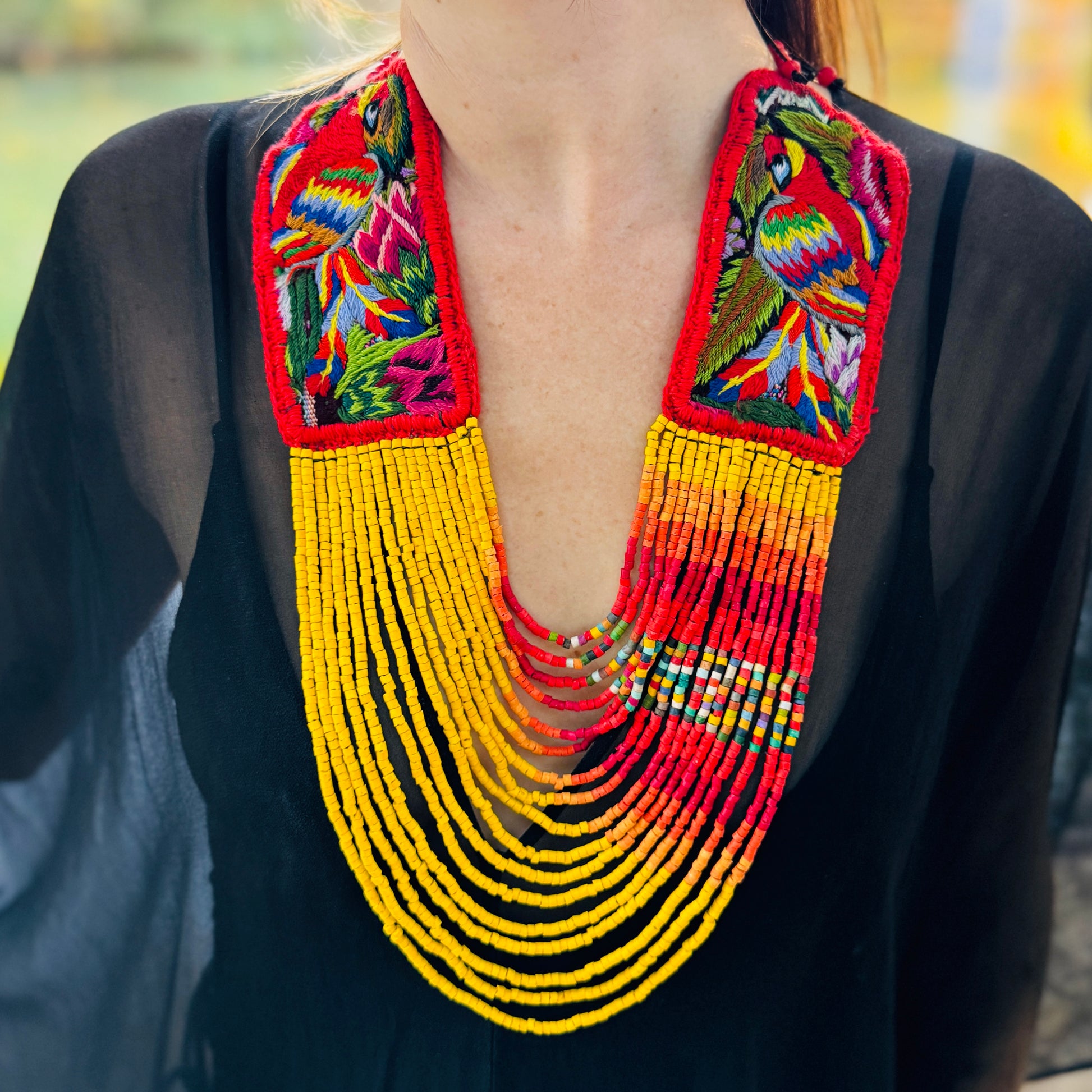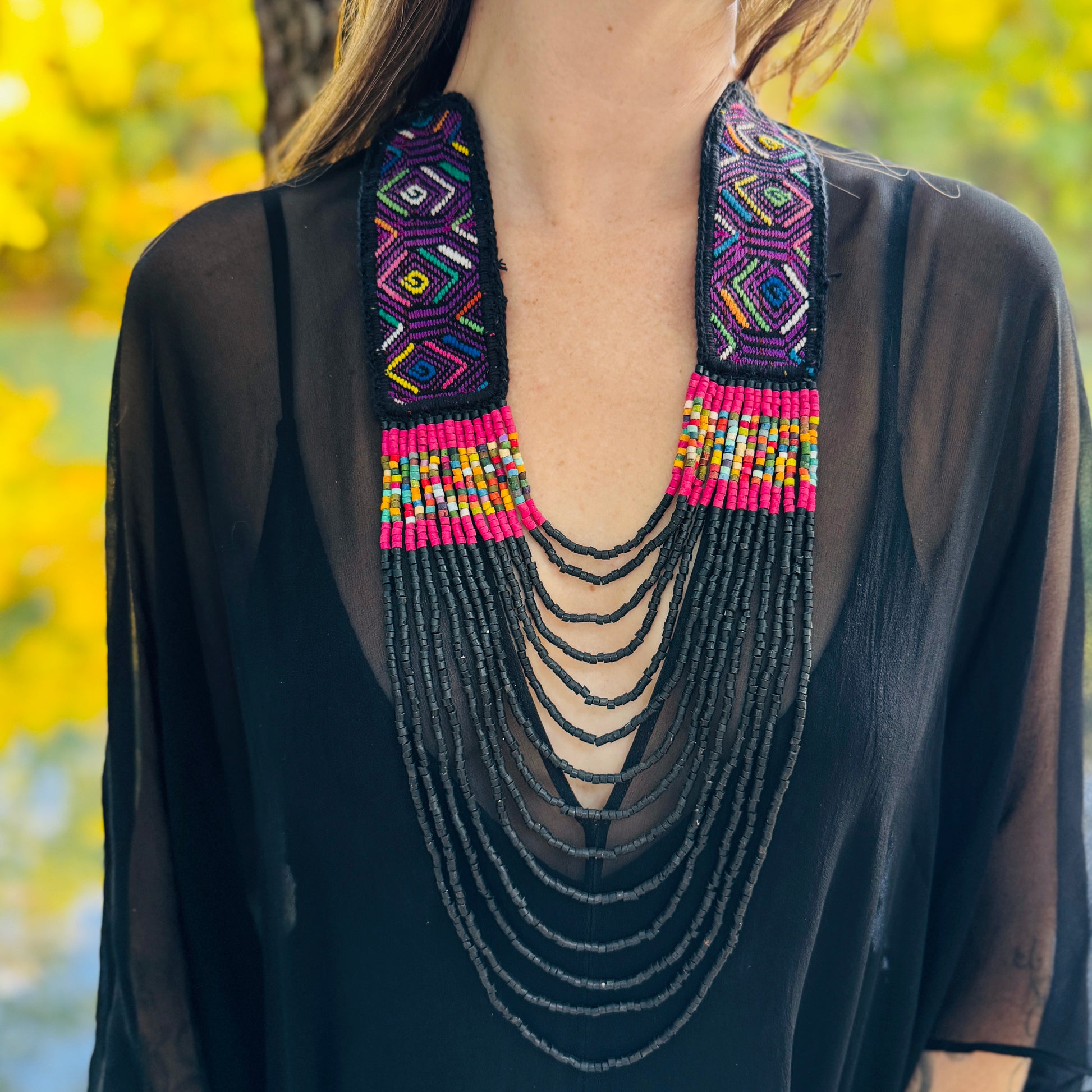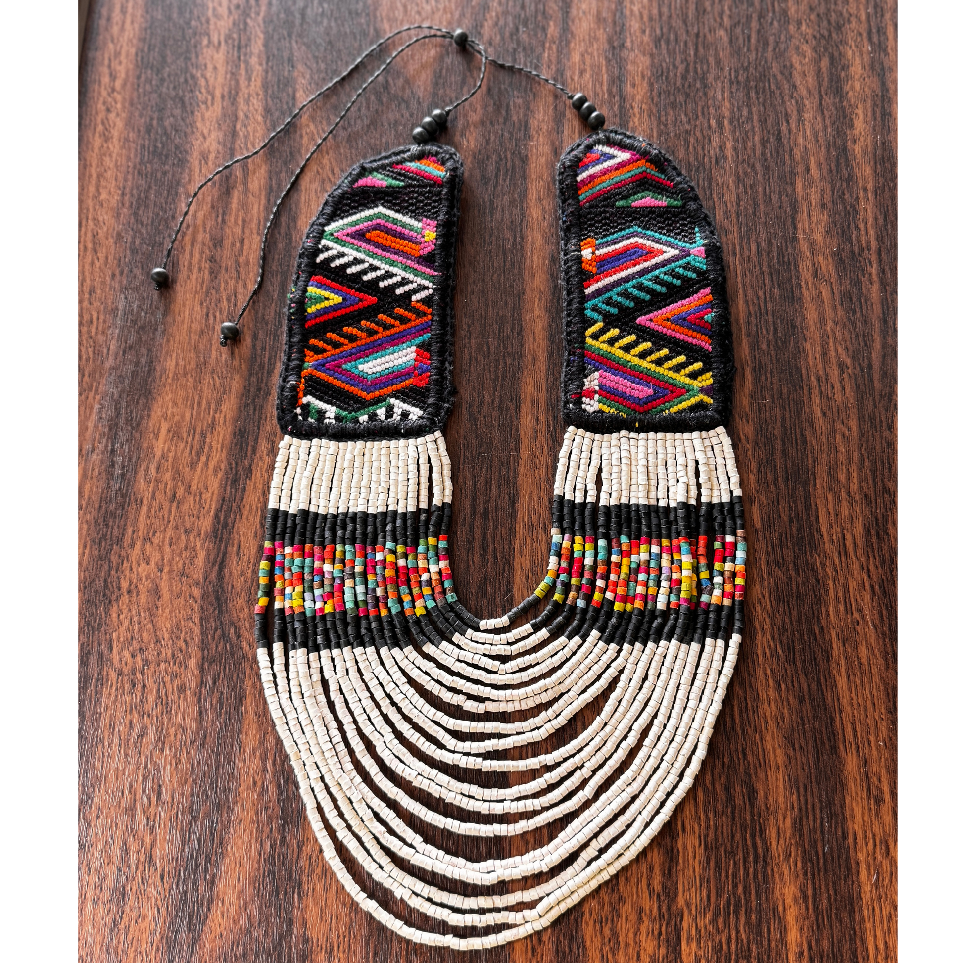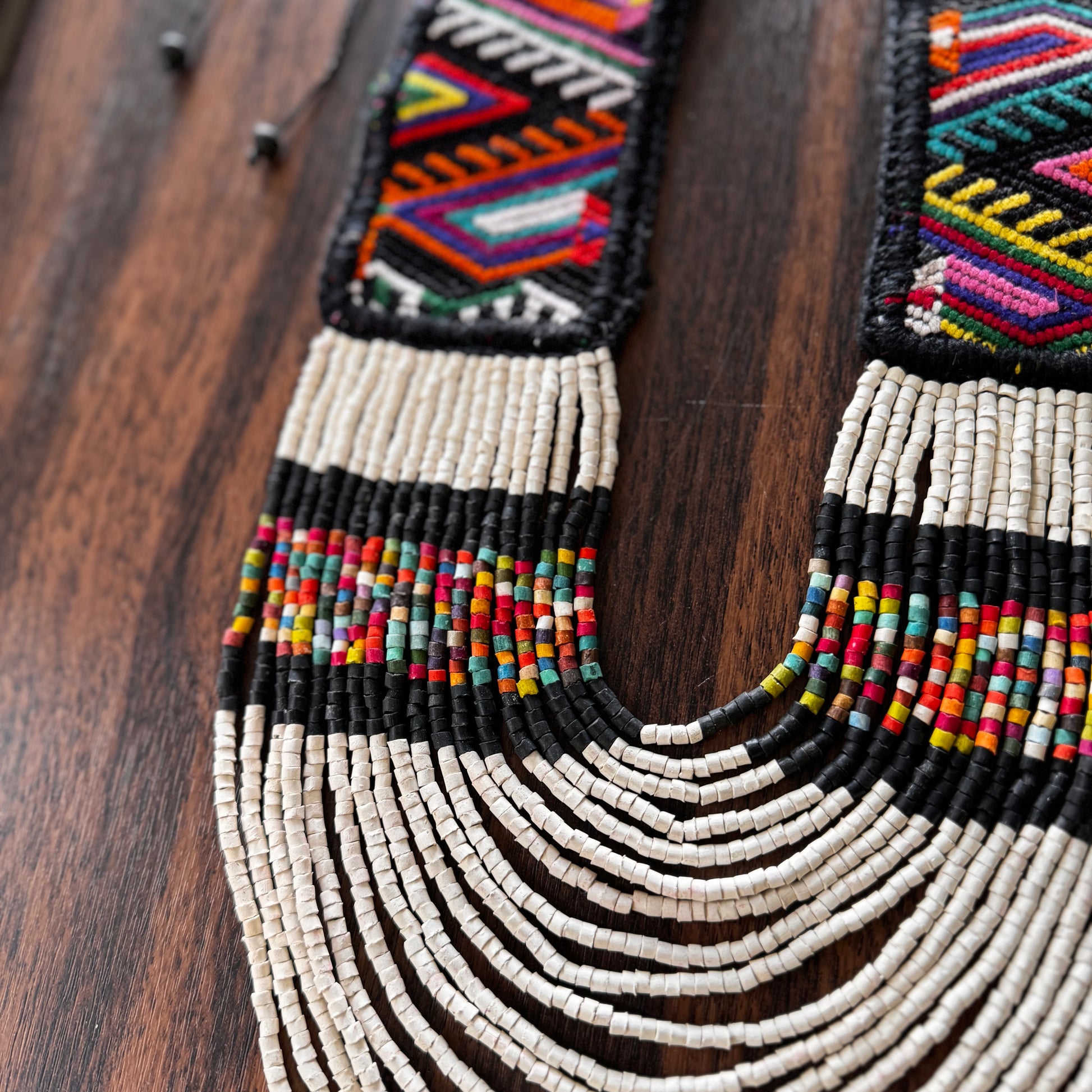 Enhance your style with our handmade ceremonial necklaces, a refined blend of timeless elegance and cultural richness. Each one-of-a-kind necklace is thoughtfully crafted to highlight the intricate artistry of Guatemalan handmade jewelry, combining two stunning textiles with beaded strands in a design that truly makes this a statement piece.