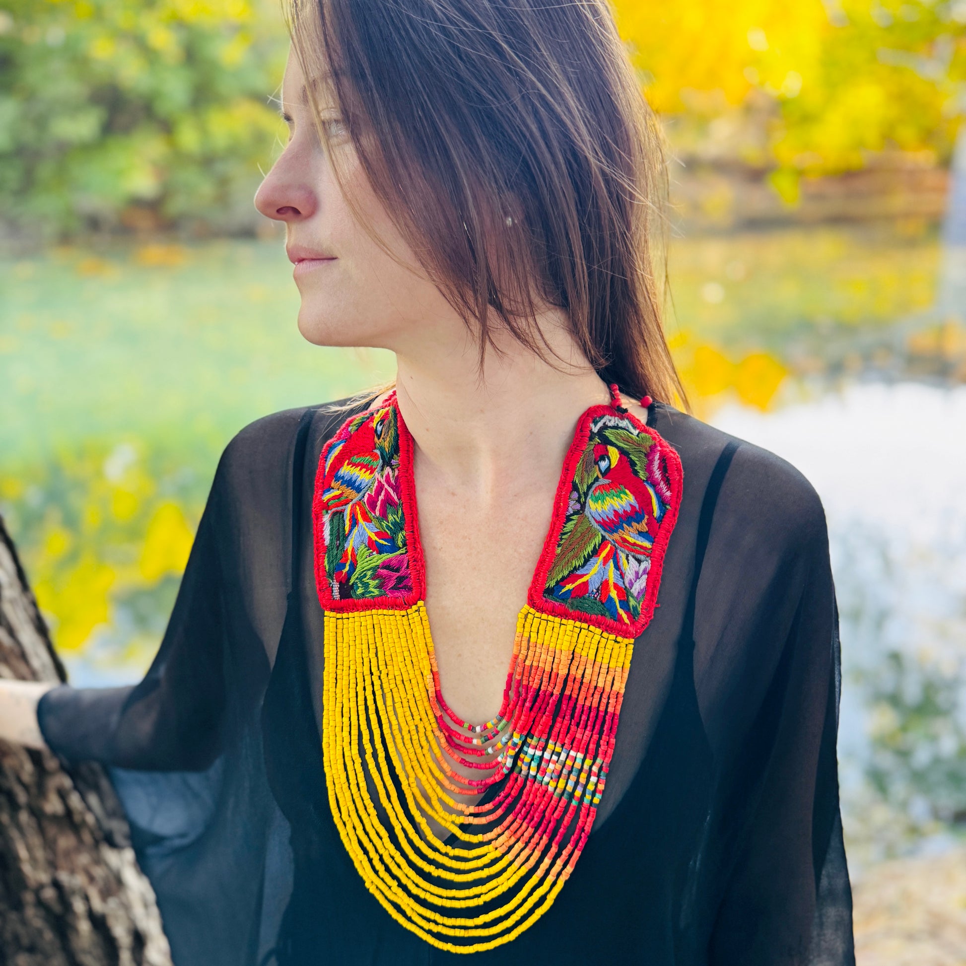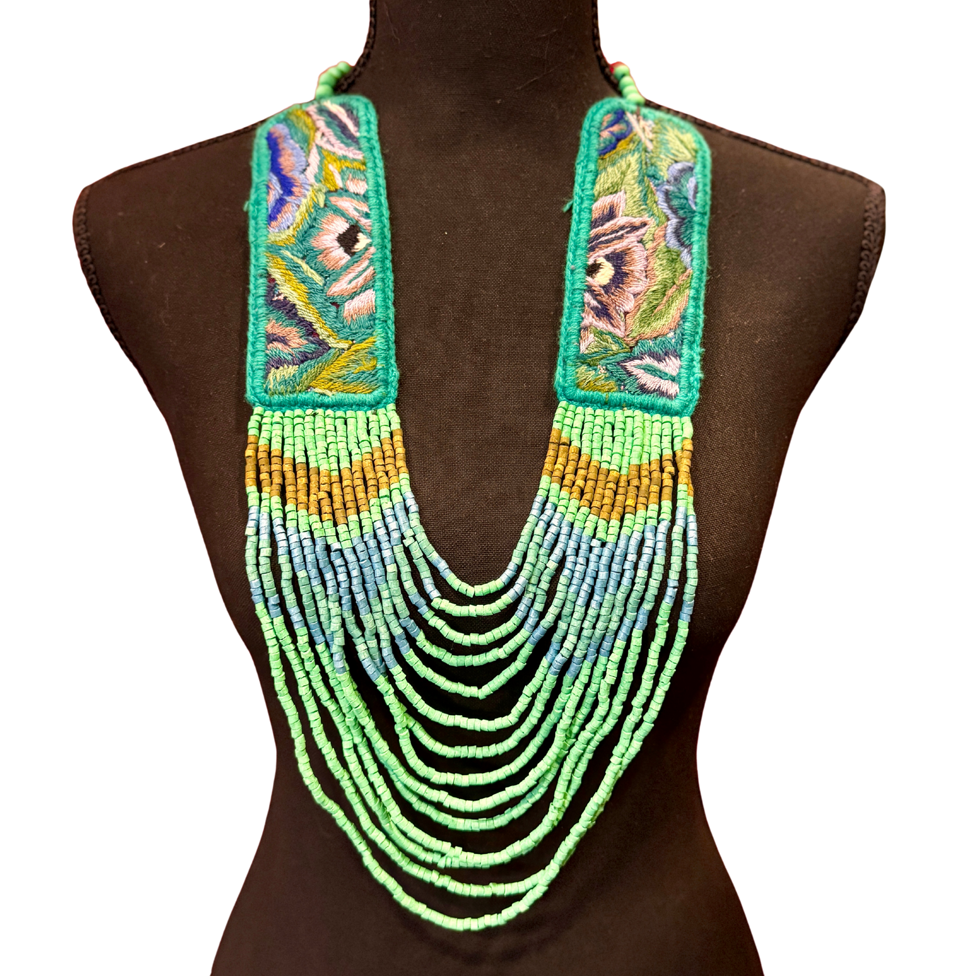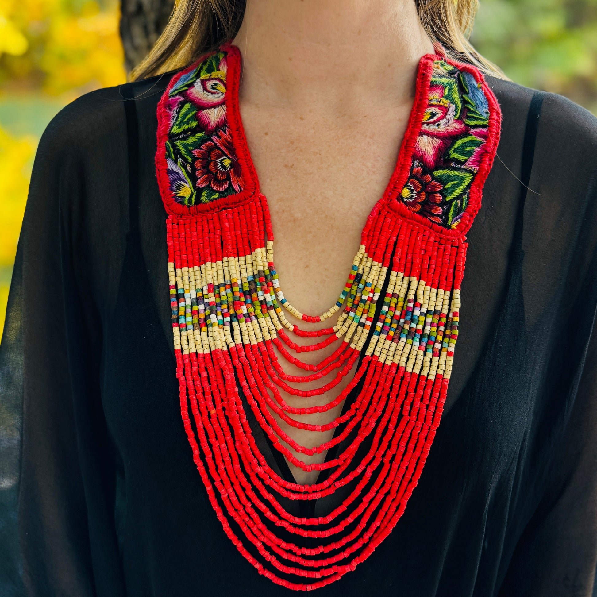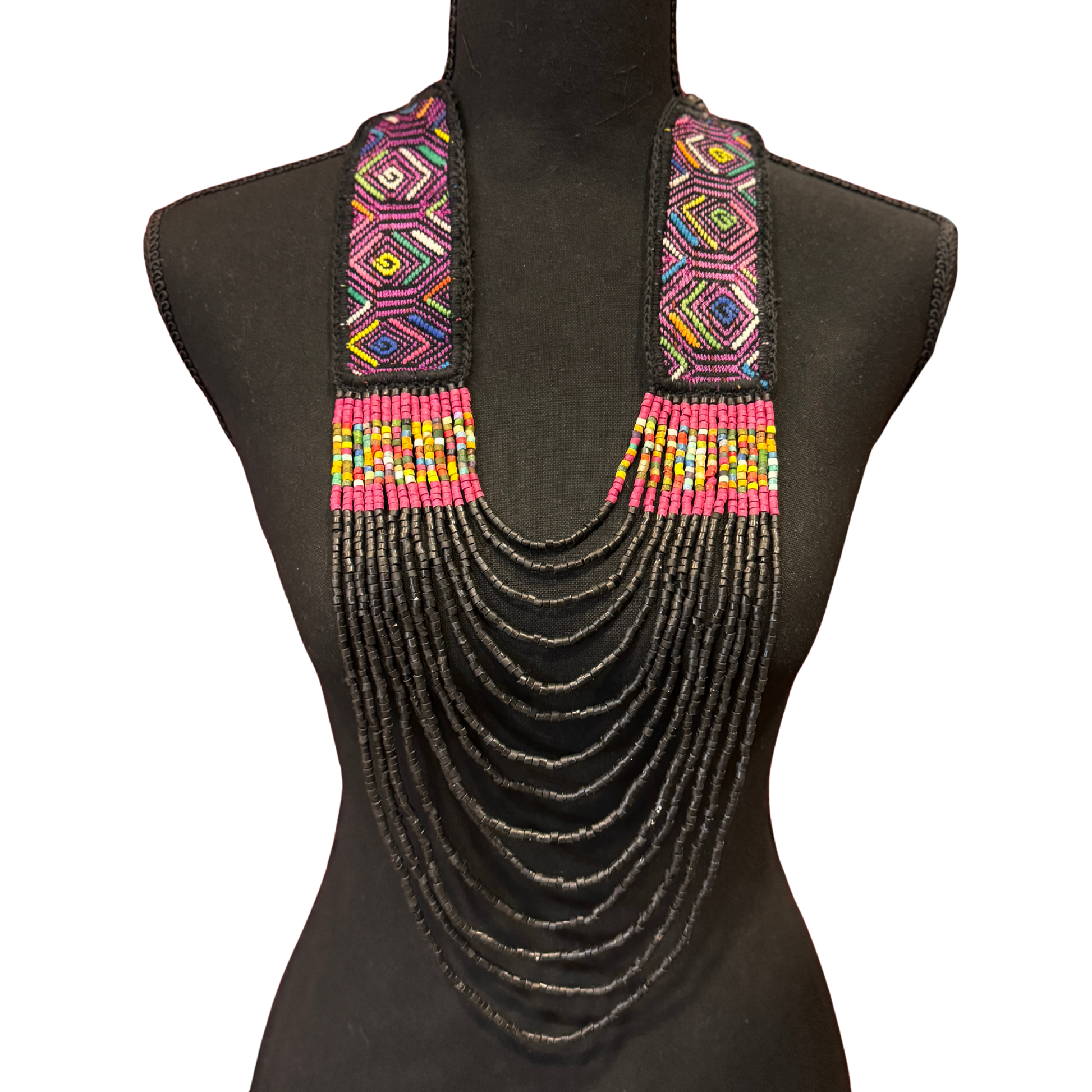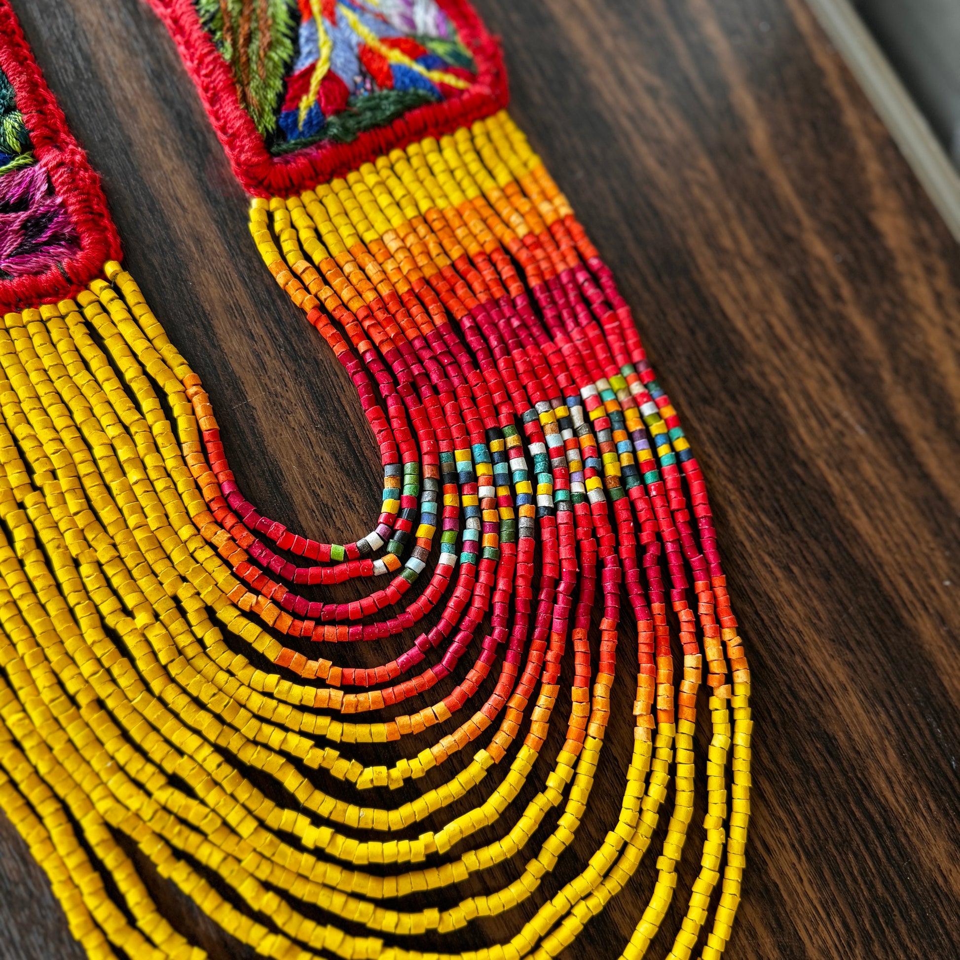Enhance your style with our handmade ceremonial necklaces, a refined blend of timeless elegance and cultural richness. Each one-of-a-kind necklace is thoughtfully crafted to highlight the intricate artistry of Guatemalan handmade jewelry, combining two stunning textiles with beaded strands in a design that truly makes this a statement piece.