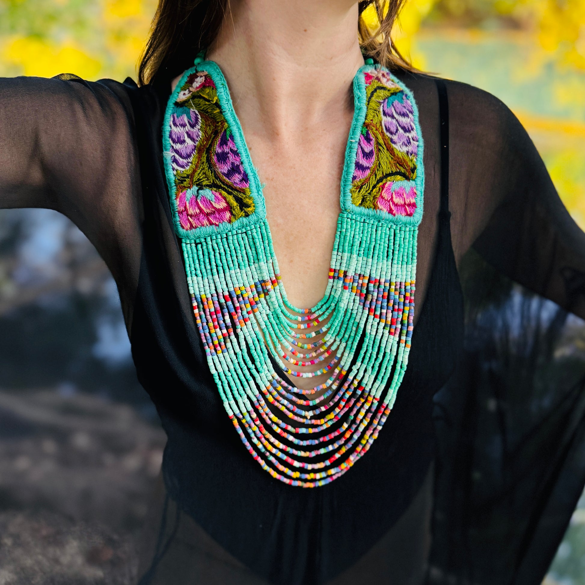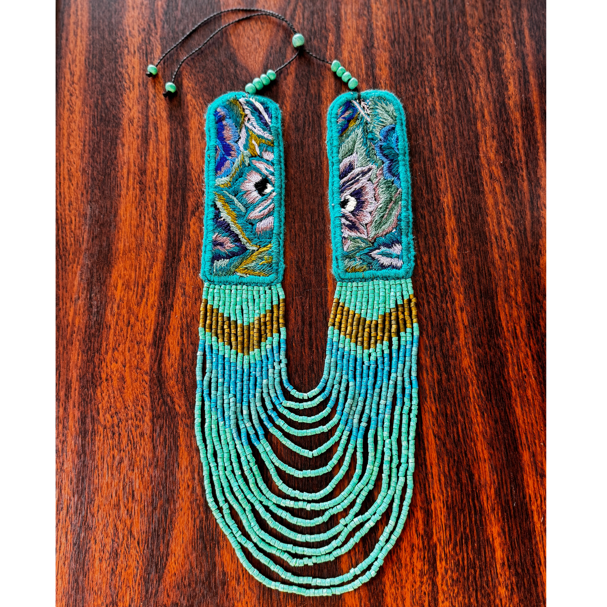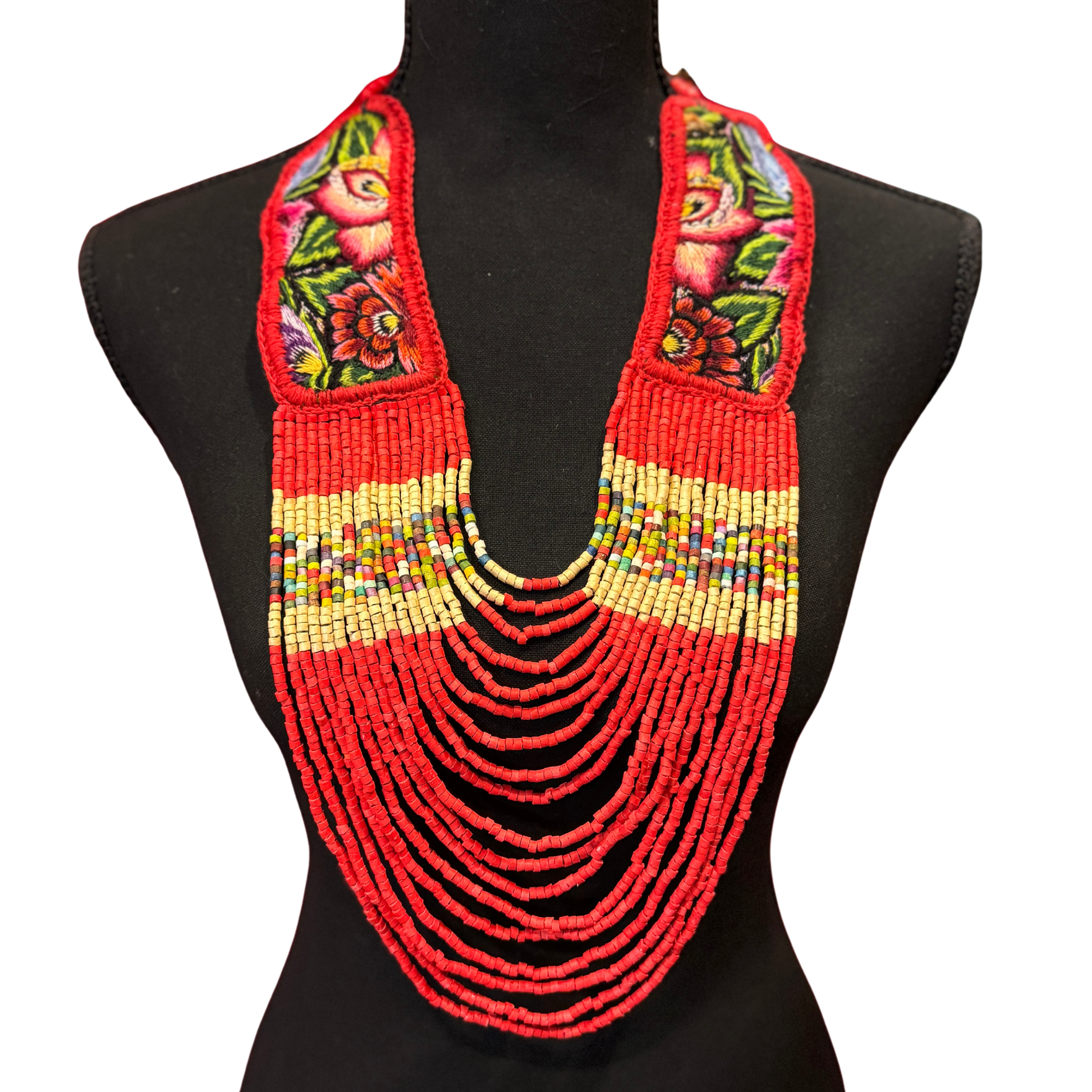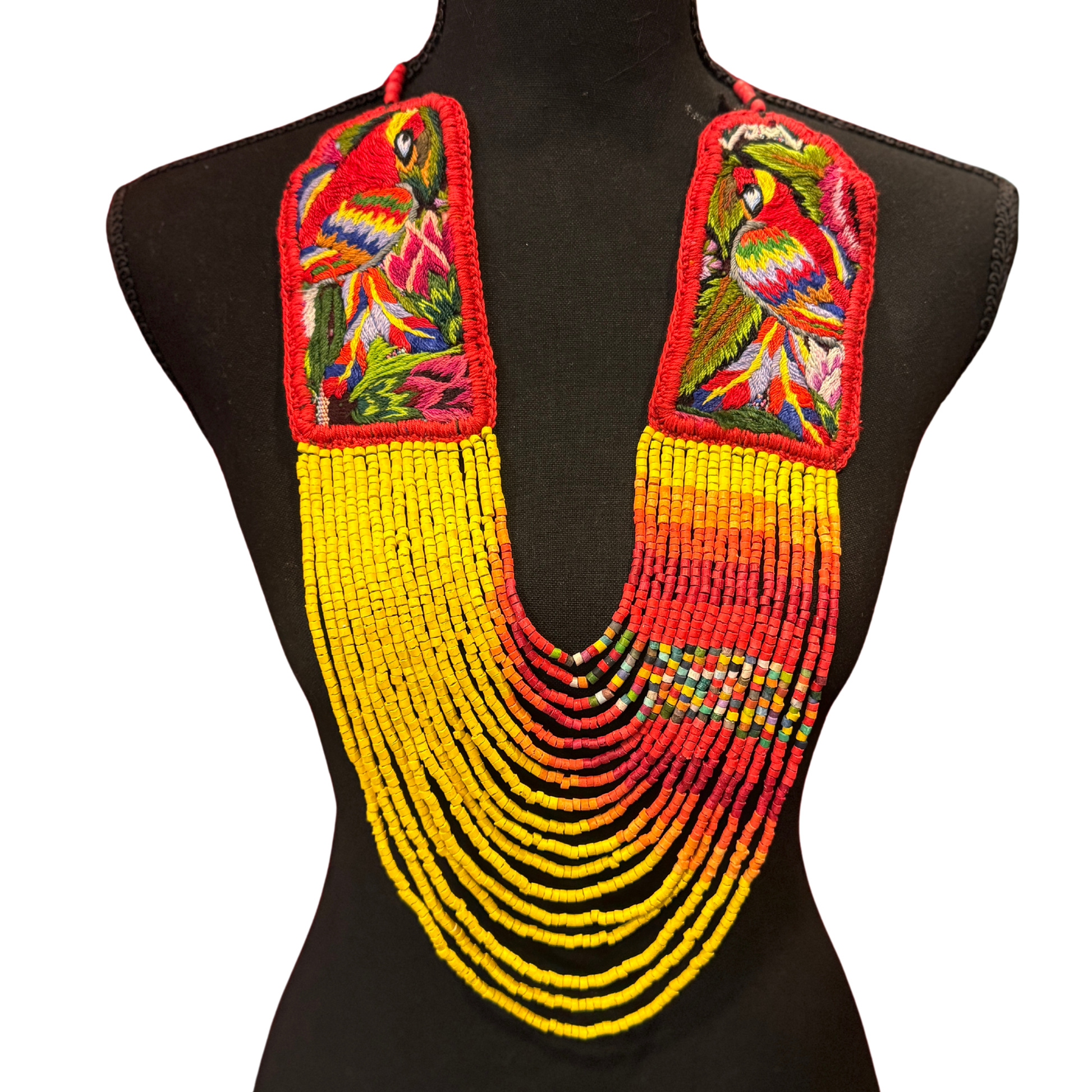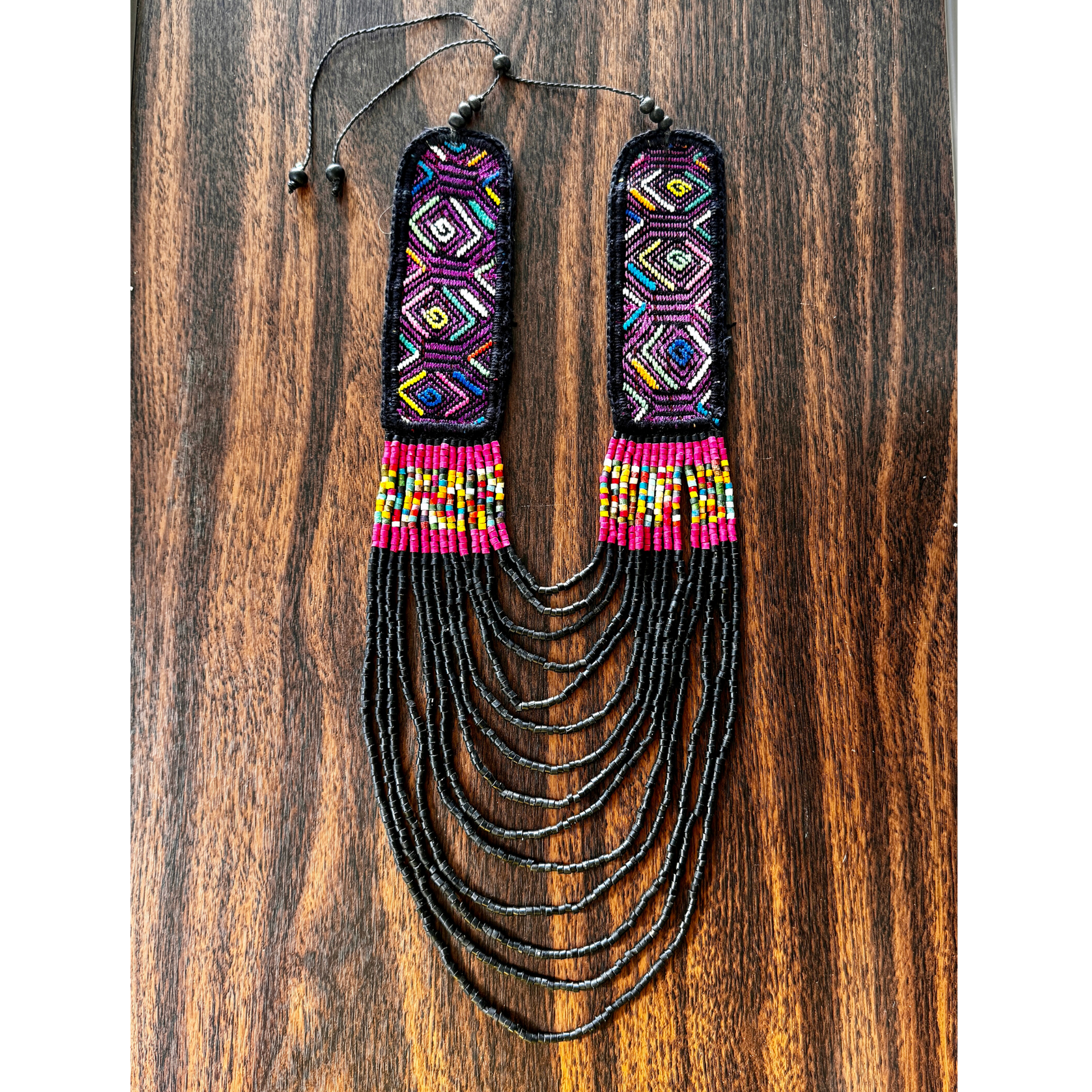 Enhance your style with our handmade ceremonial necklaces, a refined blend of timeless elegance and cultural richness. Each one-of-a-kind necklace is thoughtfully crafted to highlight the intricate artistry of Guatemalan handmade jewelry, combining two stunning textiles with beaded strands in a design that truly makes this a statement piece.