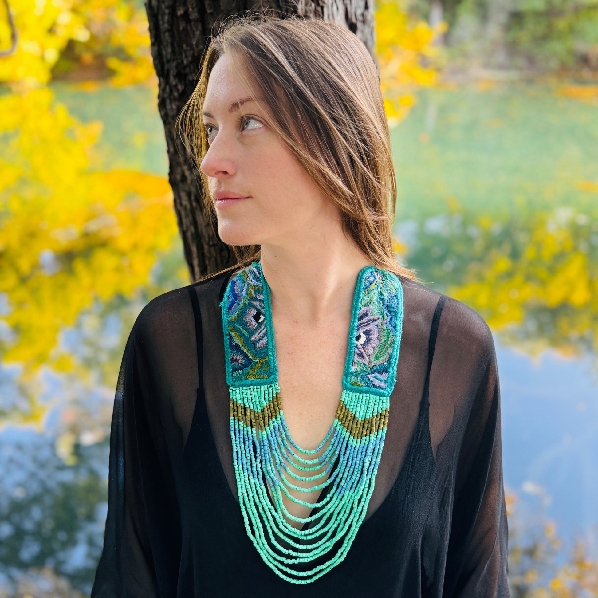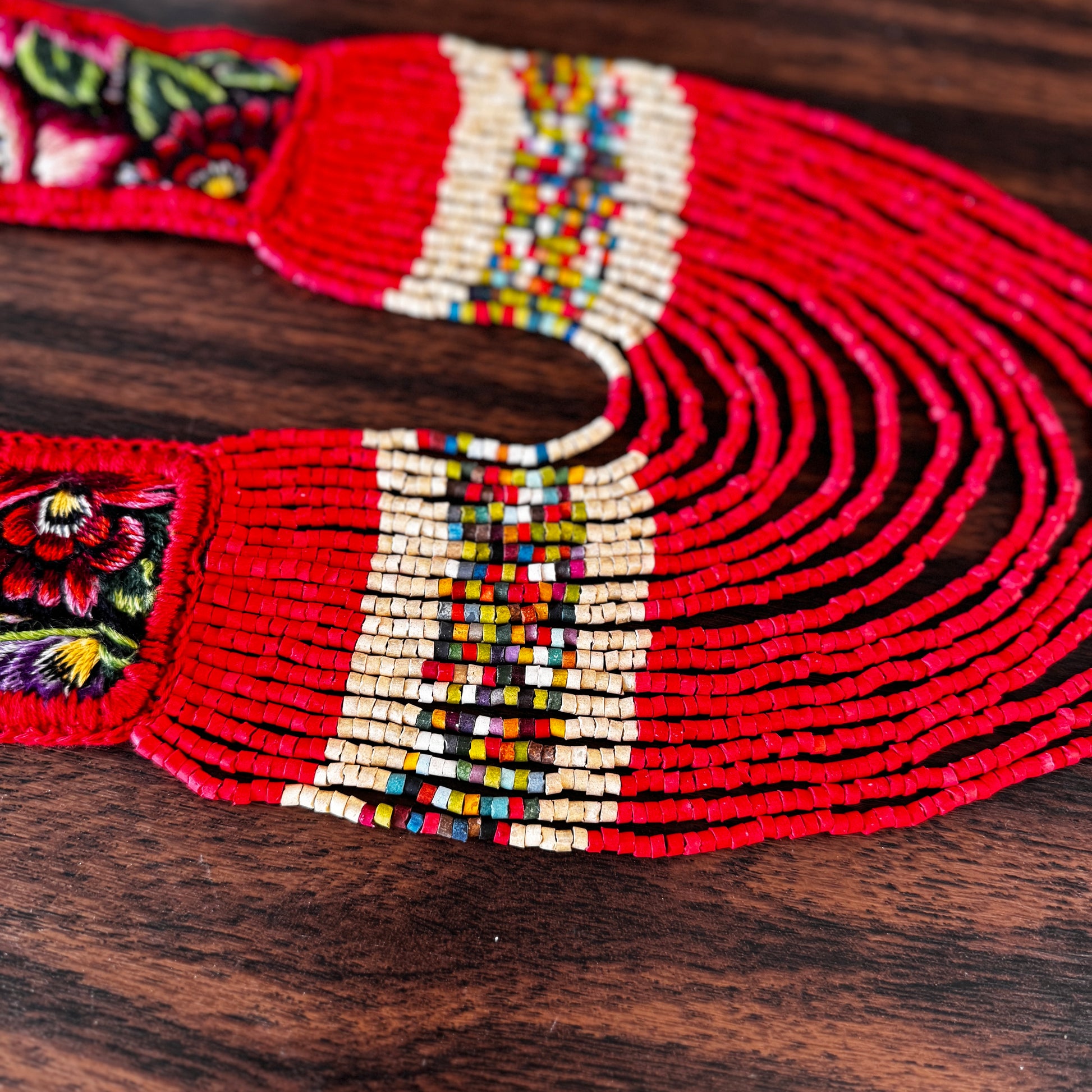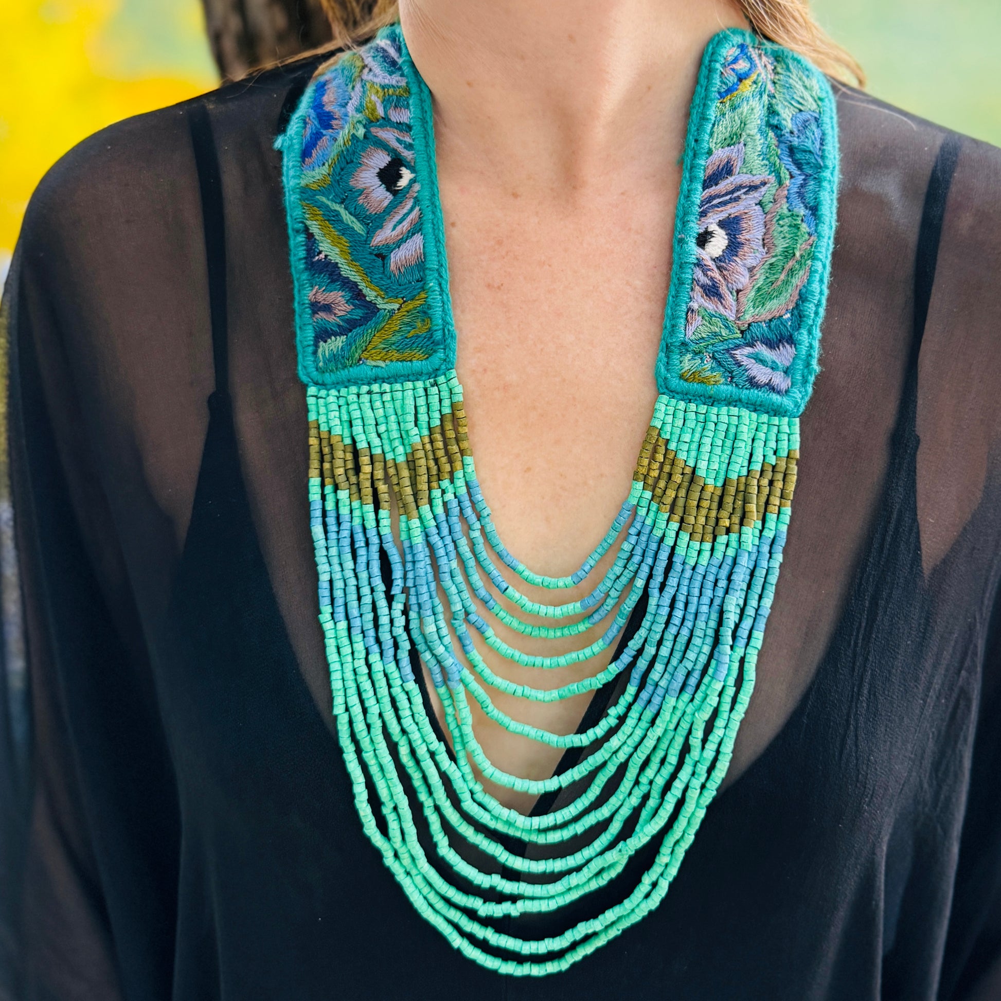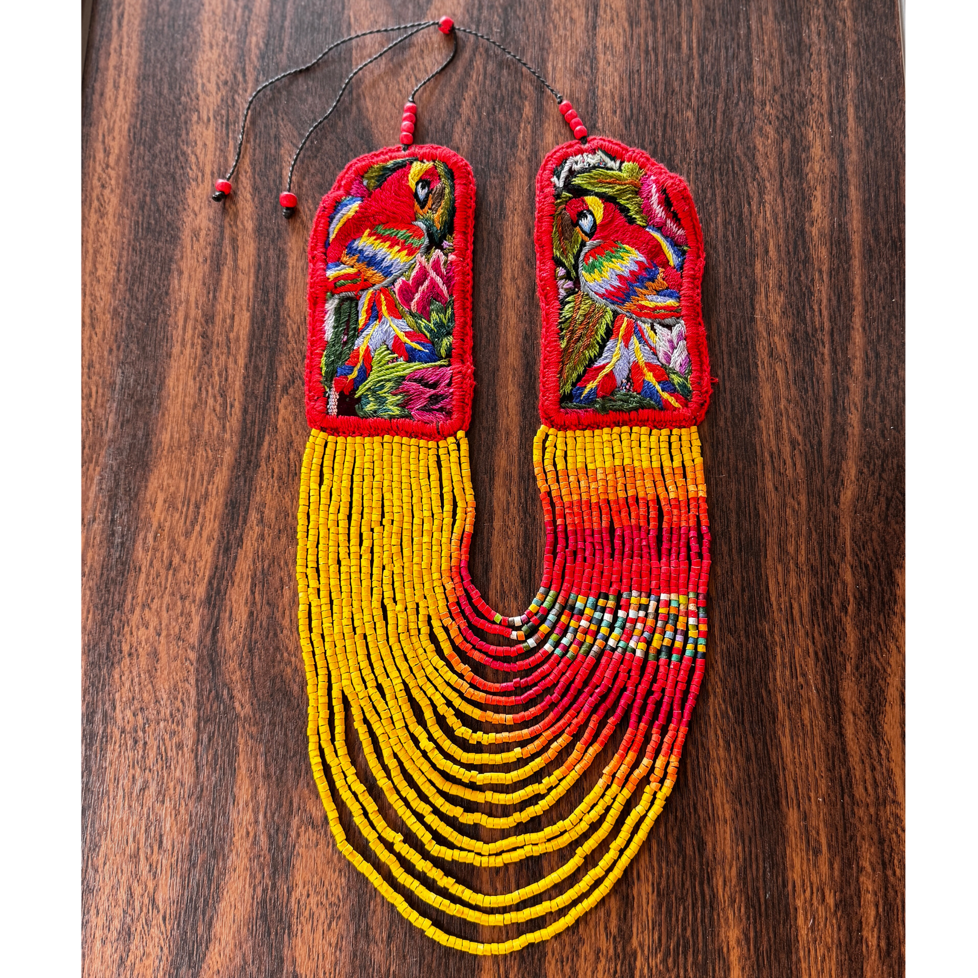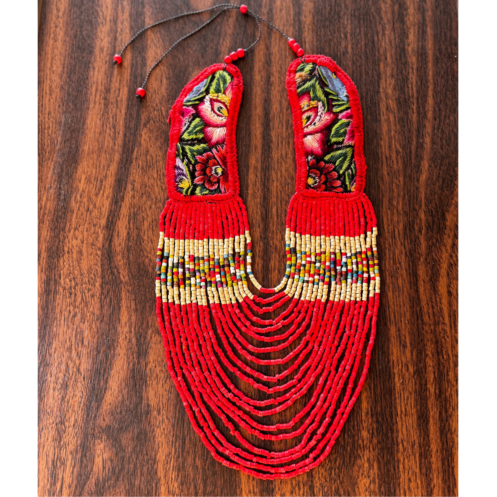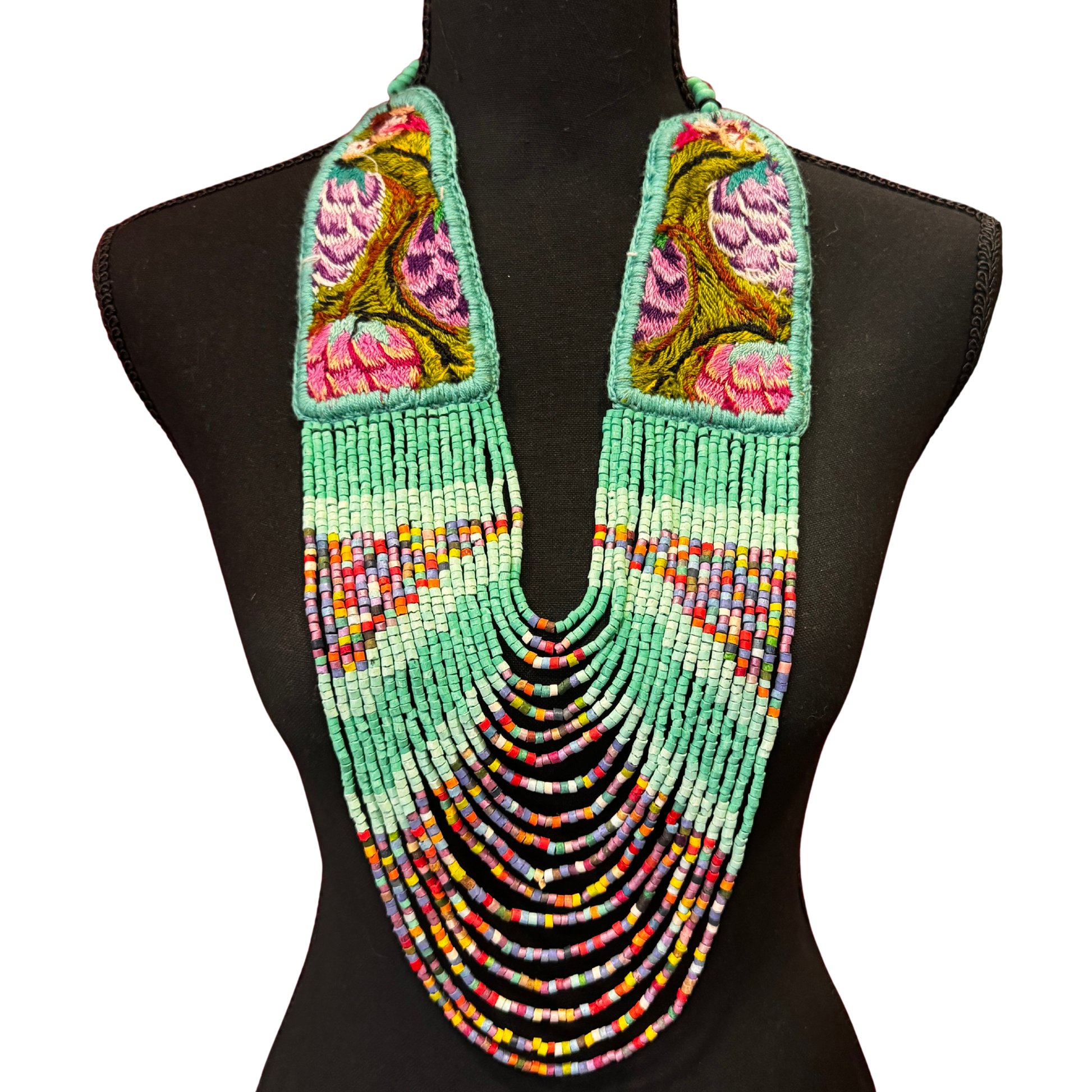 Enhance your style with our handmade ceremonial necklaces, a refined blend of timeless elegance and cultural richness. Each one-of-a-kind necklace is thoughtfully crafted to highlight the intricate artistry of Guatemalan handmade jewelry, combining two stunning textiles with beaded strands in a design that truly makes this a statement piece.