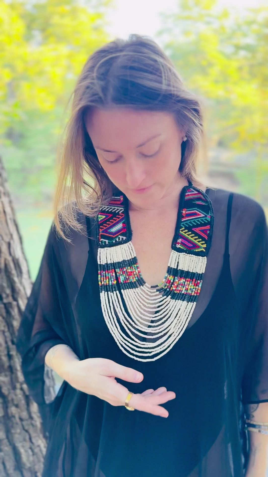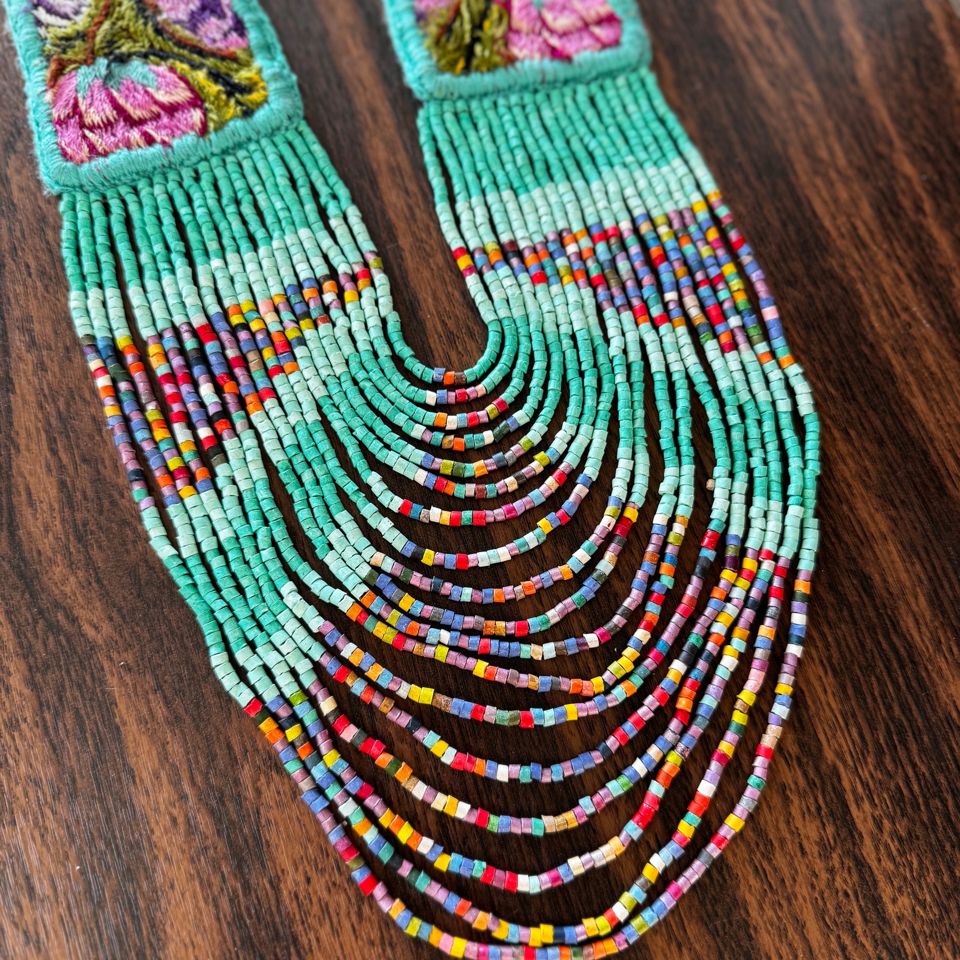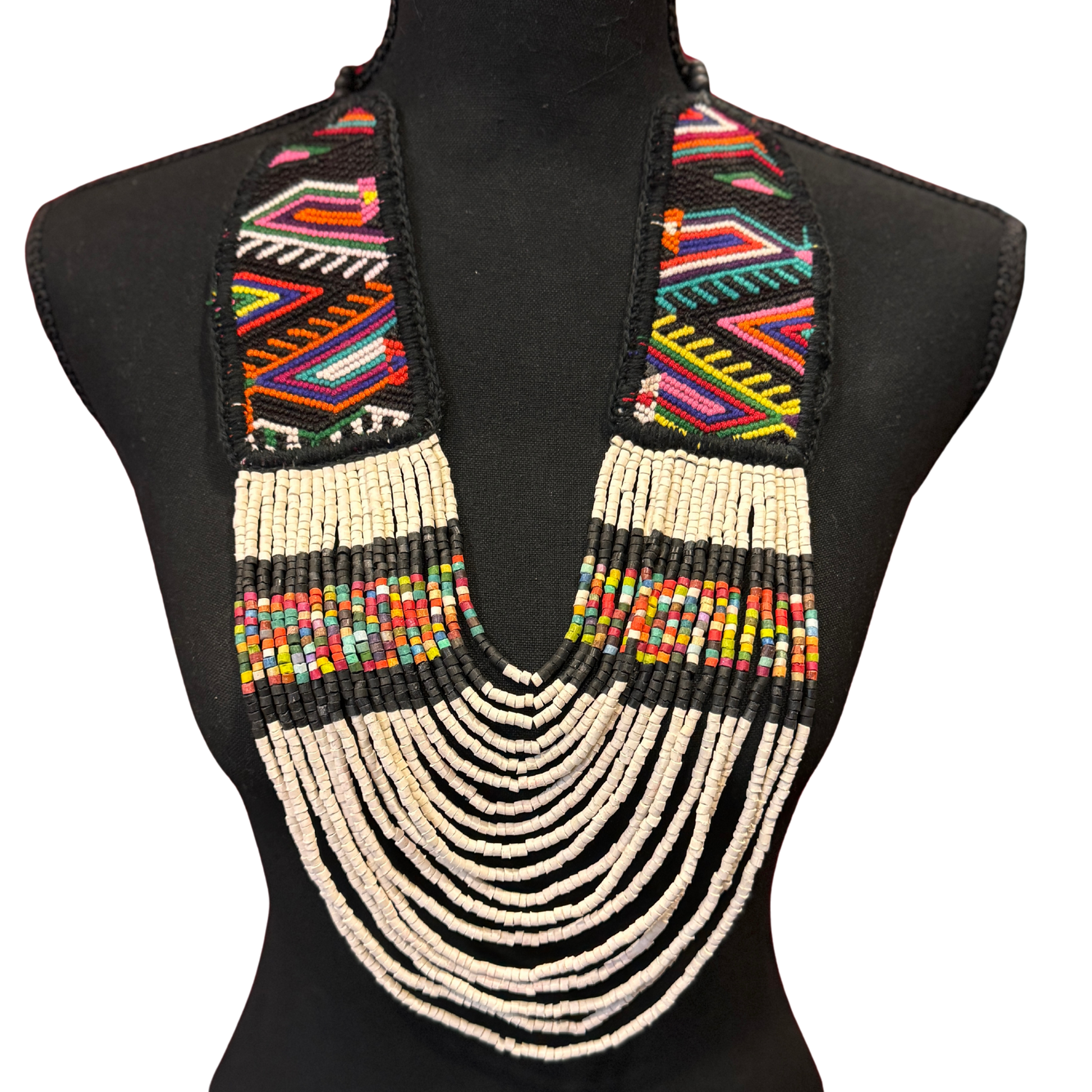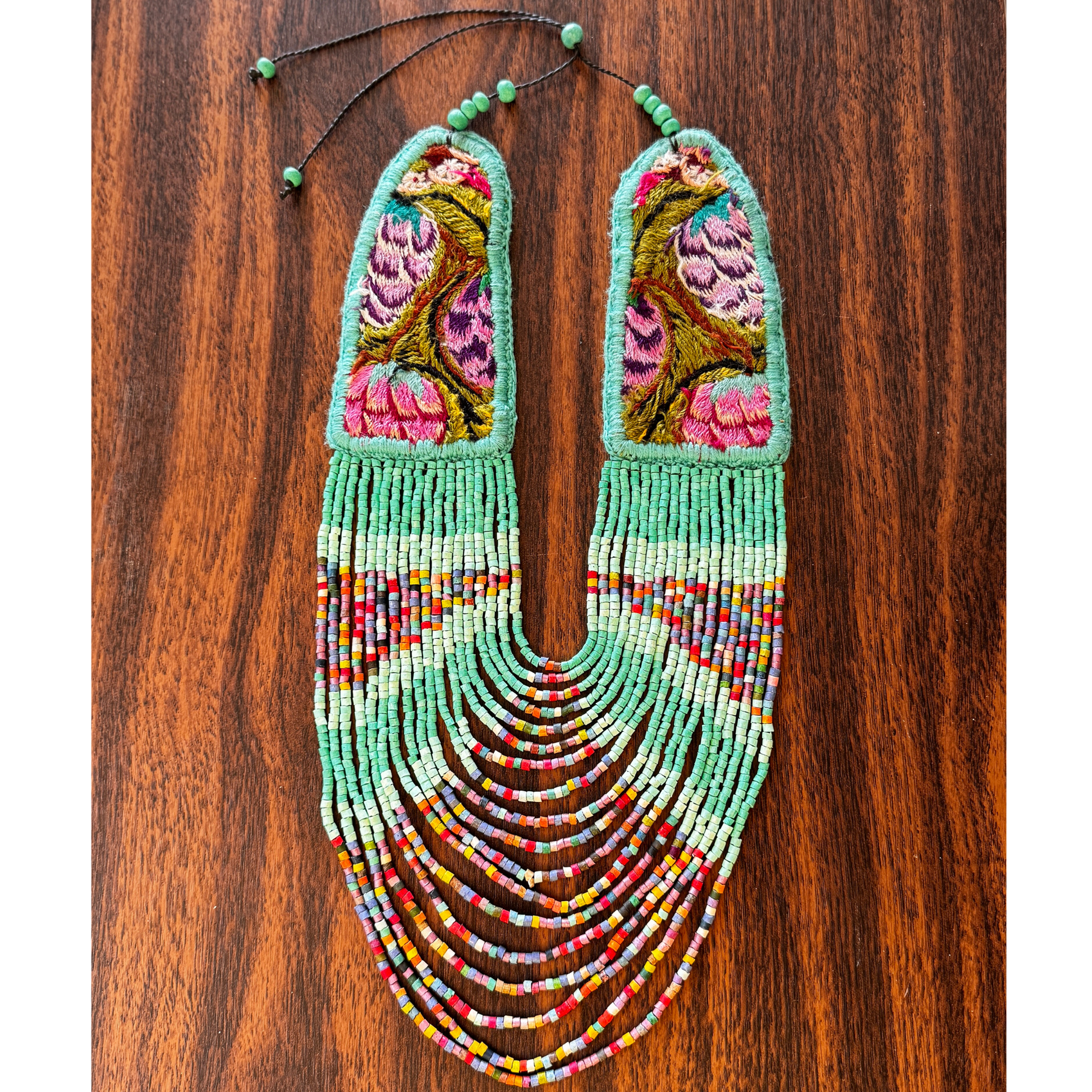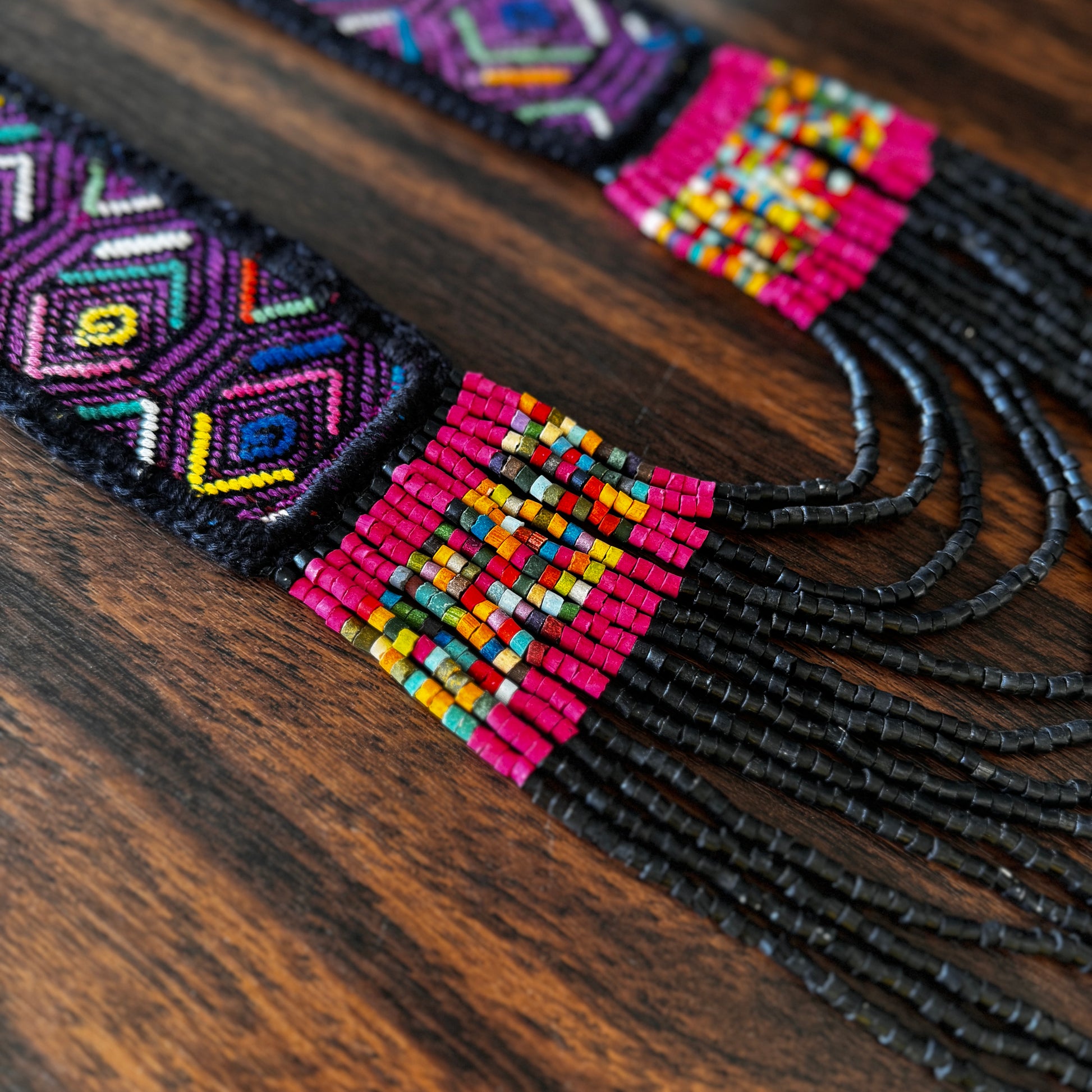 Enhance your style with our handmade ceremonial necklaces, a refined blend of timeless elegance and cultural richness. Each one-of-a-kind necklace is thoughtfully crafted to highlight the intricate artistry of Guatemalan handmade jewelry, combining two stunning textiles with beaded strands in a design that truly makes this a statement piece.