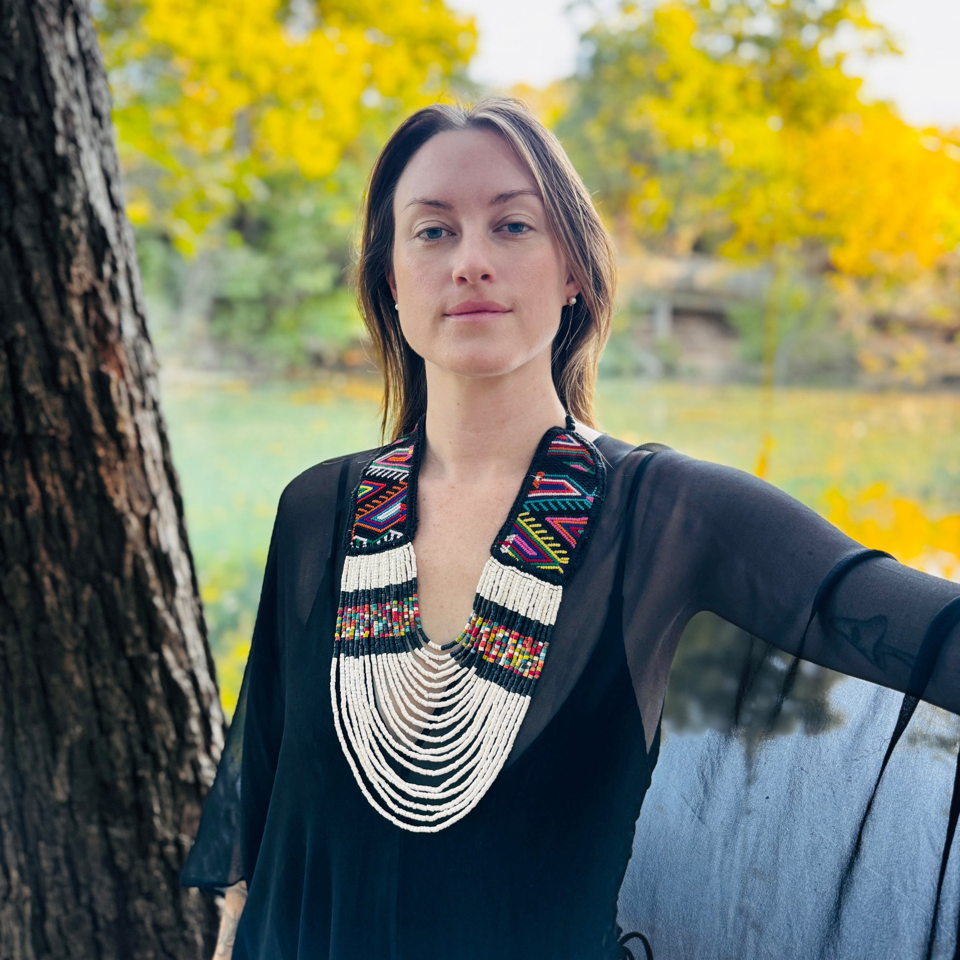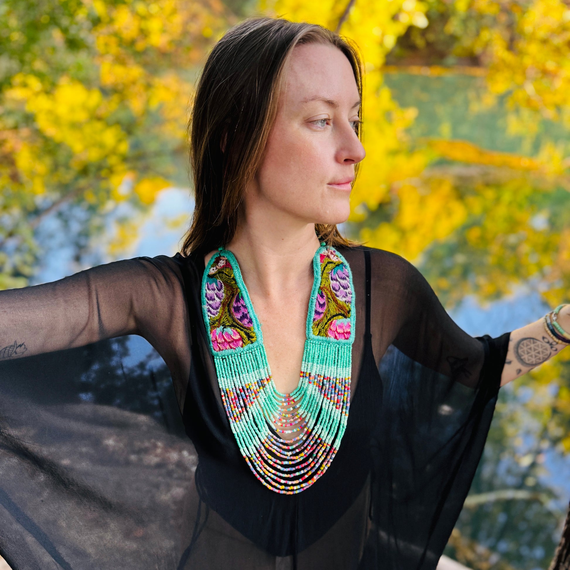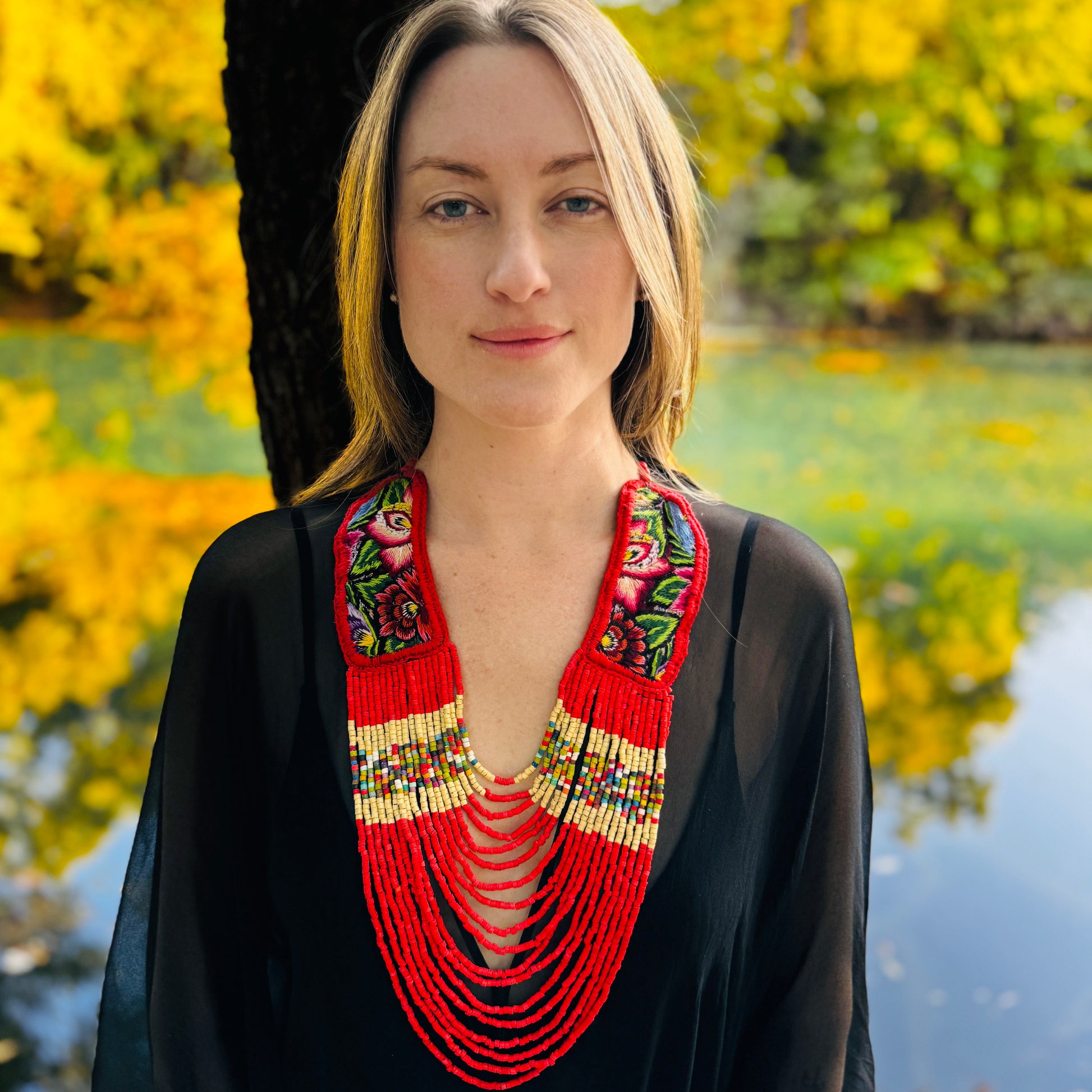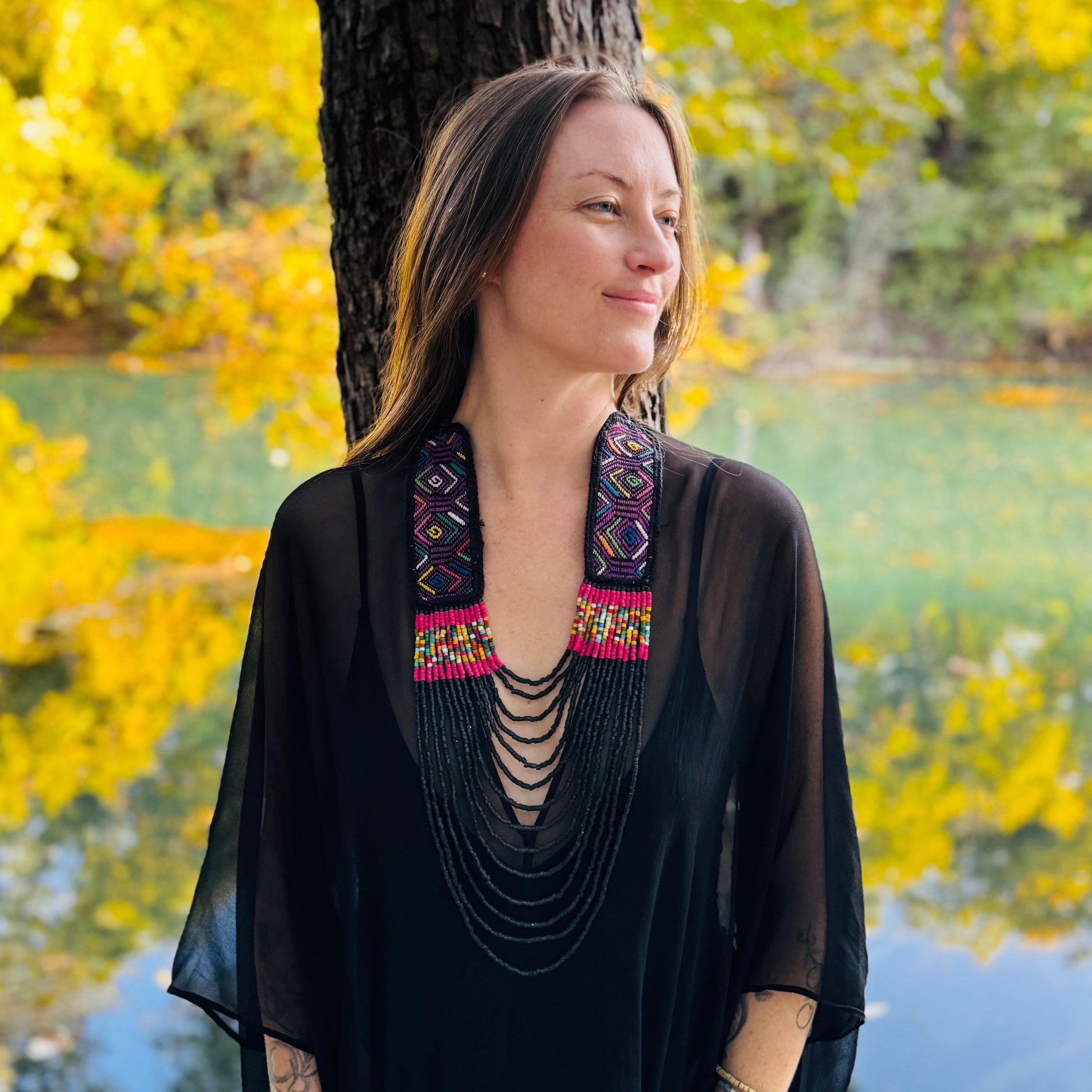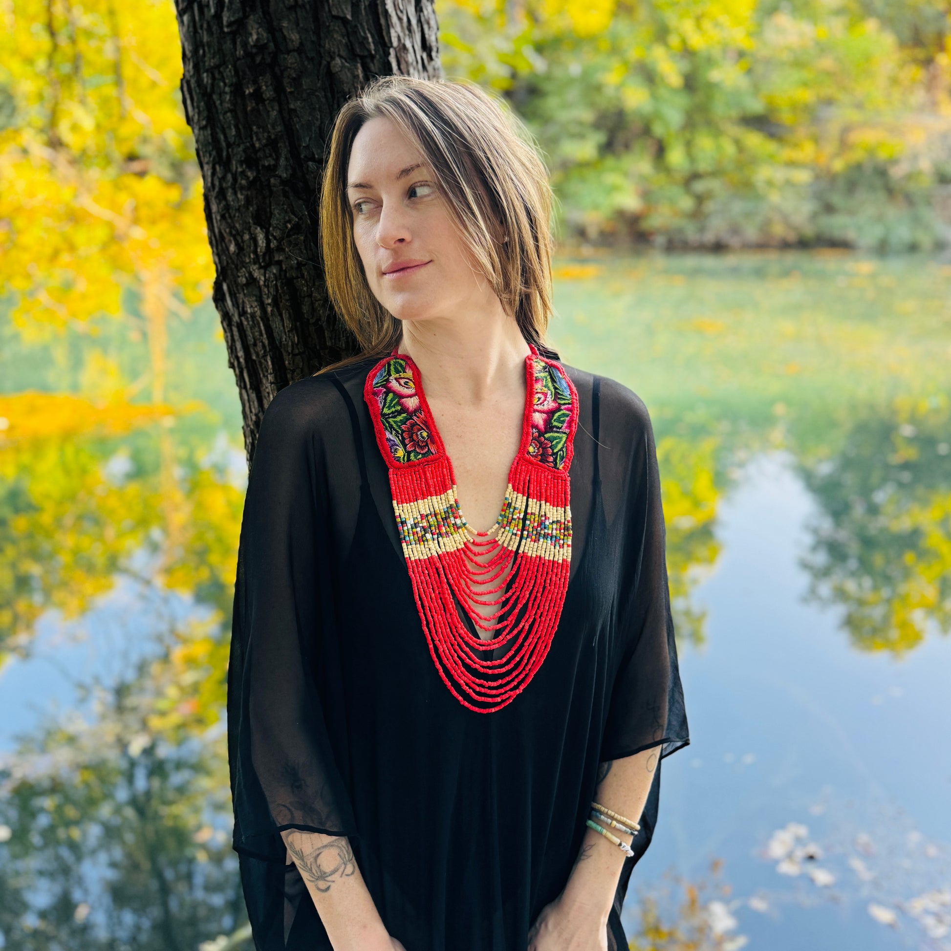 Enhance your style with our handmade ceremonial necklaces, a refined blend of timeless elegance and cultural richness. Each one-of-a-kind necklace is thoughtfully crafted to highlight the intricate artistry of Guatemalan handmade jewelry, combining two stunning textiles with beaded strands in a design that truly makes this a statement piece.