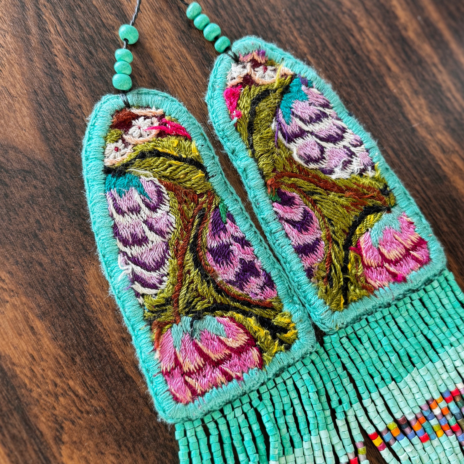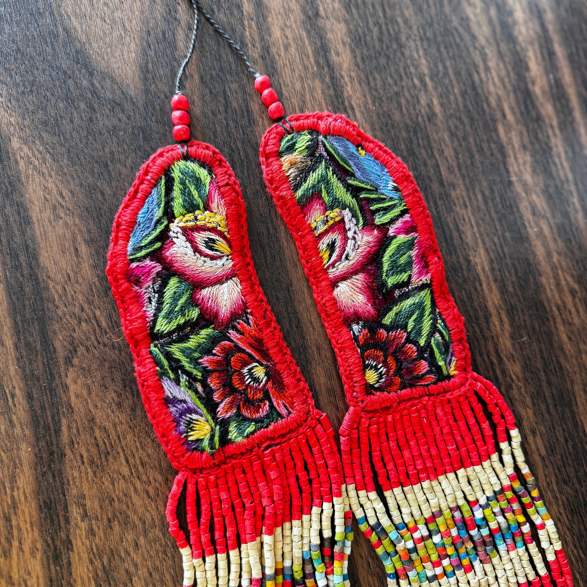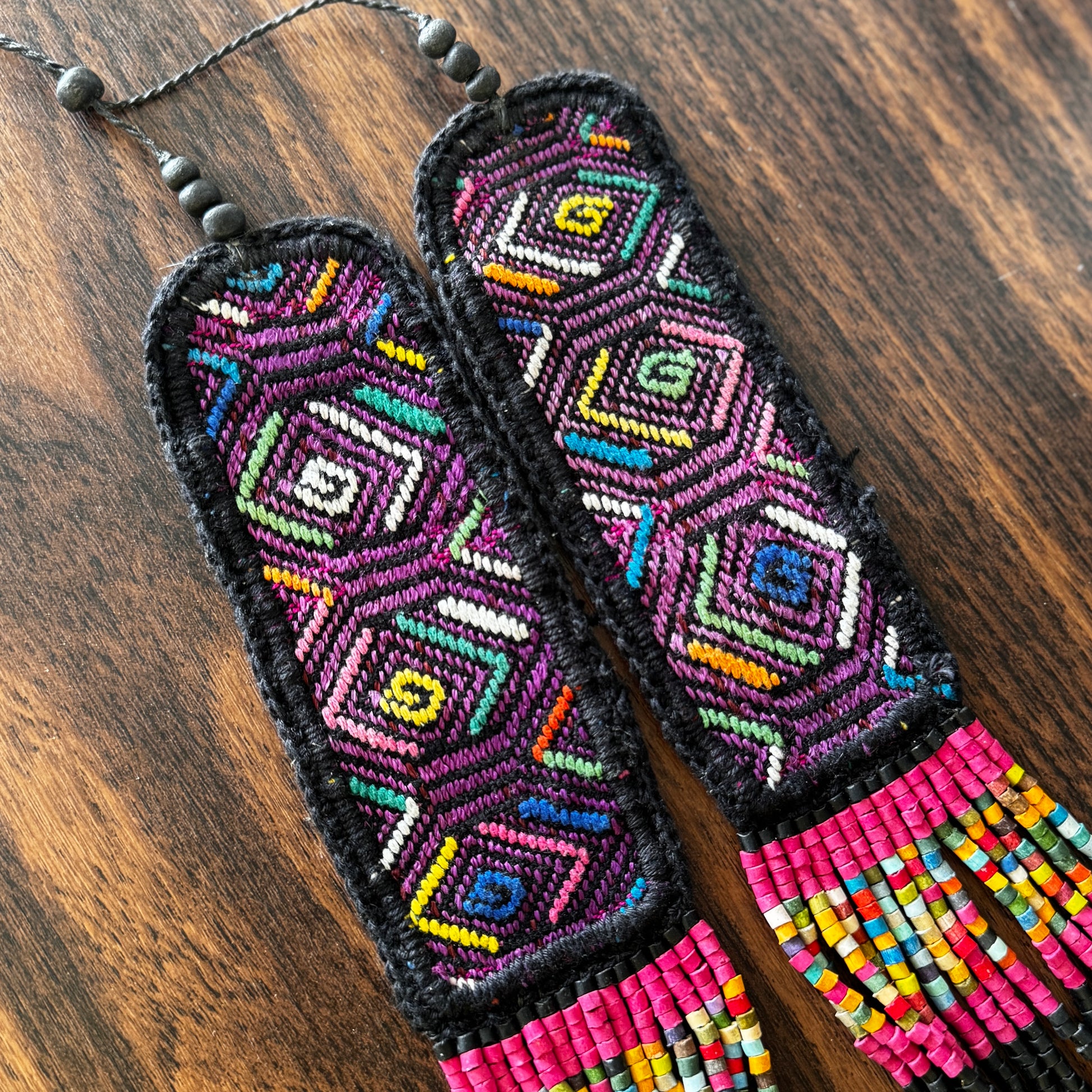 Steeped in cultural significance, this unique statement necklace has authentic, vintage textile from the town of Chichicastenango (geometric design) and Patzún (floral design). Both Mayan communities specialize in their weaving techniques and patterns.