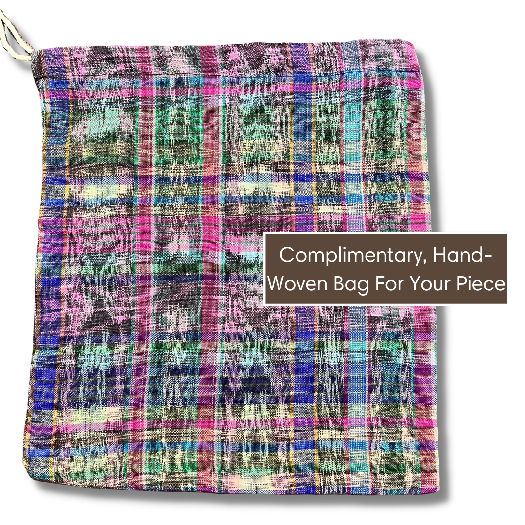 Crafted by skilled Mayan artisans, each piece comes with a handmade "tipico" bag for storage. See photos of the artisan behind your one-of-a-kind creation.