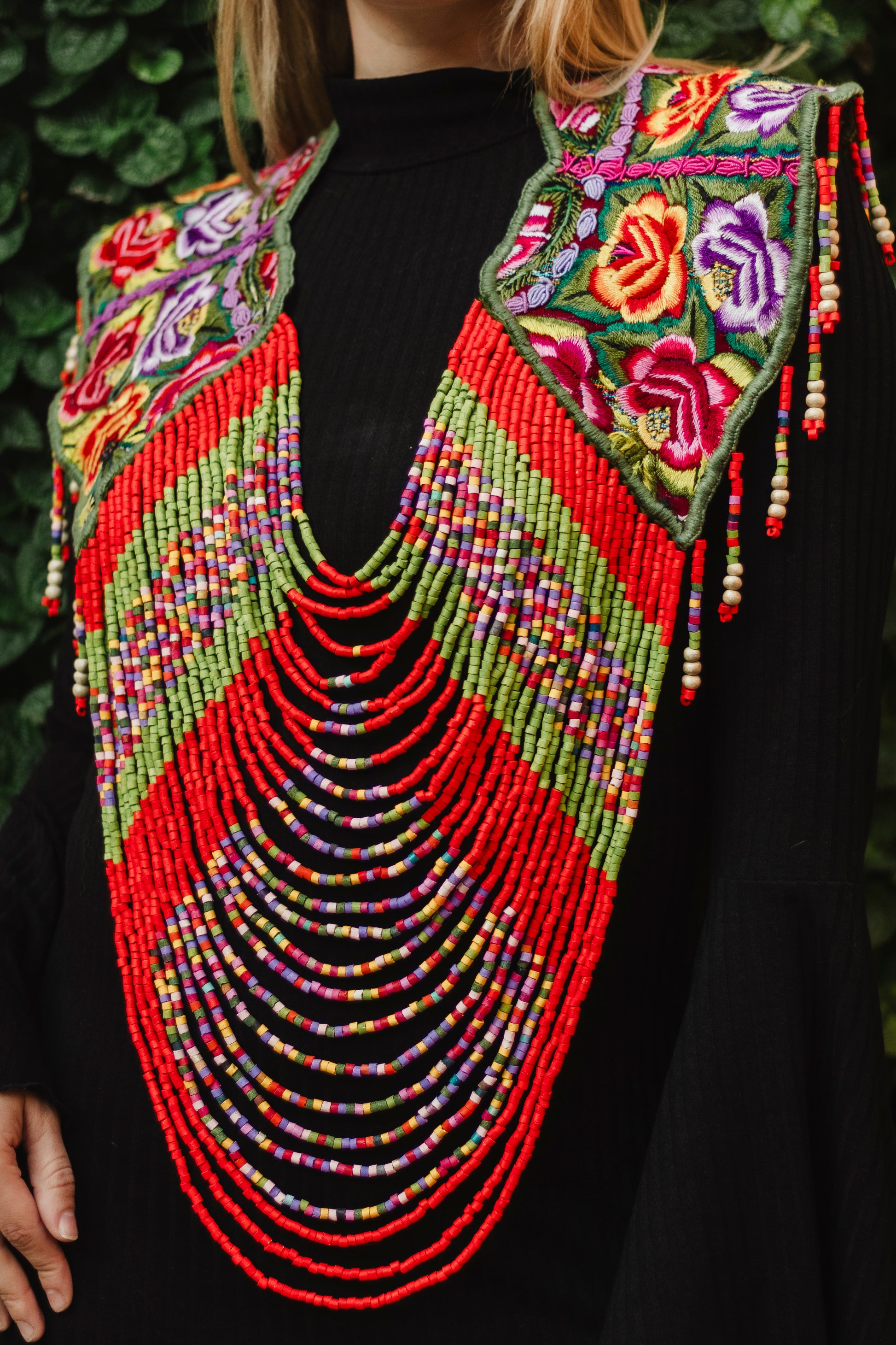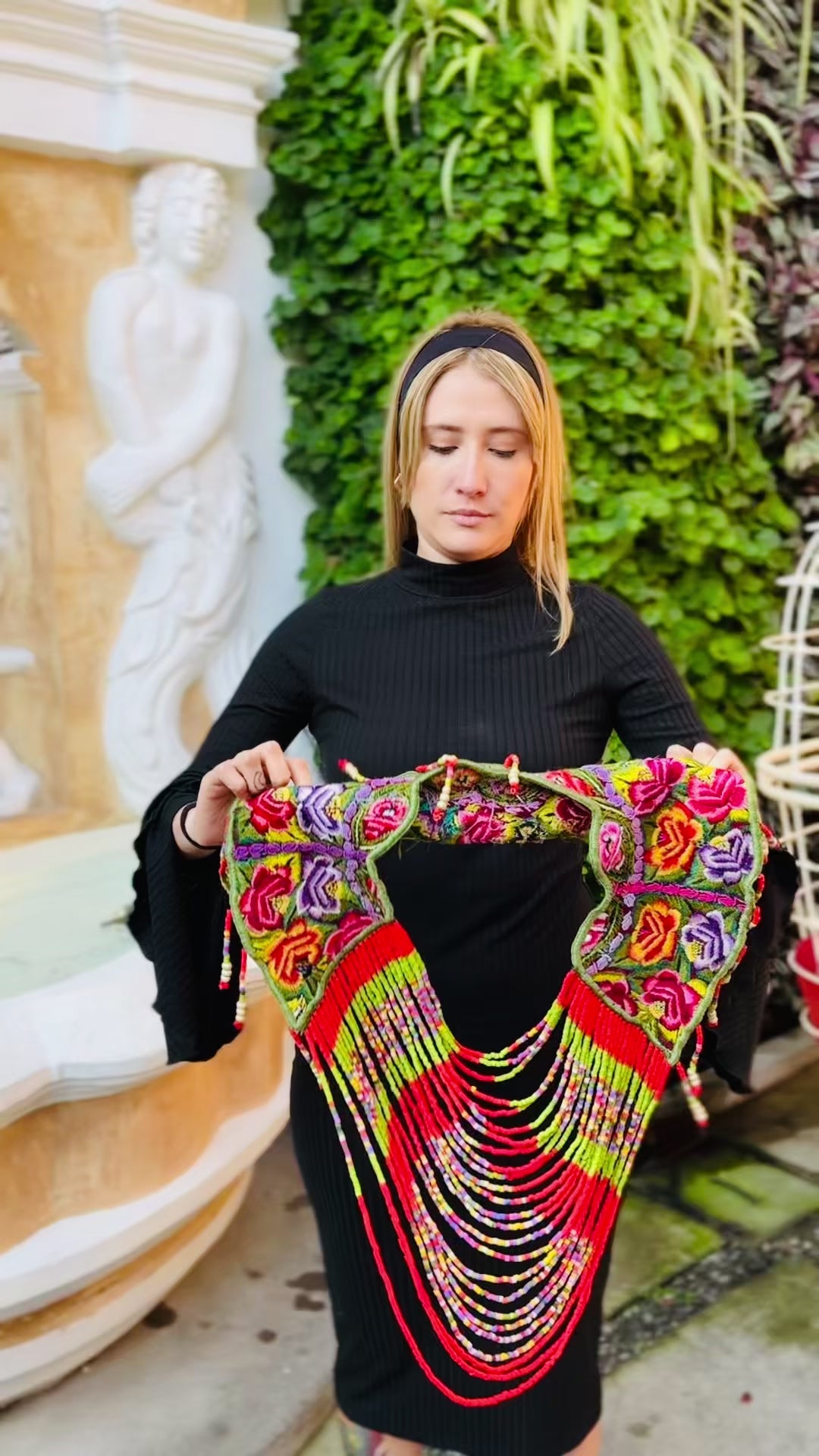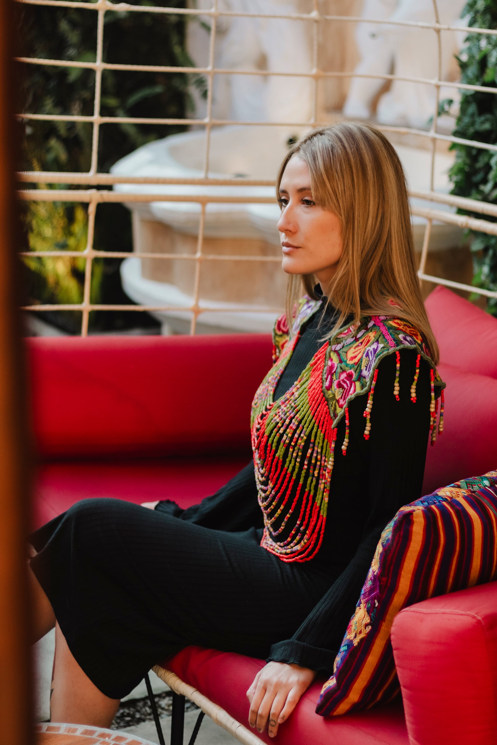 This Huipil Capa showcases hand-embroidered textiles from Patzún, near Chimaltenango, renowned for its detailed floral motifs. Our high quality crochet edge protects the exclusive, vintage textile. Delicately draped across the shoulders and adorned with our signature ceramic beads, this one-of-a-kind accessory gracefully cascades down the chest—guaranteeing all eyes on you.
