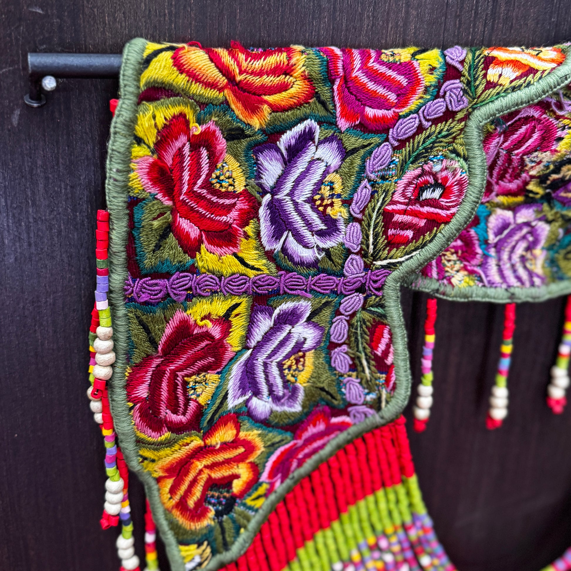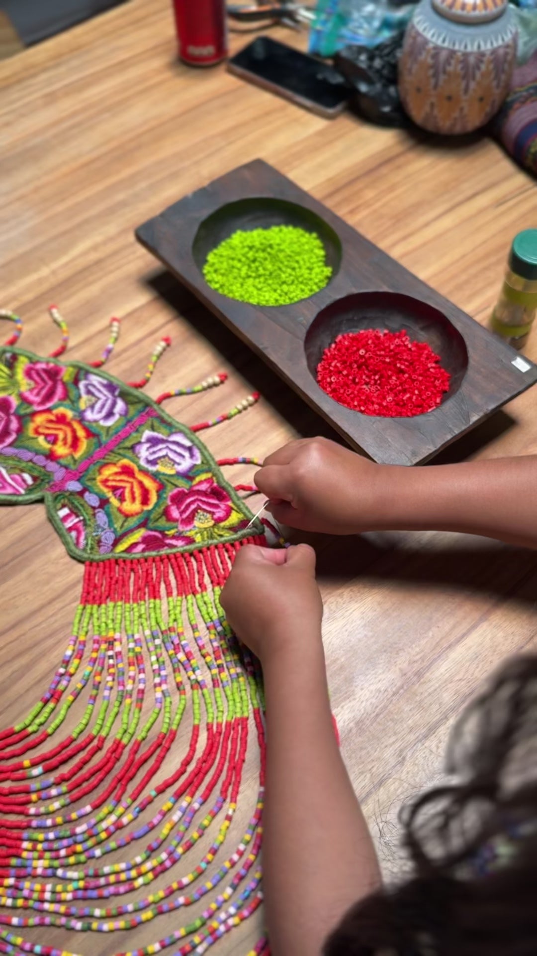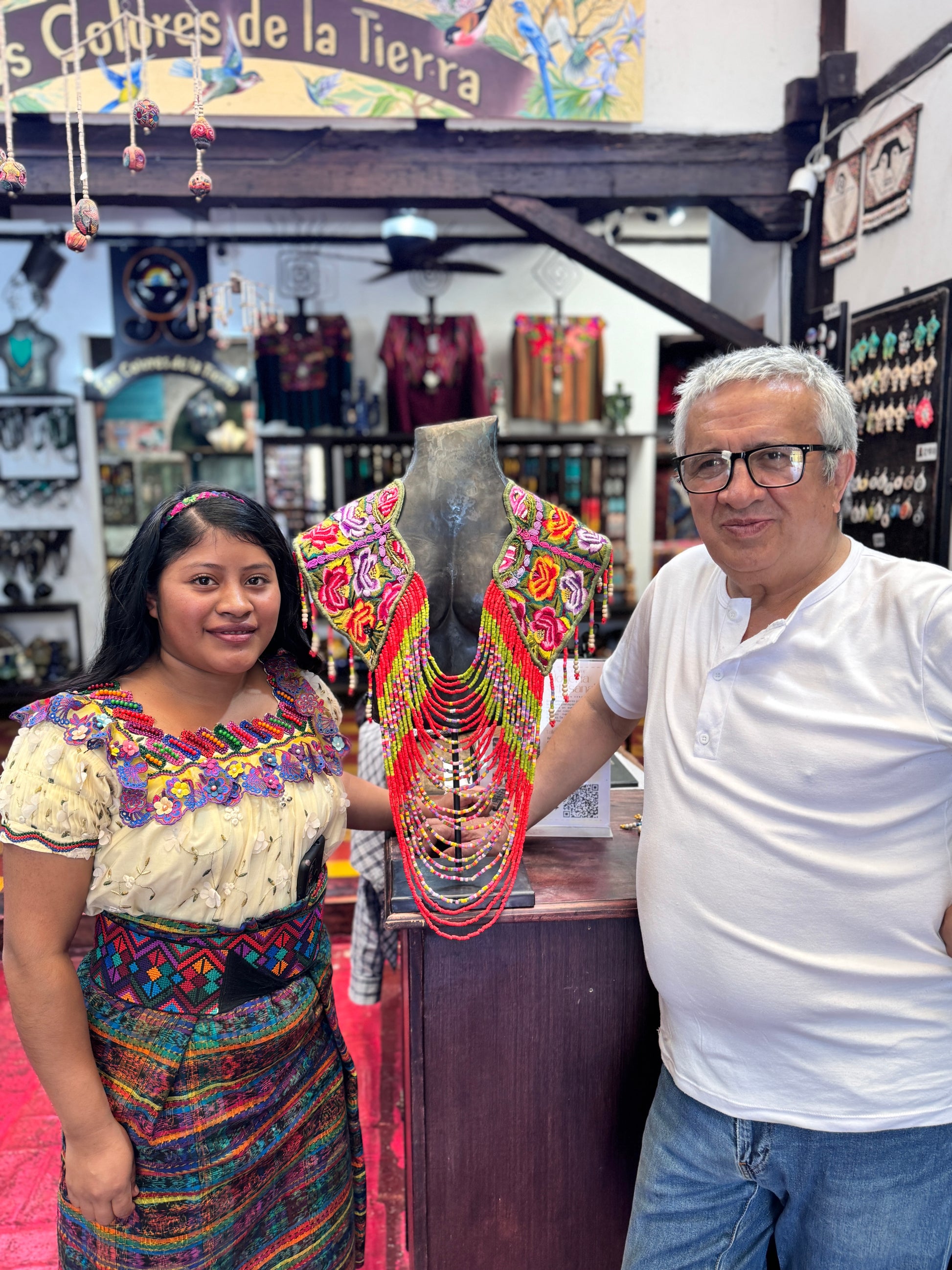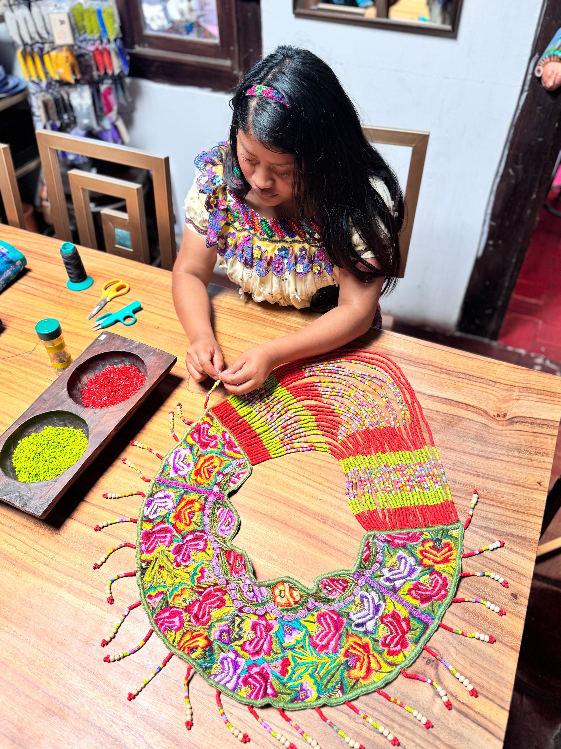 This Huipil Capa showcases hand-embroidered textiles from Patzún, near Chimaltenango, renowned for its detailed floral motifs. Our high quality crochet edge protects the exclusive, vintage textile. Delicately draped across the shoulders and adorned with our signature ceramic beads, this one-of-a-kind accessory gracefully cascades down the chest—guaranteeing all eyes on you.