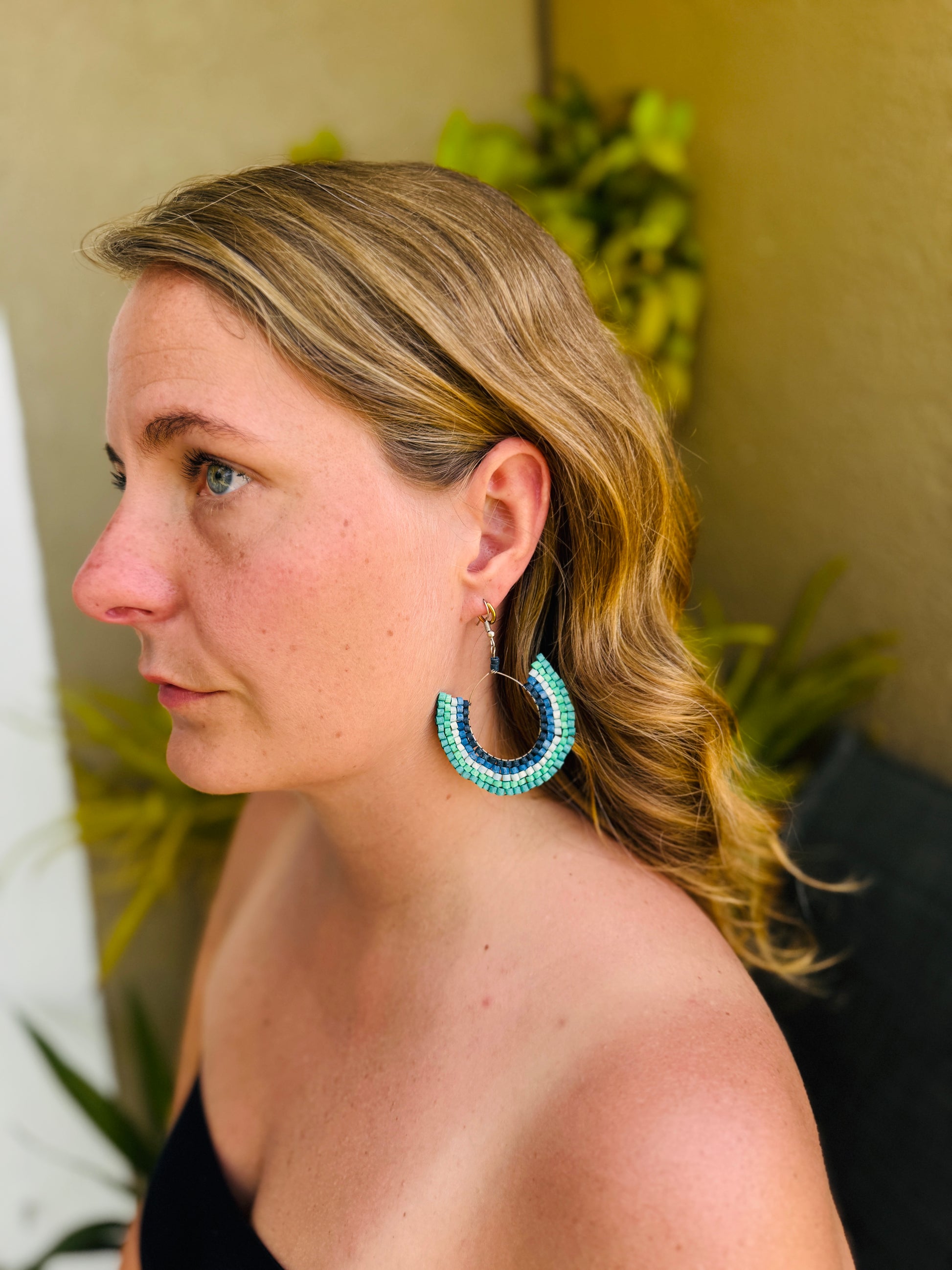 Beaded Crescent Hoop Circle Earrings in Natural Ceramic Stone
